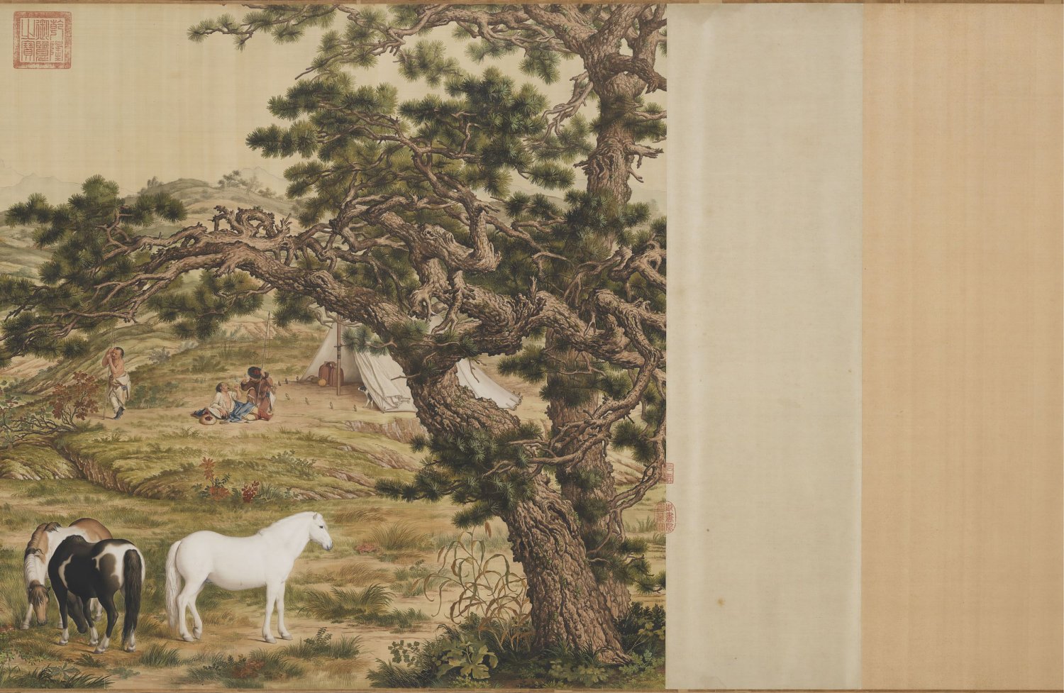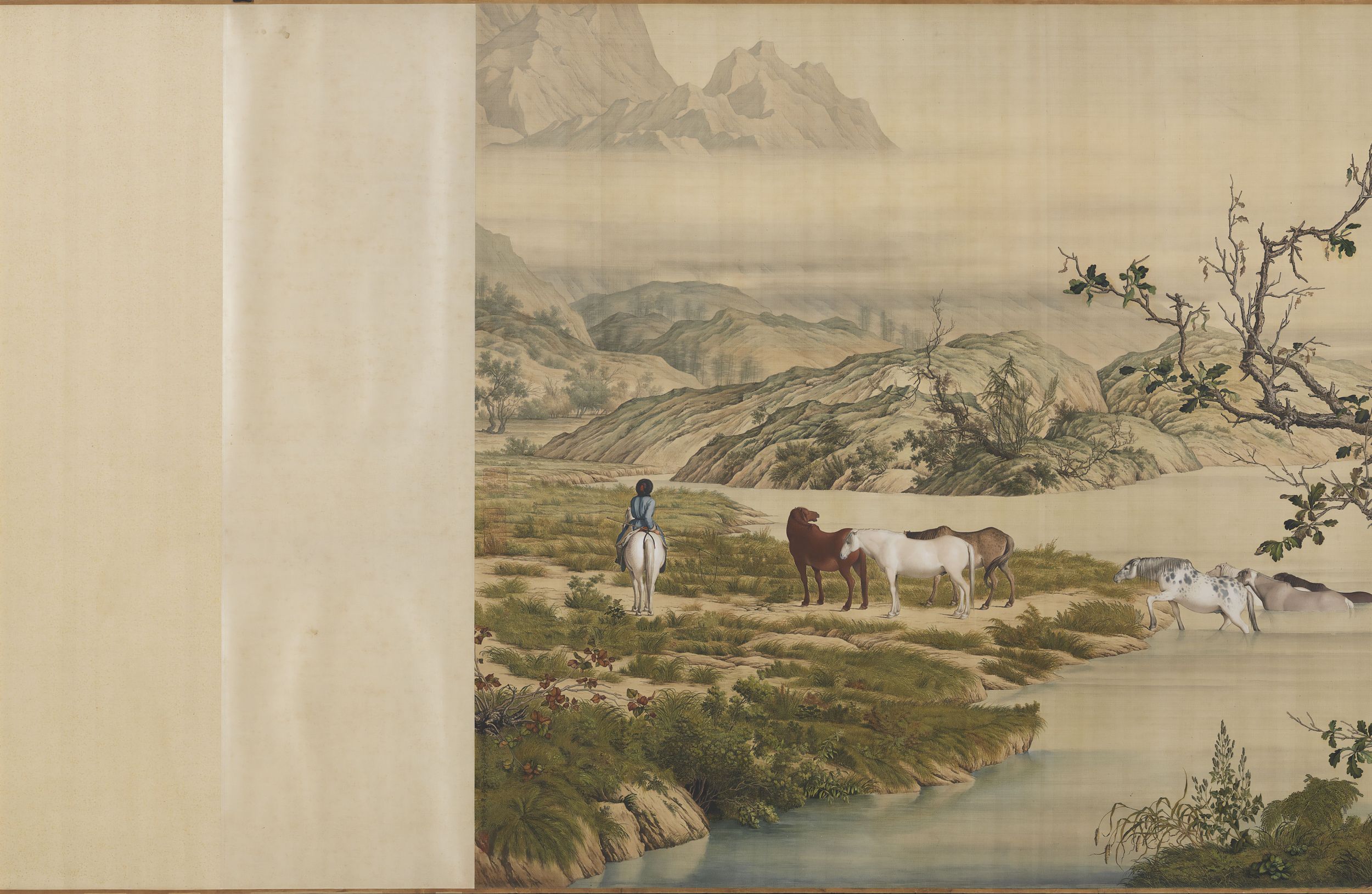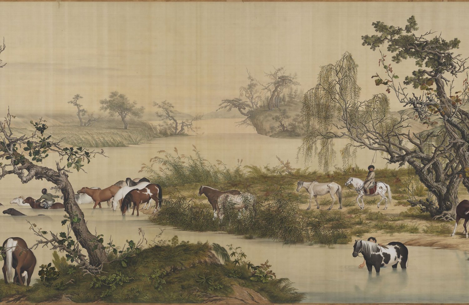 画卷由两棵占满画幅纵高的松树开启。在将近八米的横幅画面中,山水景观的地平线都维持在画卷三分之二高度位置处,将平原牧放、林间散马、河岸浴马、涉水过险以及瞭望千里河山等段落,组构成一个壮阔的牧马景观。全幅色彩浓丽,构图繁复,形象逼肖,郎氏擅以中国传统绘画技法加入西洋光影透视法及西画颜料,以呈现出中西趣味兼容并蓄的画面。如画中马匹、人物、树木、土坡皆应用了光的原理,使物象极富立体感;而如松针、树皮、草叶等的墨线勾勒,石块土坡的皴擦等仍沿袭了中国传统技法,即使是马匹及树干上的阴影表现,也是以中国传统的渲染方法来完成。