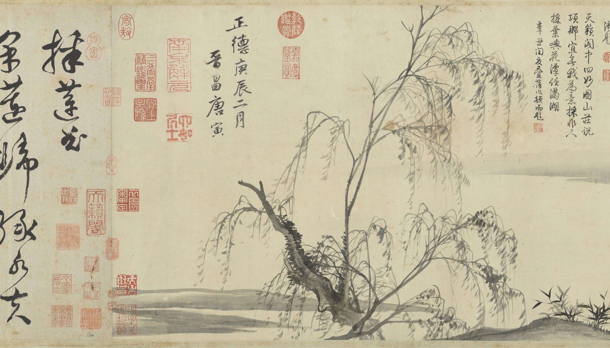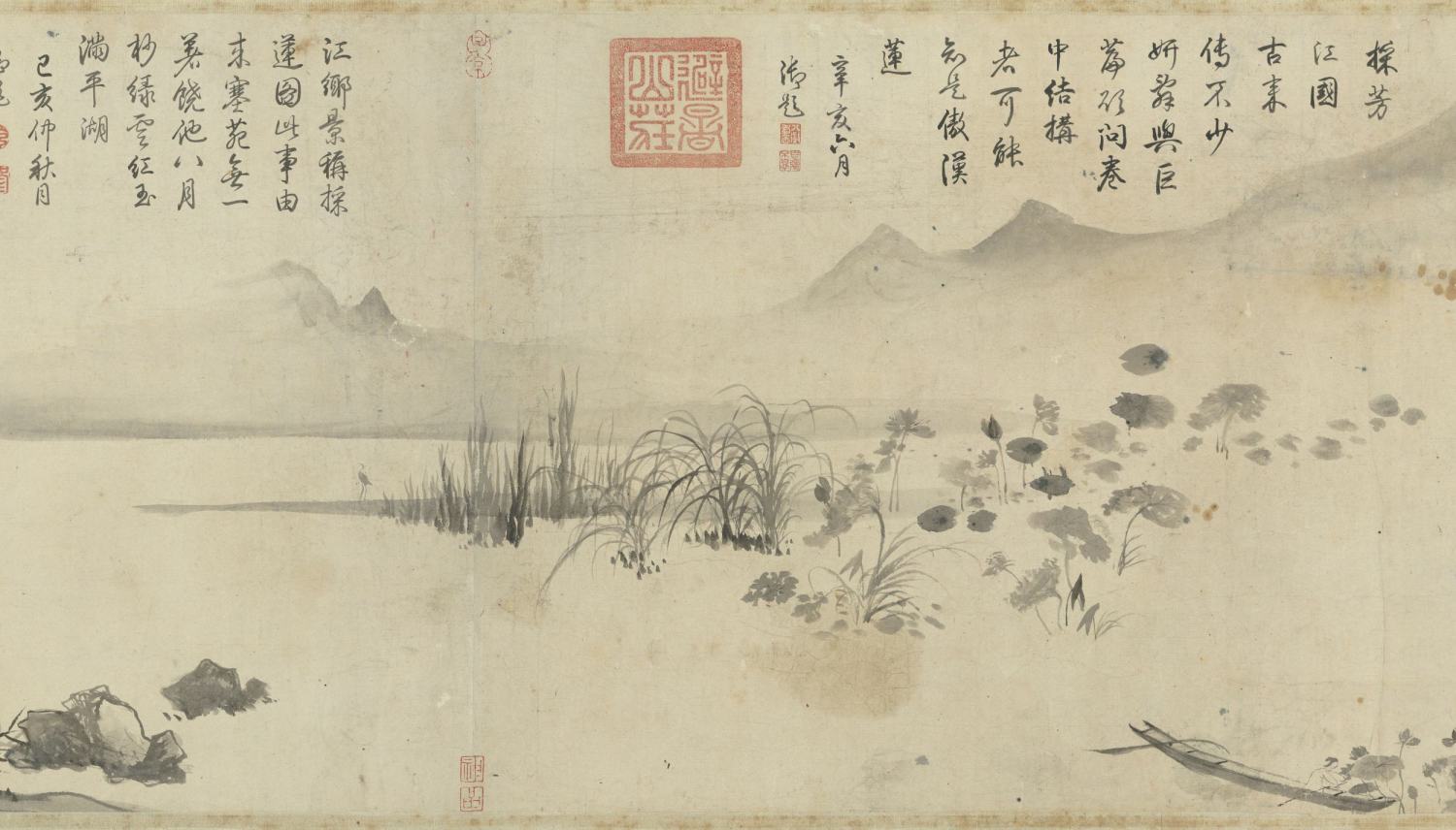 采莲图卷. 明. 唐寅. 绘. 纸本墨笔 (35x520.7 厘米). 明正德十五年