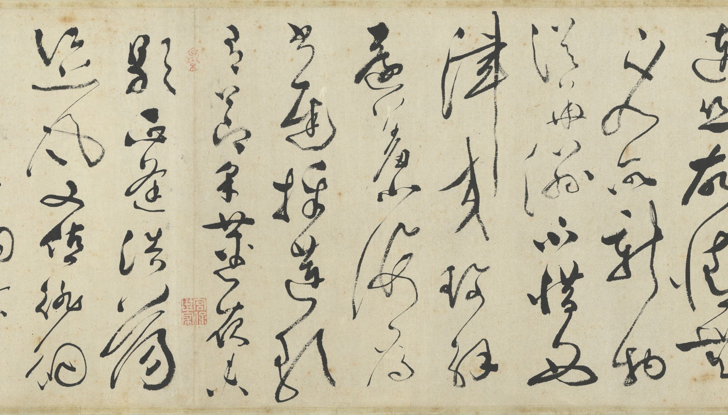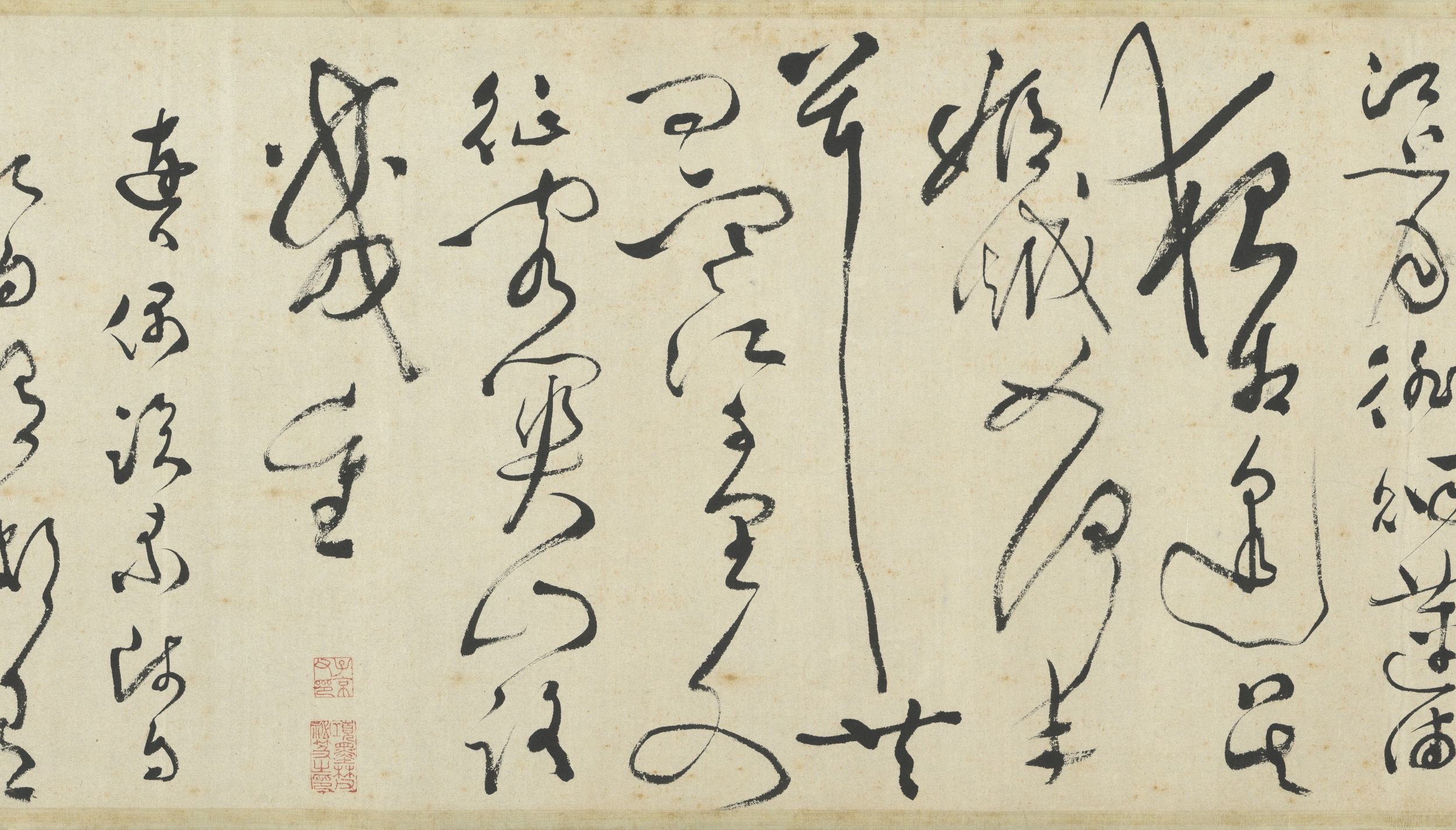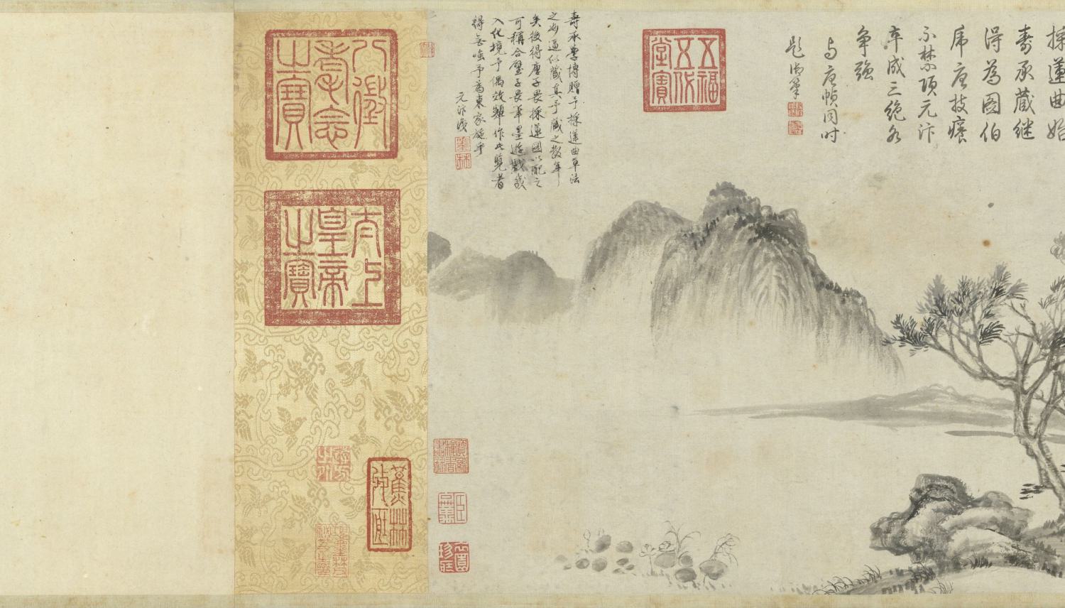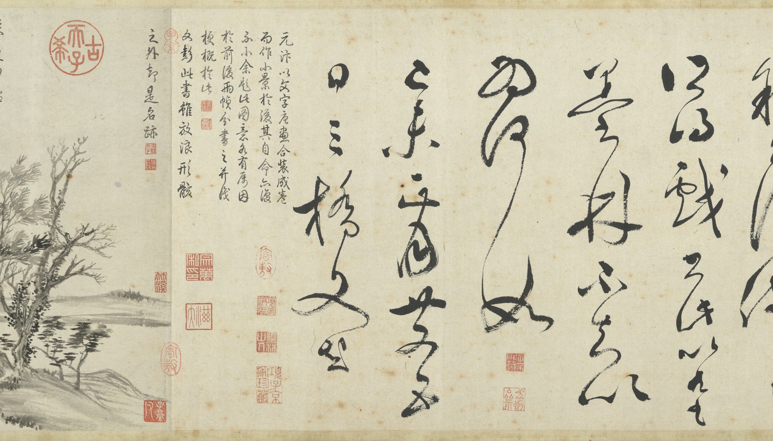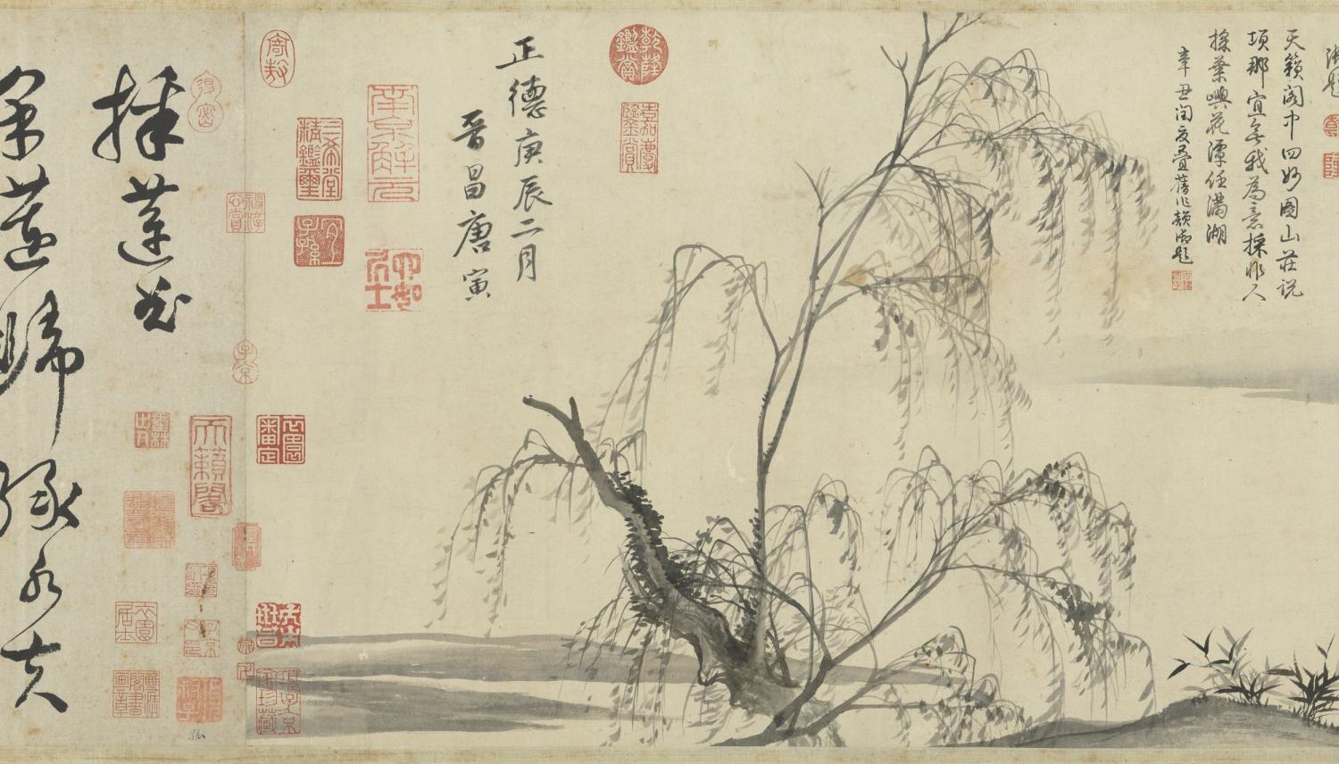 通幅笔墨淋漓,表现岚雾笼罩时的光景,洋溢着潇洒典雅的笔墨趣味。卷后文彭以狂草书 〈采莲曲〉 赠予项元汴,用笔到卷后益形放纵挥洒,笔意酣畅,为明嘉靖三十八年(1559)文彭六十二岁时的扛鼎佳作。此作为唐寅和文彭的书画合璧之作,依据唐寅款识,此图作于明正德庚辰年(1520),是其少数书具年款的作品。