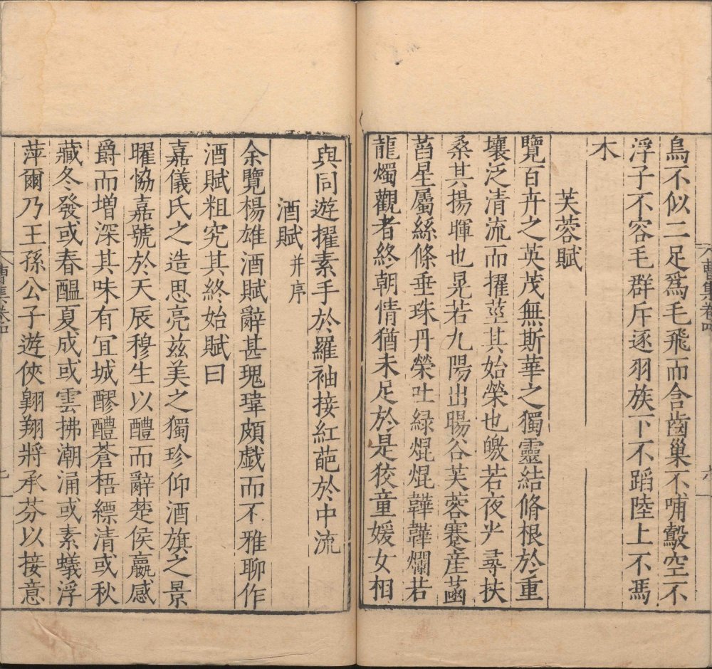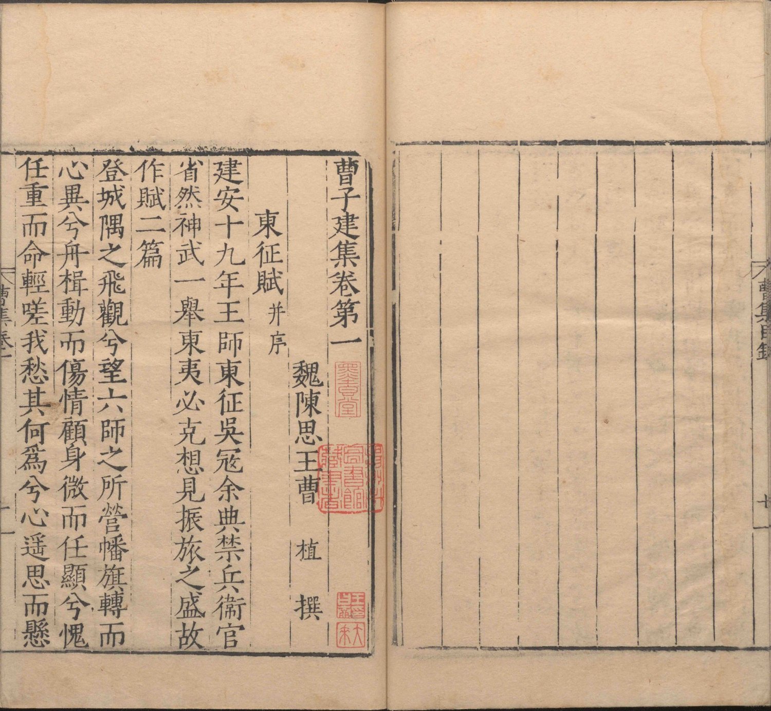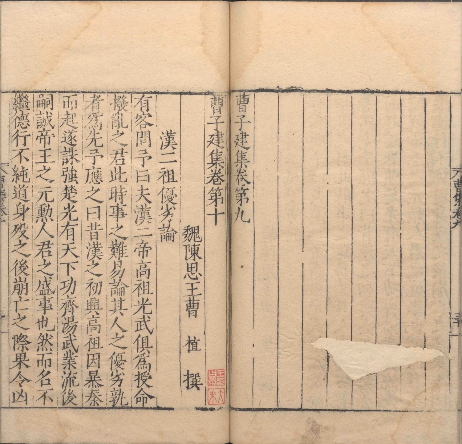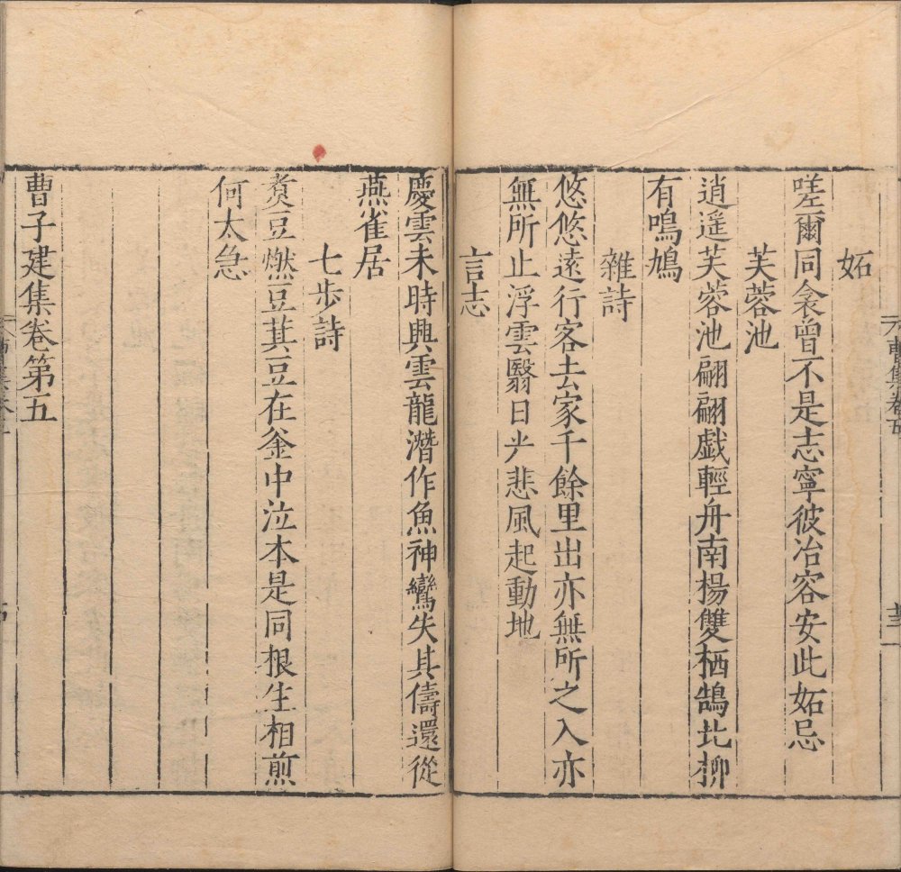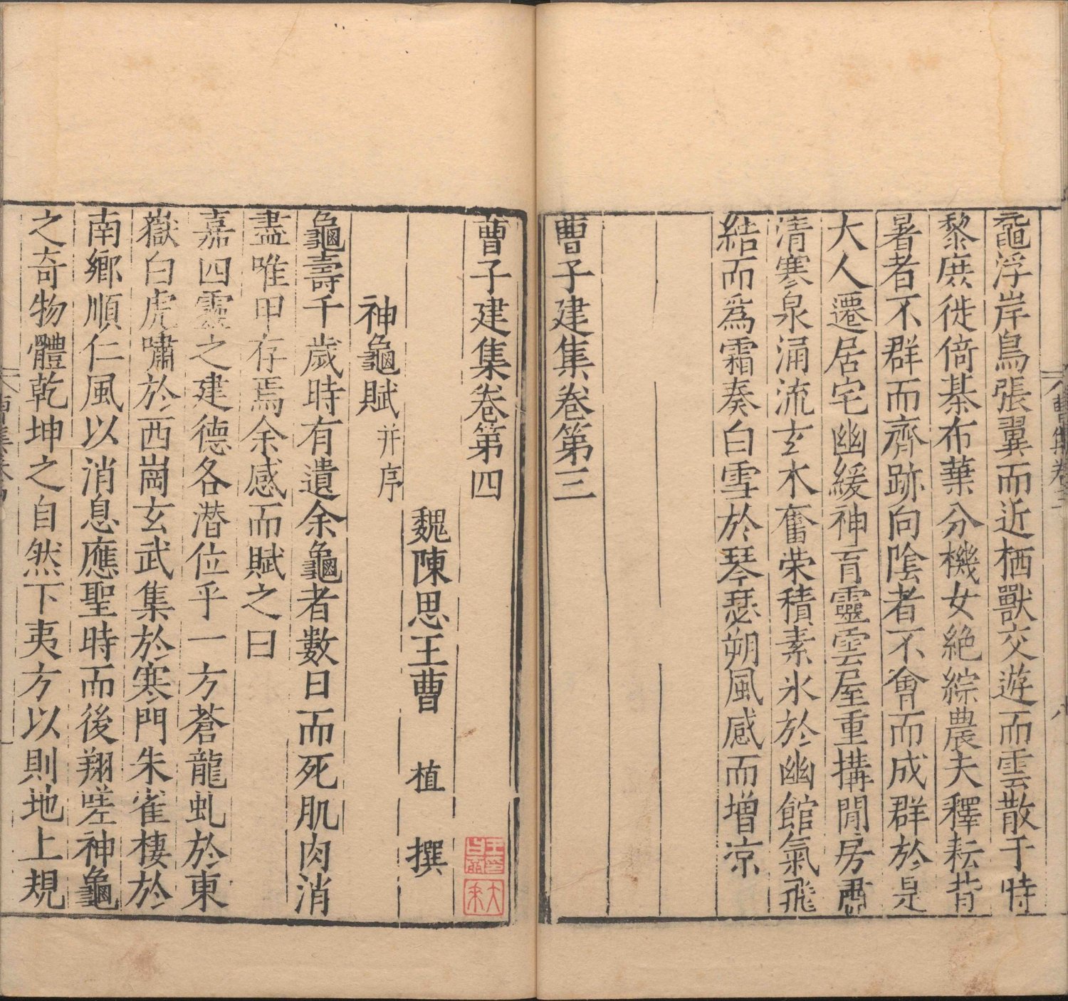 《魏志》本传记曹植身后曹睿下诏集录前后所著赋、颂、诗、铭、杂论凡百馀篇。《隋书·经籍志》除著录 “魏陈思王曹植集三十卷” 外,复有《列女传颂》一卷,《画赞》五卷,均佚。后人搜辑遗文,重为编定。今存《曹子建集》十卷,卷一至卷四为赋,卷五为诗,卷六为乐府,卷七为颂、赞、铭,卷八为章、表、令,卷九为文、咏、序、书、诔、哀辞,卷十为论、说。此郭云鹏宝善堂刊本《曹子建集》,是明代中期较有代表性的古籍刻本之一。