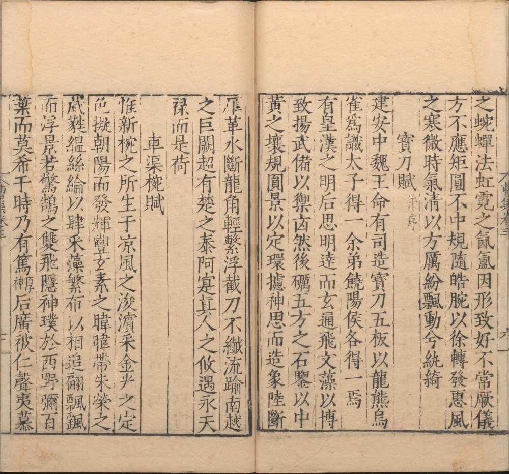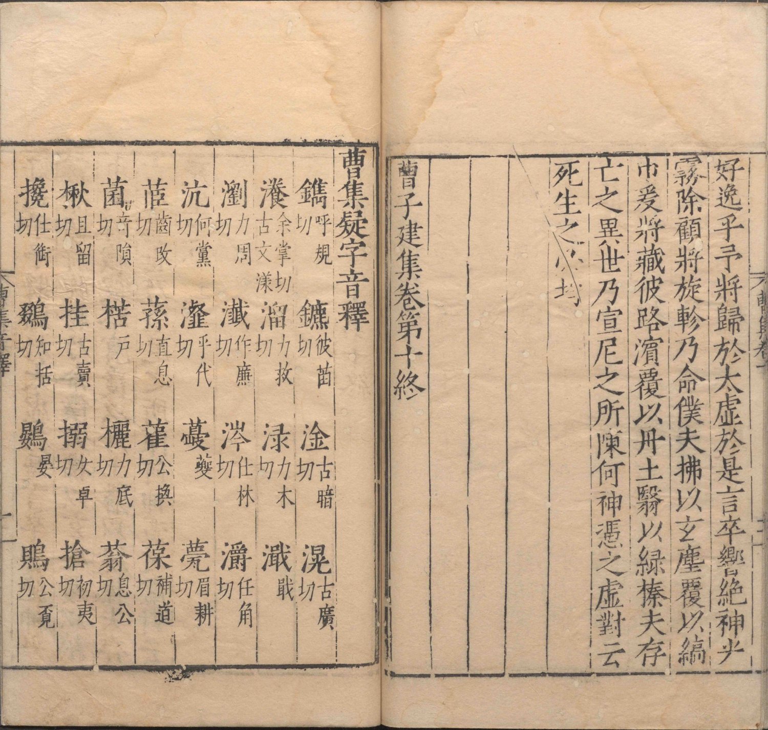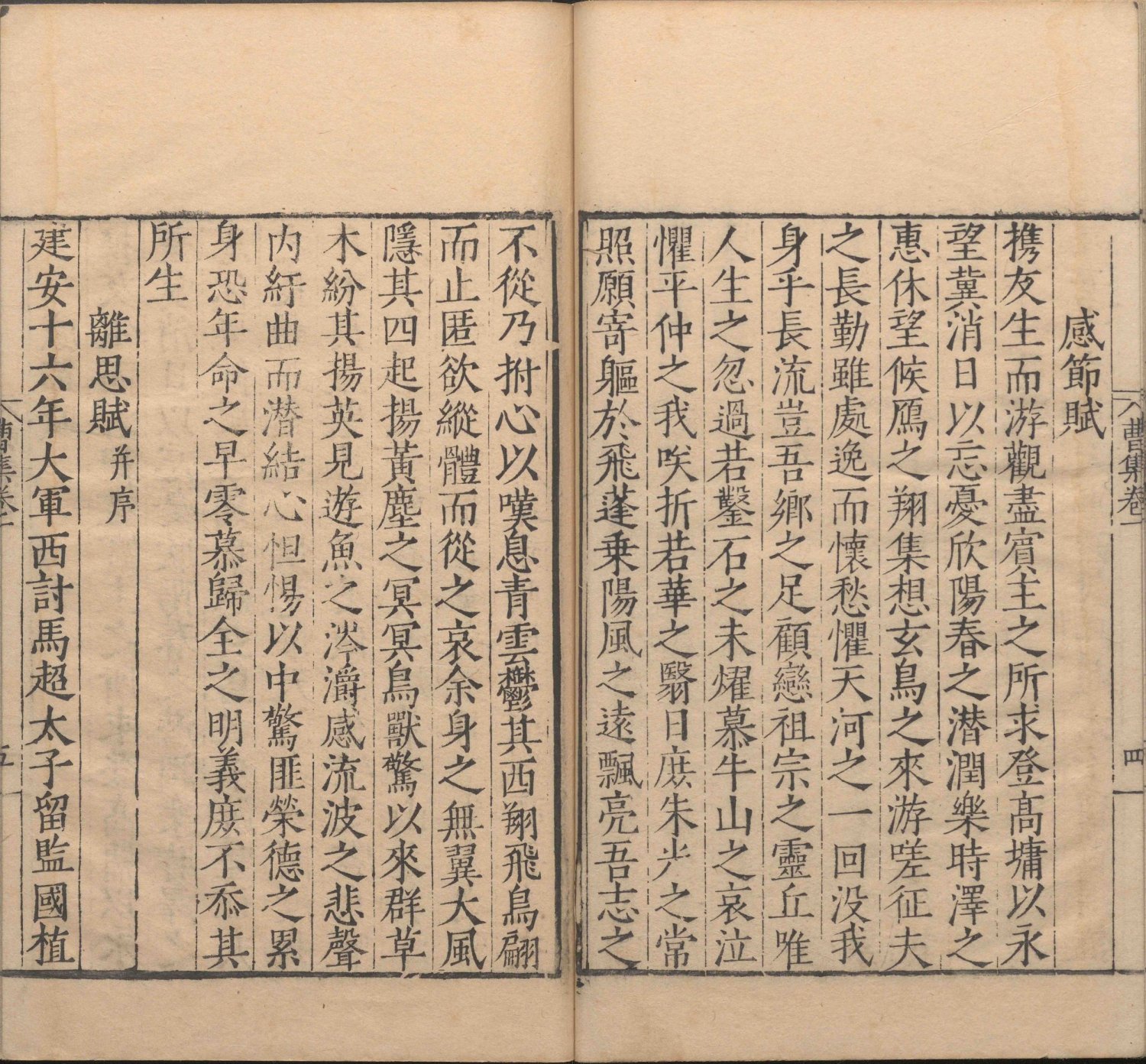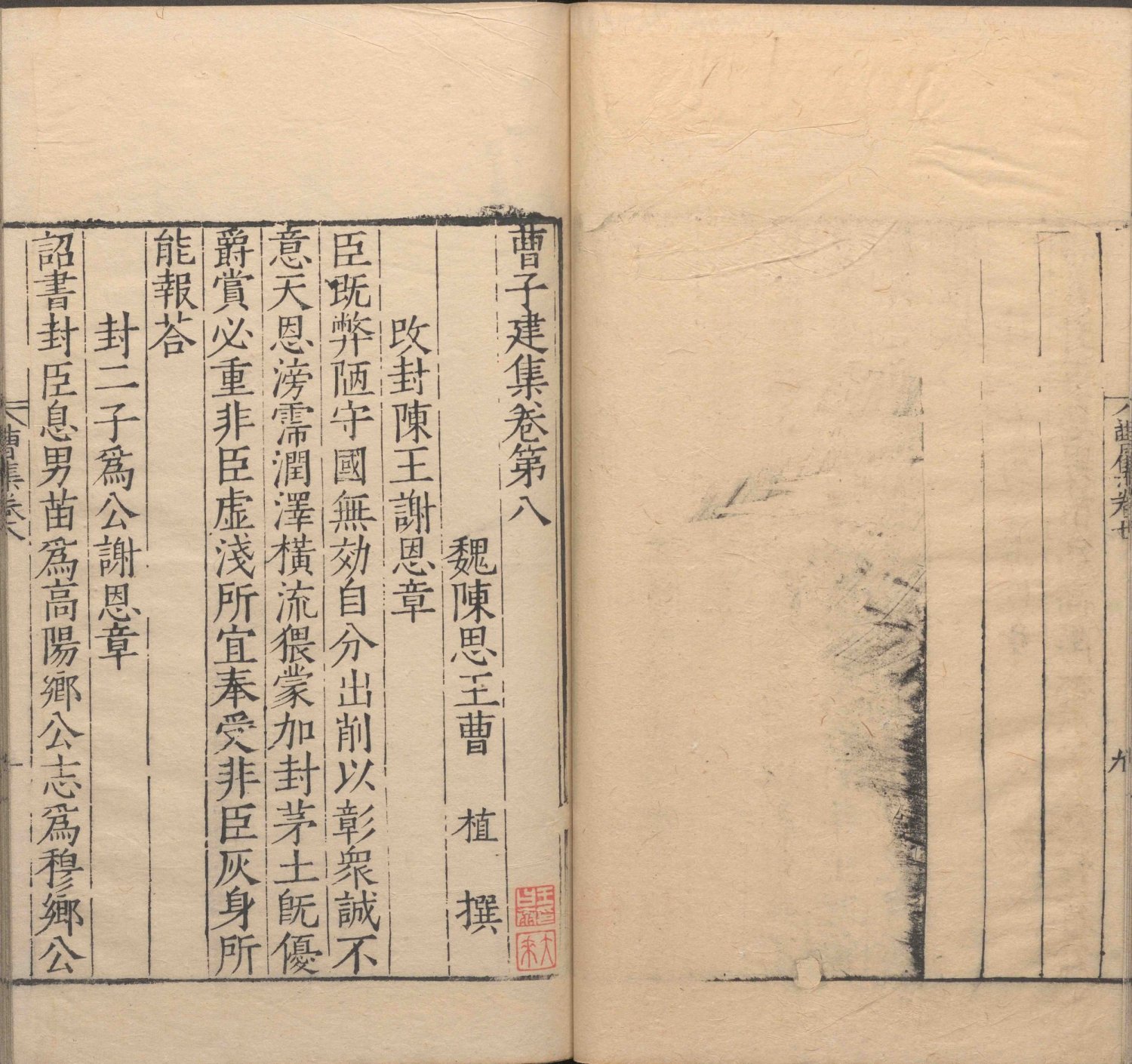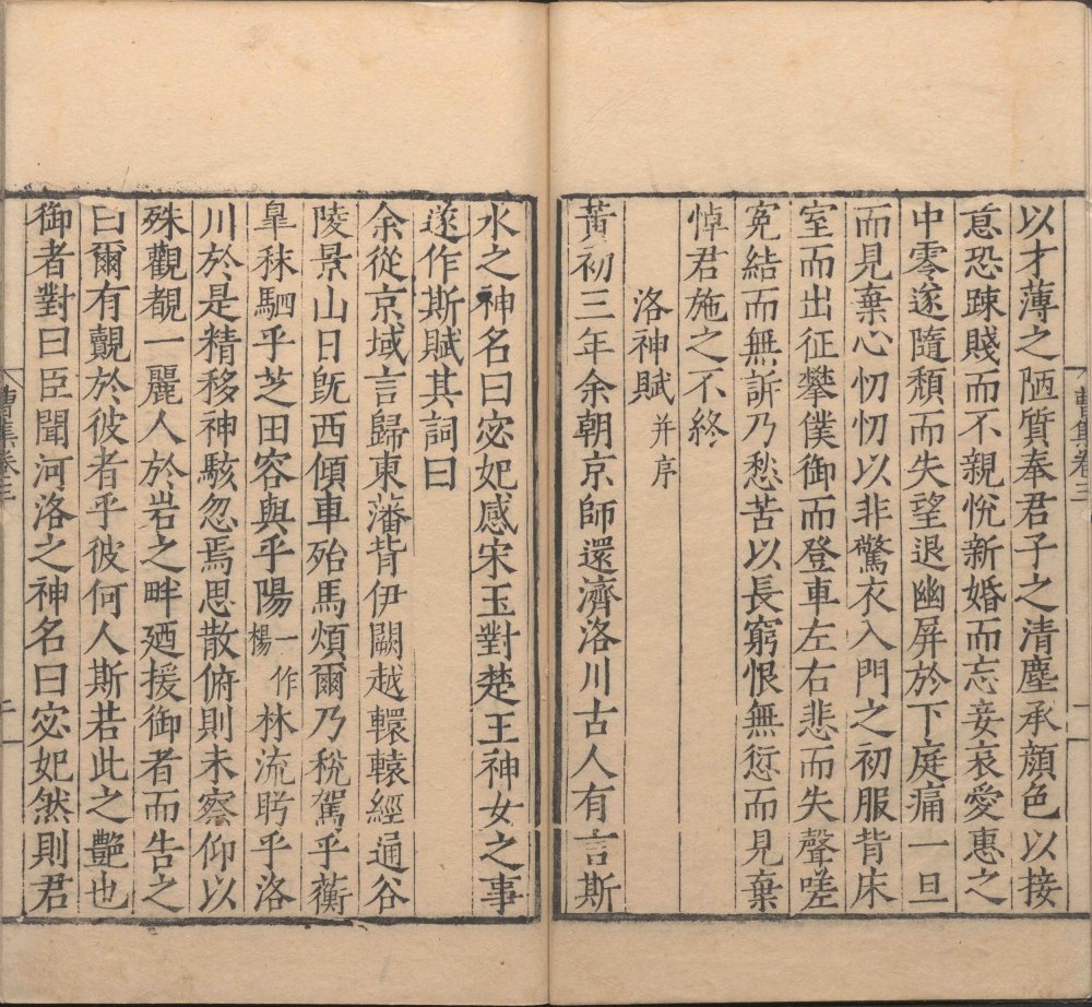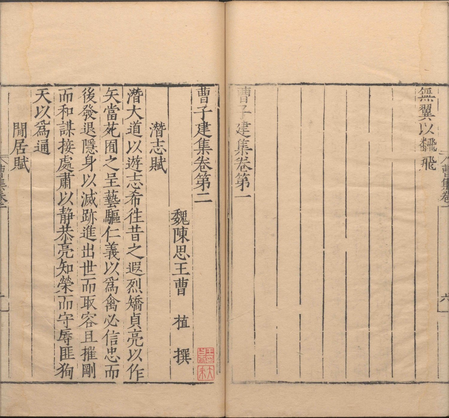 《魏志》本传记曹植身后曹睿下诏集录前后所著赋、颂、诗、铭、杂论凡百馀篇。《隋书·经籍志》除著录 “魏陈思王曹植集三十卷” 外,复有《列女传颂》一卷,《画赞》五卷,均佚。后人搜辑遗文,重为编定。今存《曹子建集》十卷,卷一至卷四为赋,卷五为诗,卷六为乐府,卷七为颂、赞、铭,卷八为章、表、令,卷九为文、咏、序、书、诔、哀辞,卷十为论、说。此郭云鹏宝善堂刊本《曹子建集》,是明代中期较有代表性的古籍刻本之一。
