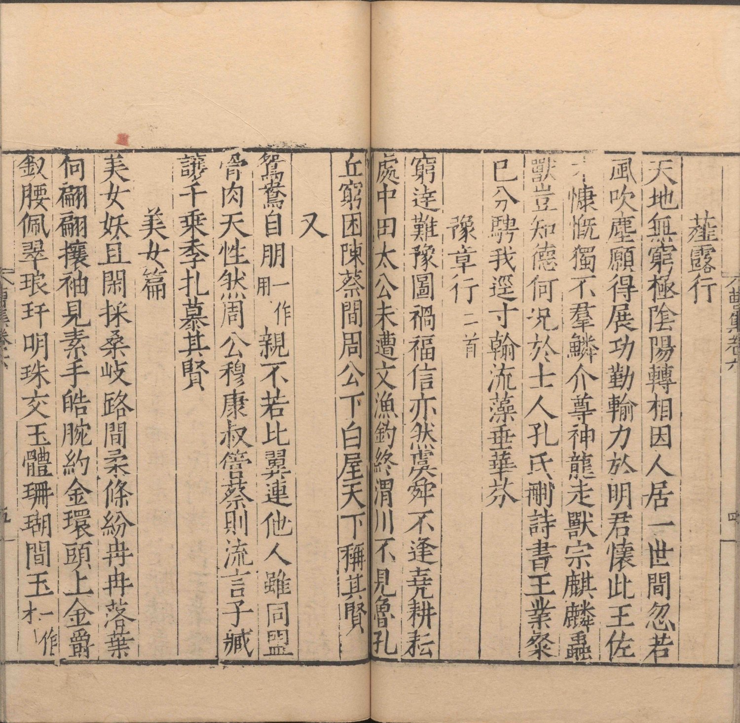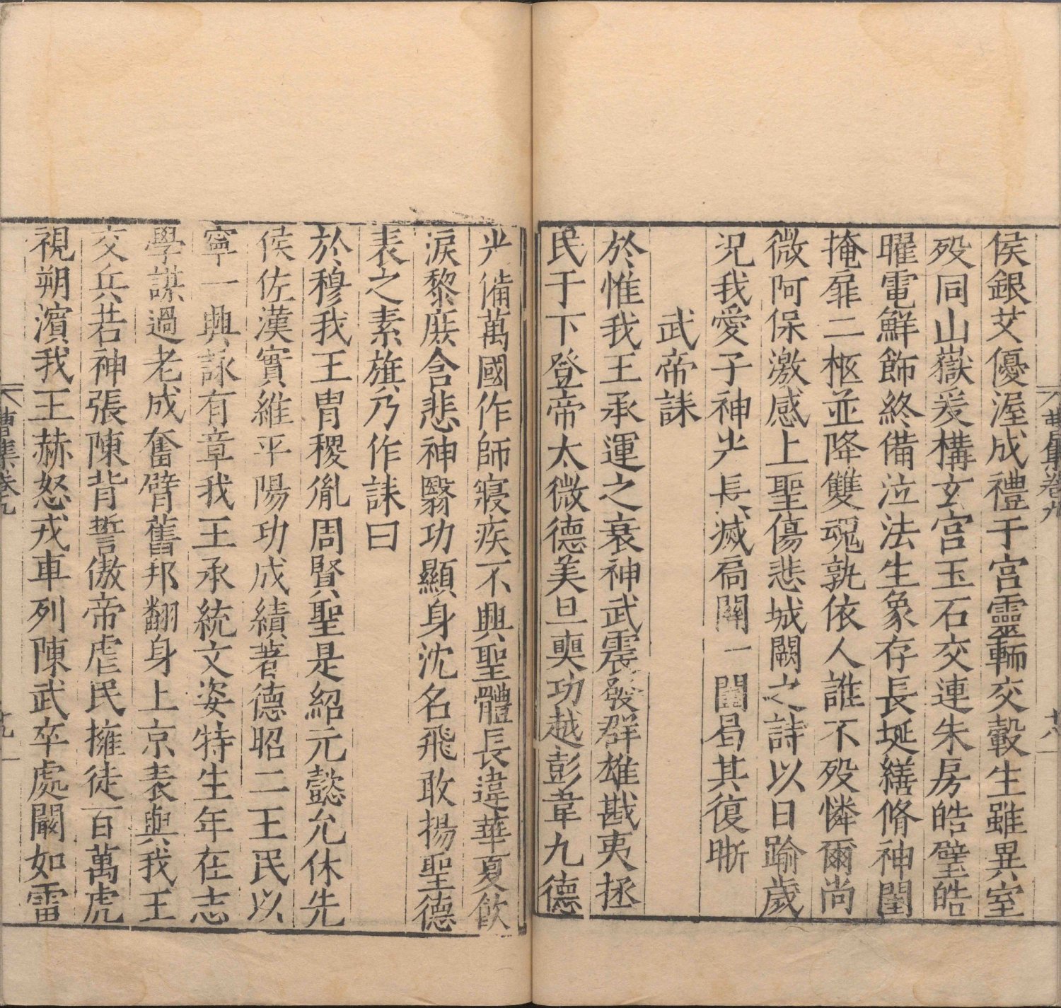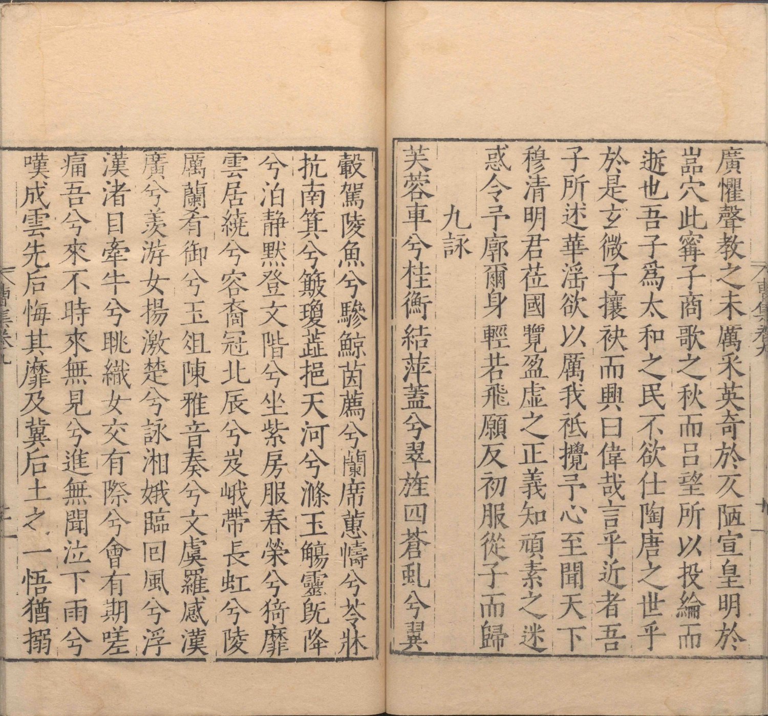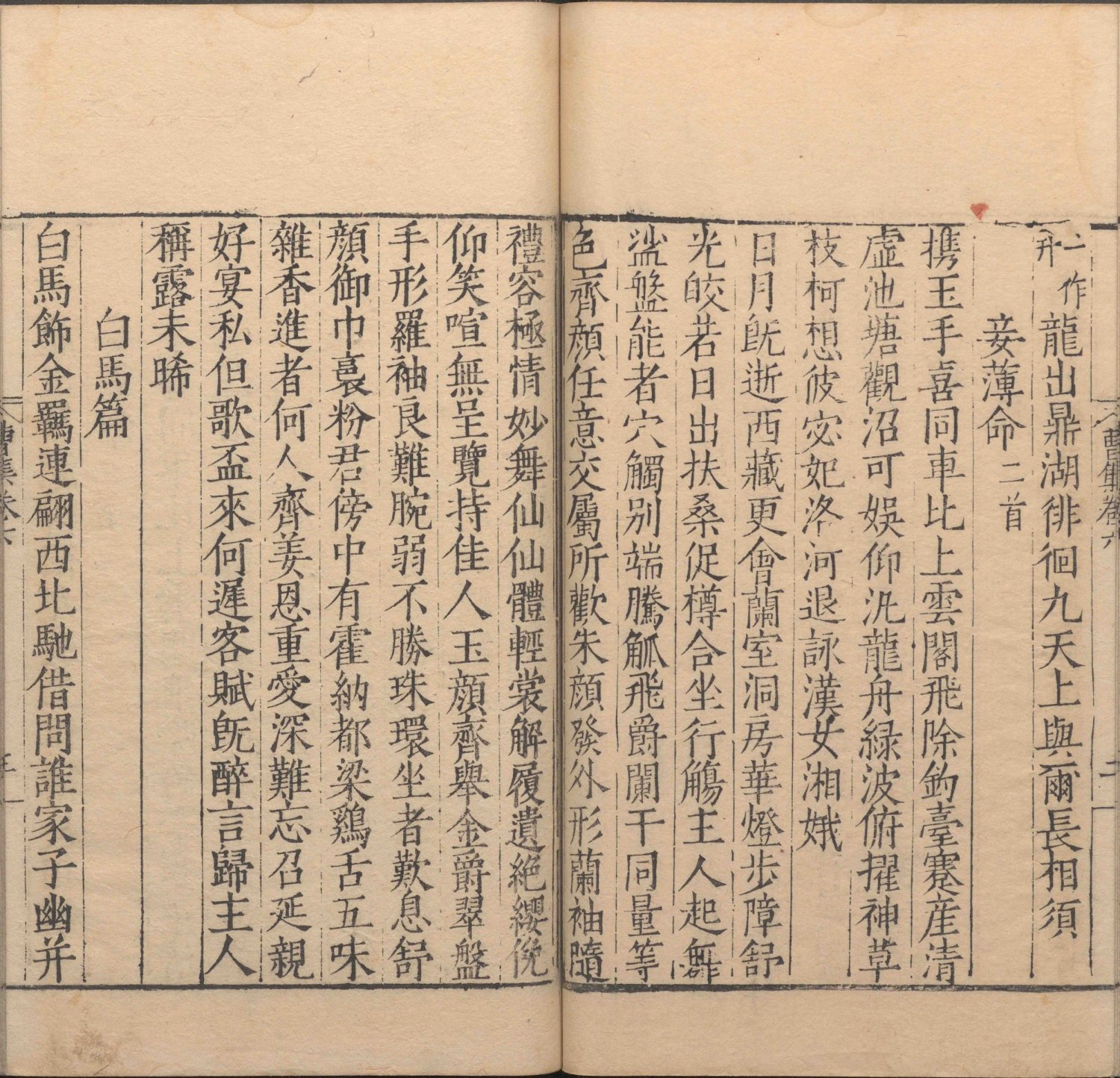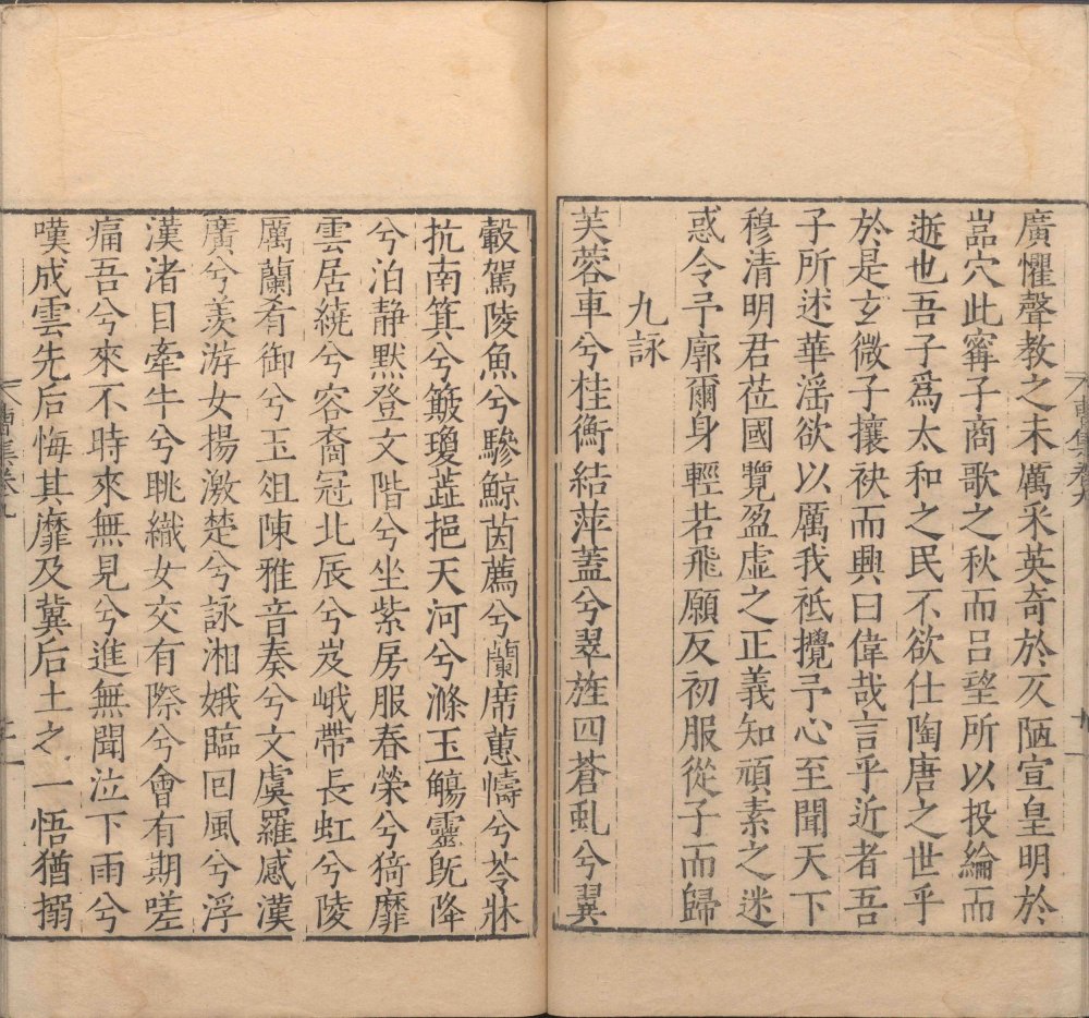 《魏志》本传记曹植身后曹睿下诏集录前后所著赋、颂、诗、铭、杂论凡百馀篇。《隋书·经籍志》除著录 “魏陈思王曹植集三十卷” 外,复有《列女传颂》一卷,《画赞》五卷,均佚。后人搜辑遗文,重为编定。今存《曹子建集》十卷,卷一至卷四为赋,卷五为诗,卷六为乐府,卷七为颂、赞、铭,卷八为章、表、令,卷九为文、咏、序、书、诔、哀辞,卷十为论、说。此郭云鹏宝善堂刊本《曹子建集》,是明代中期较有代表性的古籍刻本之一。