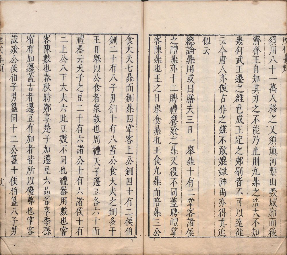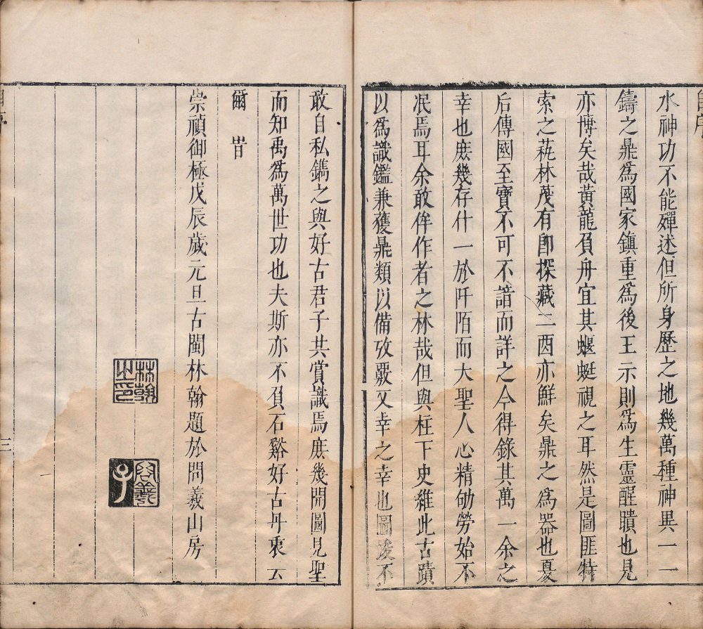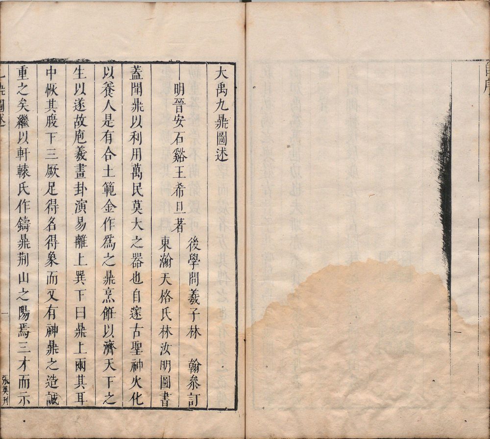 此《大禹九鼎图述》由明代王希旦著,林翰校。全书不分卷,前为大禹九鼎图述,后列臆想中的大禹像及九鼎图像样式:洛书鼎、乾象鼎、九河鼎、九州鼎、五岳四渎鼎、九糓鼎、夭乔彚祥鼎、异物灵彚鼎、飞走肇瑞鼎。后附历代帝王鼎类。此为明崇祯时期张英刻本。