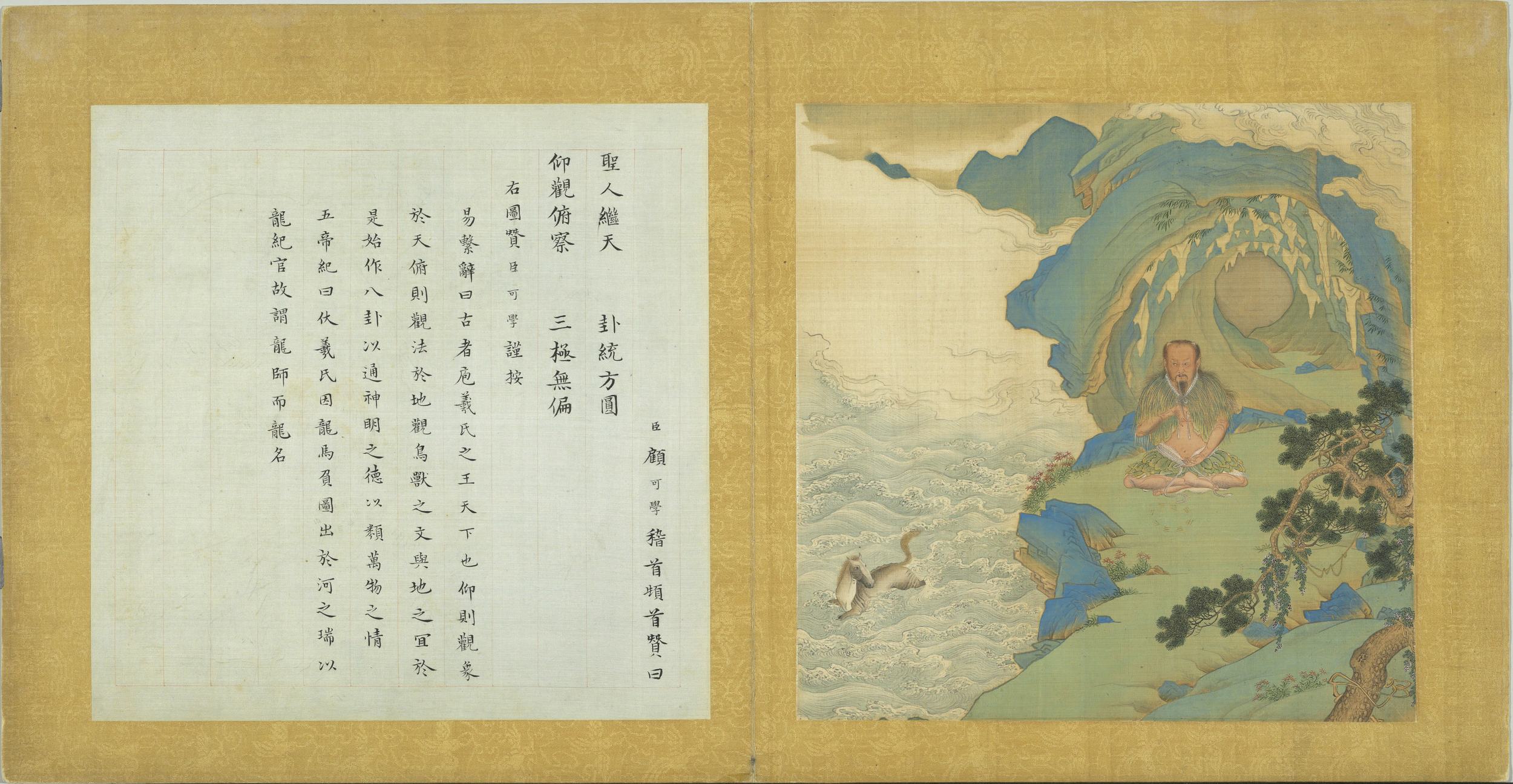 臣顧可學稽首頓首贊曰。聖人繼天。卦統方圓。仰觀俯察。三極無偏。右圖贊臣可學謹按。易繫辭曰。古者庖羲氏之王天下也。仰則觀象於天。俯則觀法於地。觀鳥獸之文與地之宜。於是始作八卦。以通神明之德。以類萬物之情。五帝紀曰。伏羲氏因龍馬負圖出於河之瑞。以龍紀官。故謂龍師而龍名。