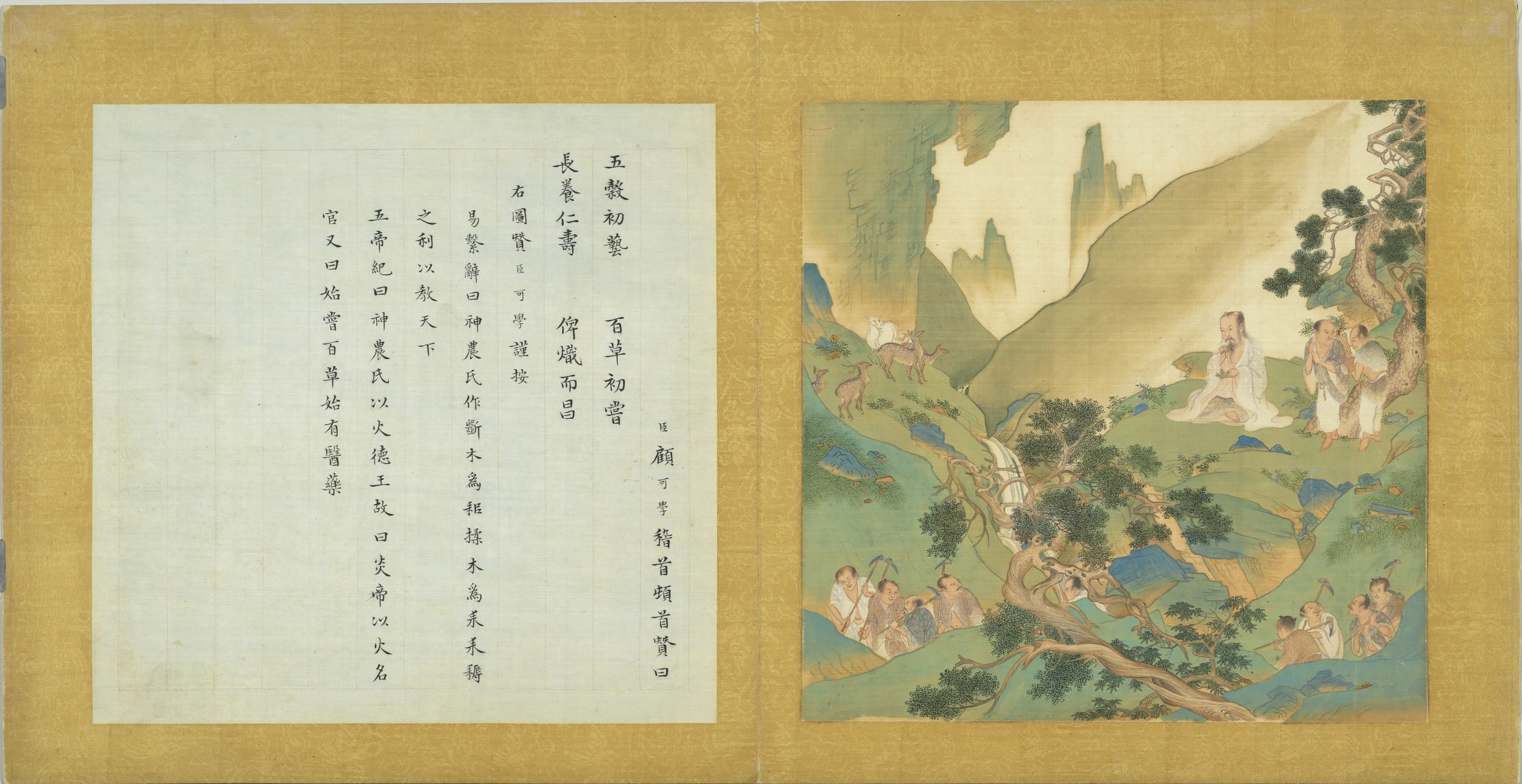 臣顧可學稽首頓首贊曰。五穀初藝。百草初嘗。長養仁壽。俾熾而昌。右圖贊臣可學謹按。易繫辭曰。神農氏作。斲木為耜。揉木為耒。耒耨之利。以教天下。五帝紀曰。神農氏以火德王。故曰。炎帝以火名官。又曰。始嘗百草。始有醫藥。