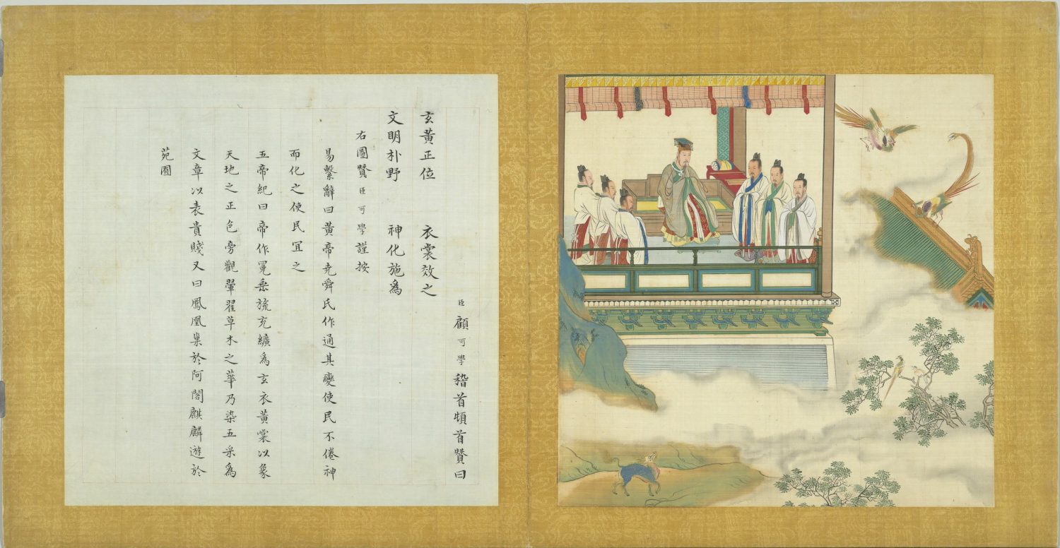 臣顧可學稽首頓首贊曰。玄黃正位。衣裳效之。文明朴野。神化施為。右圖贊臣可學謹按。易繫辭曰。黃帝堯舜氏作。通其變。使民不倦。神而化之。使民宜之。五帝紀曰。帝作冕。垂旒充纊。為玄衣黃裳。以象天地之正色。旁觀翬翟草木之華。乃染五采為文章。以表貴賤。又曰鳳凰巢於阿閣。麒麟遊於苑囿。