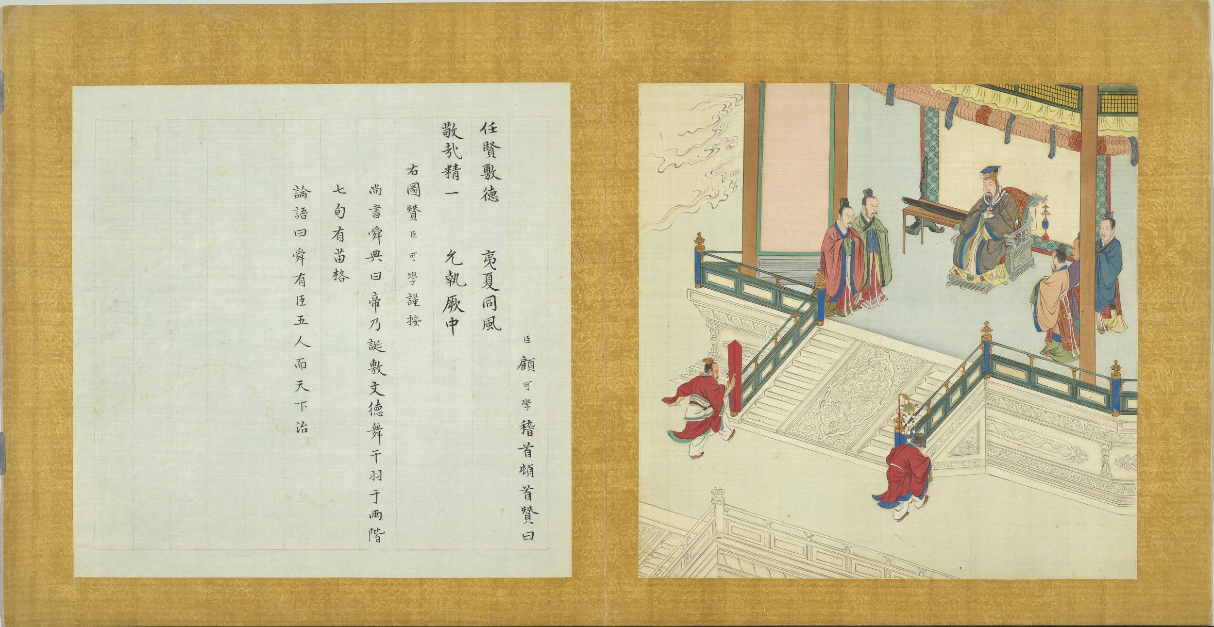 臣顧可學稽首頓首贊曰。任賢敷德。夷夏同風。敬哉精一。允執厥中。右圖贊臣可學謹按。尚書舜典曰。帝乃誕敷文德。舞干羽于兩階。七旬有苗格。論語曰。舜有臣五人。而天下治。