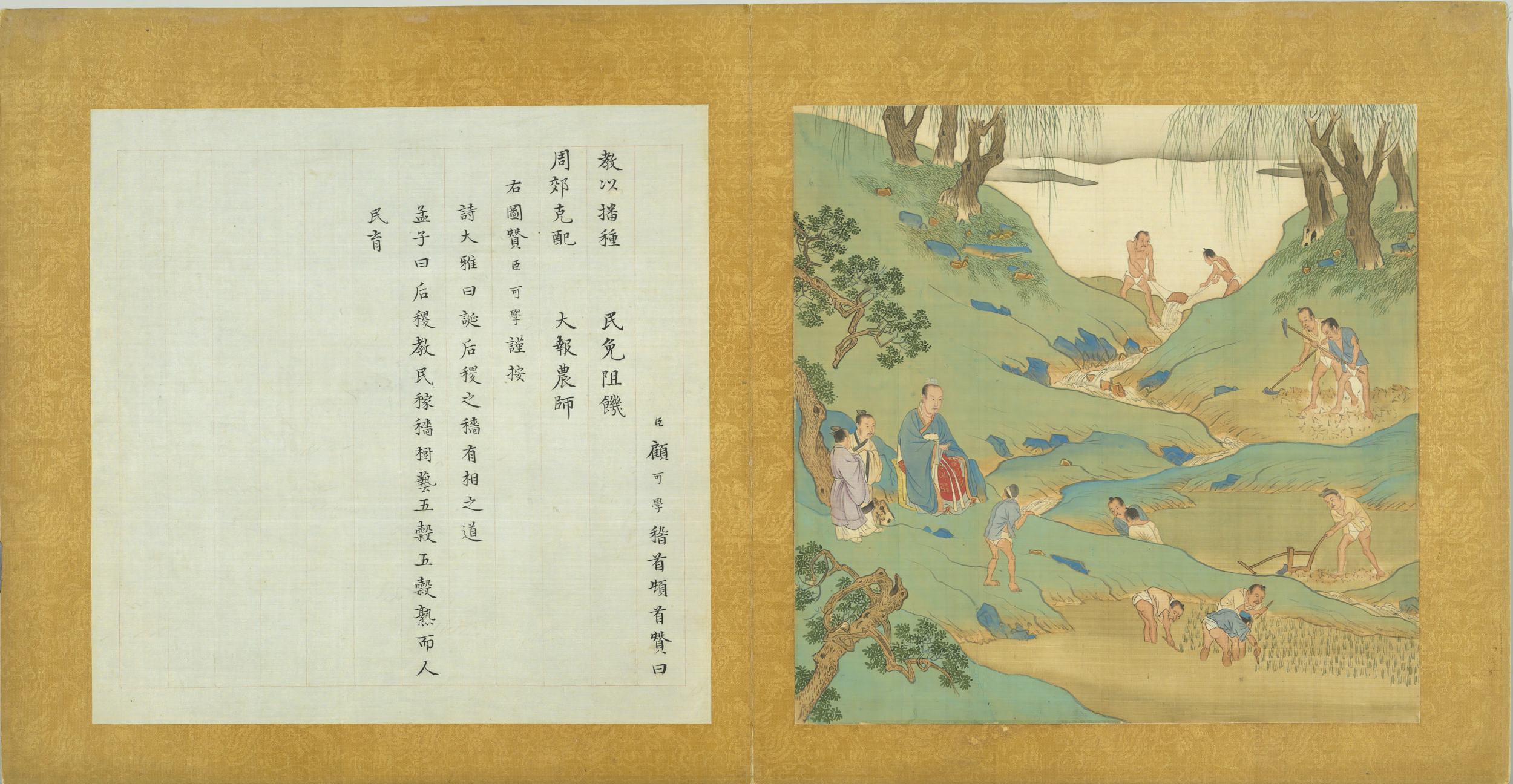 臣顧可學稽首頓贊曰。教以播種。民免阻饑。周郊克配。大報農師。右圖贊臣可學謹按。詩大雅曰。誕后稷之穡。有相之道。孟子曰。后稷教民稼穡。樹藝五穀。五穀熟而人民育。