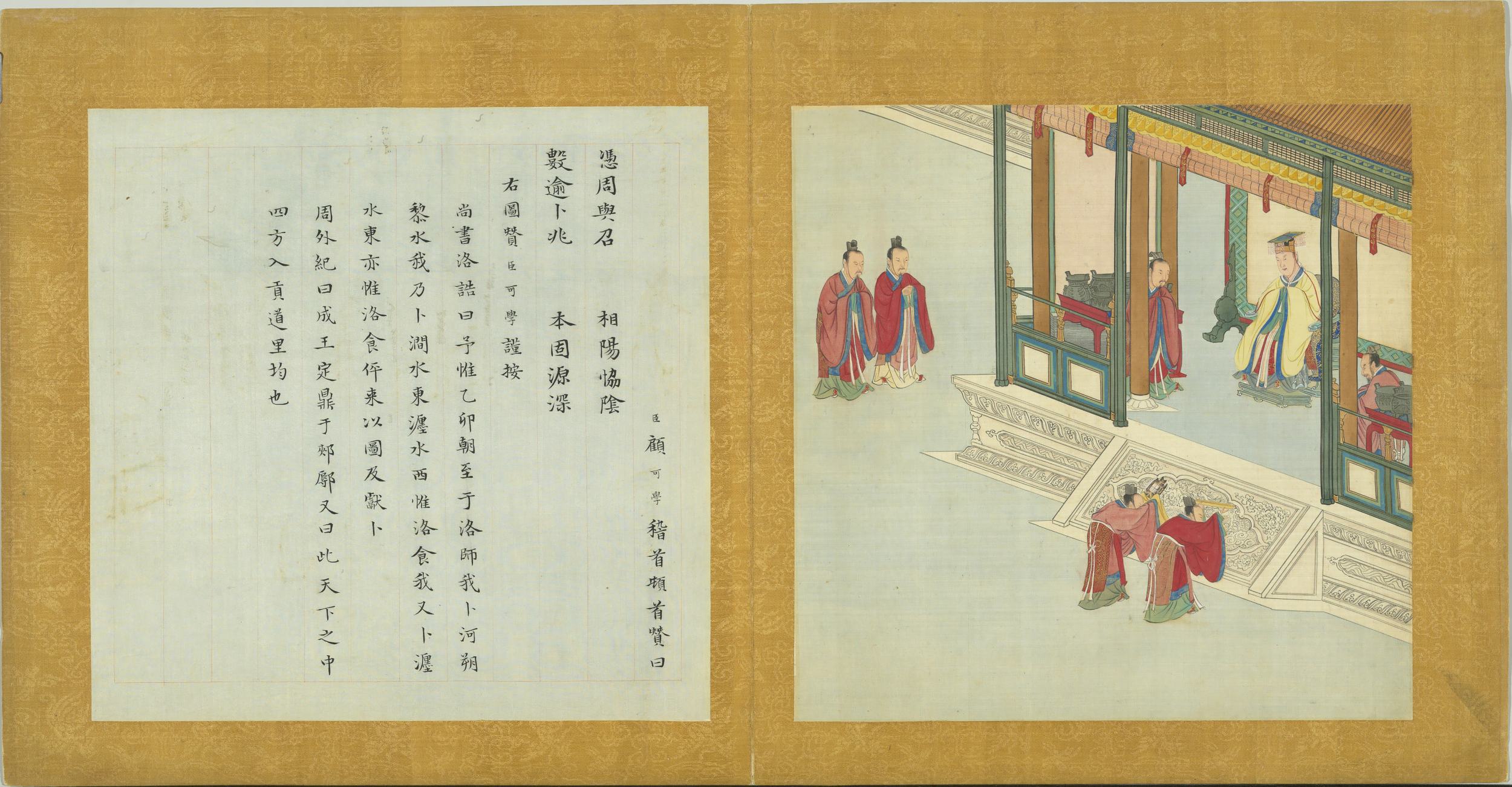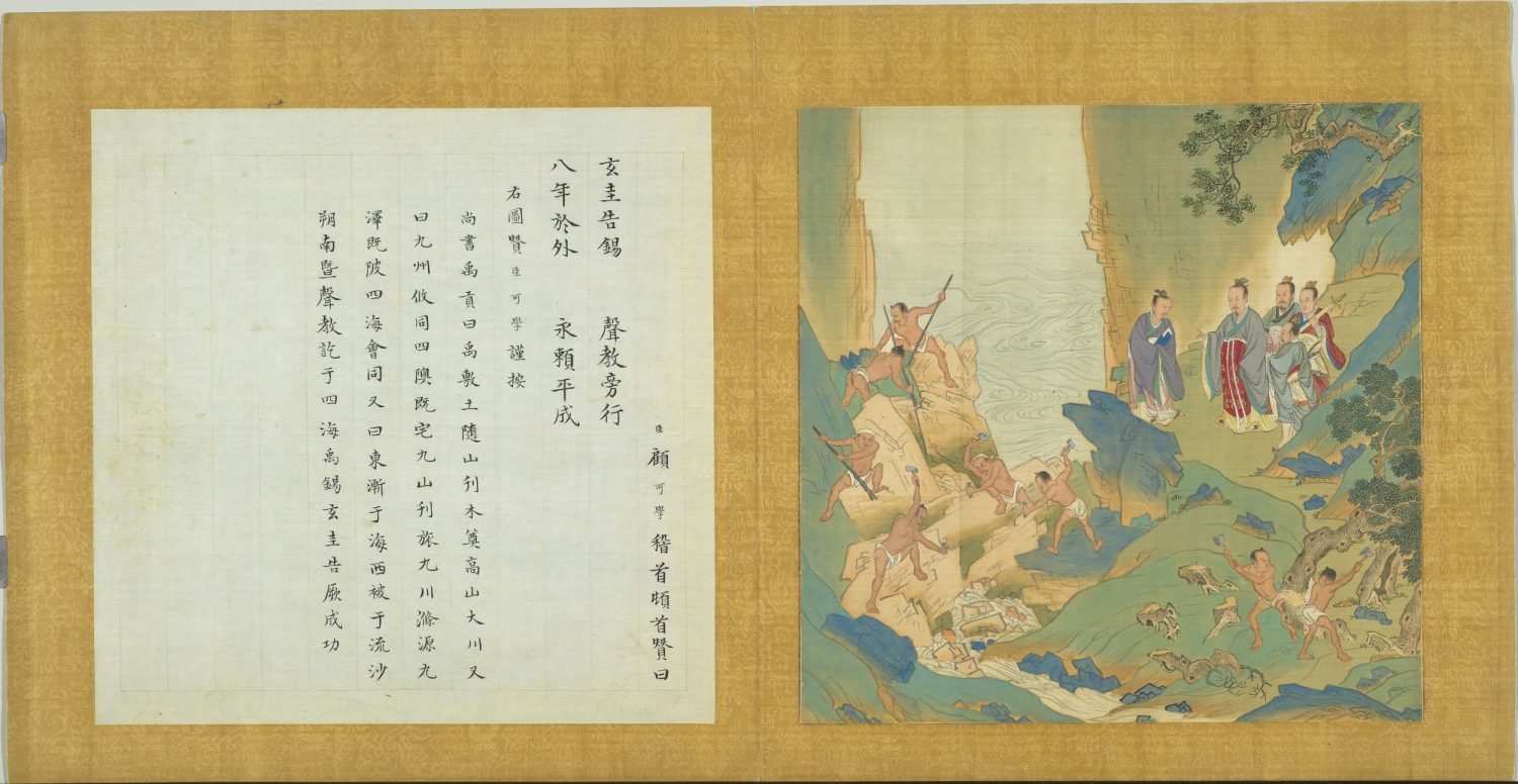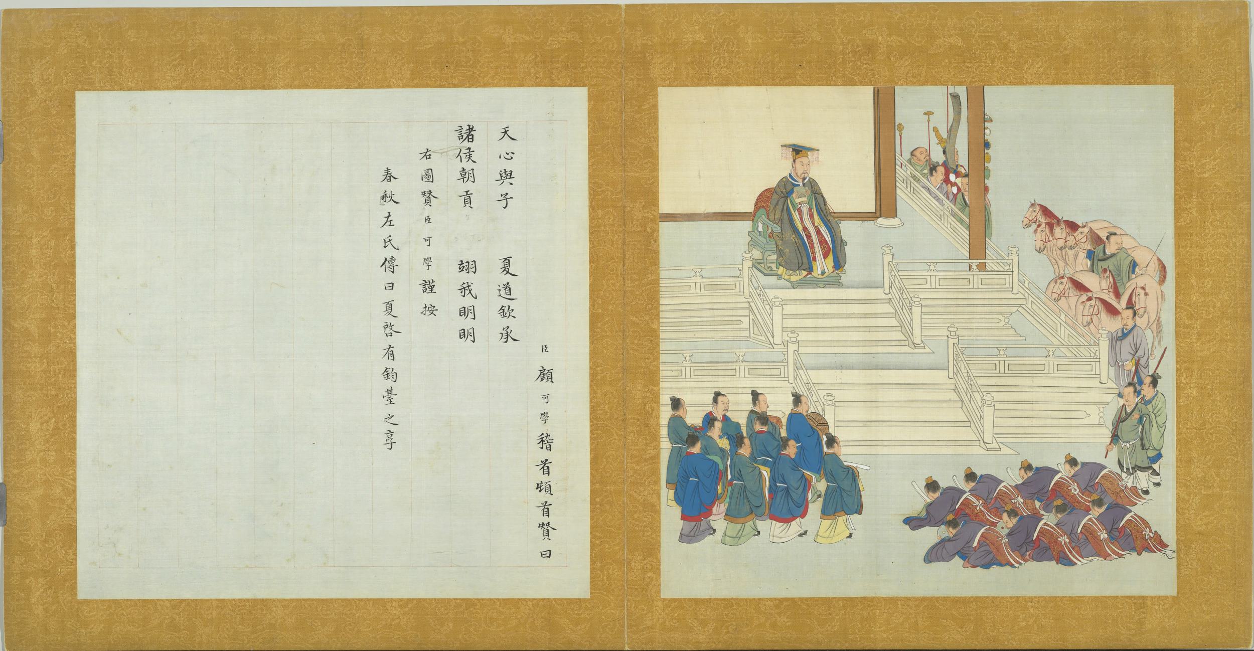 臣顧可學稽首頓首贊曰。天心與子。夏道欽承。諸侯朝貢。翊我明明。右圖贊臣可學謹按。春秋左氏傳曰。夏啟有鈞臺之享。