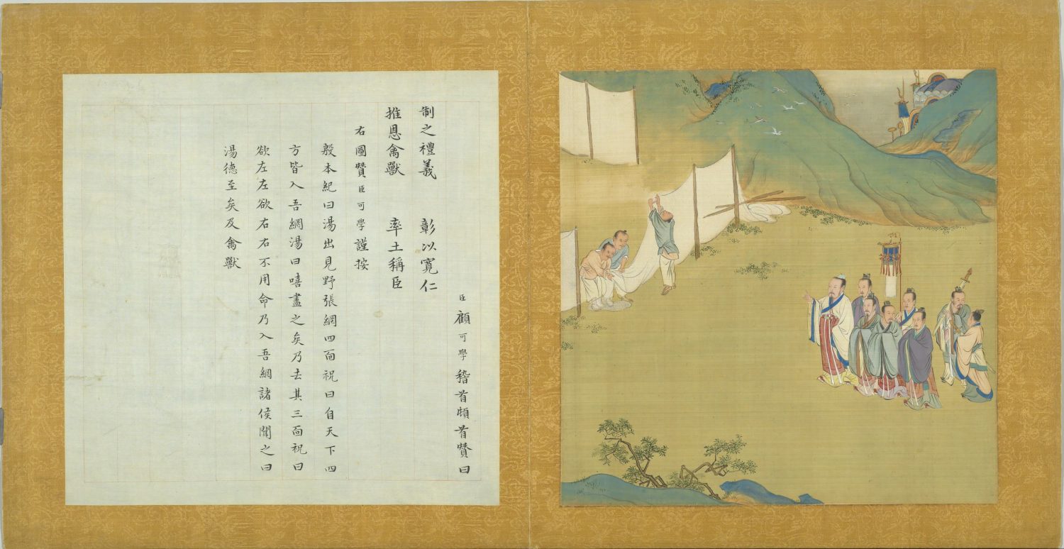 臣顧可學稽首頓首贊曰。制之禮義。彰以寬仁。推恩禽獸。率土稱臣。右圖贊臣可學謹按。殷本紀曰。湯出見野張網四面。祝曰。自天下四方皆入吾網。湯曰。嘻。盡之矣。乃去其三面。祝曰。欲左左。欲右右。不用命乃入吾網。諸侯聞之曰。湯德至矣及禽獸。