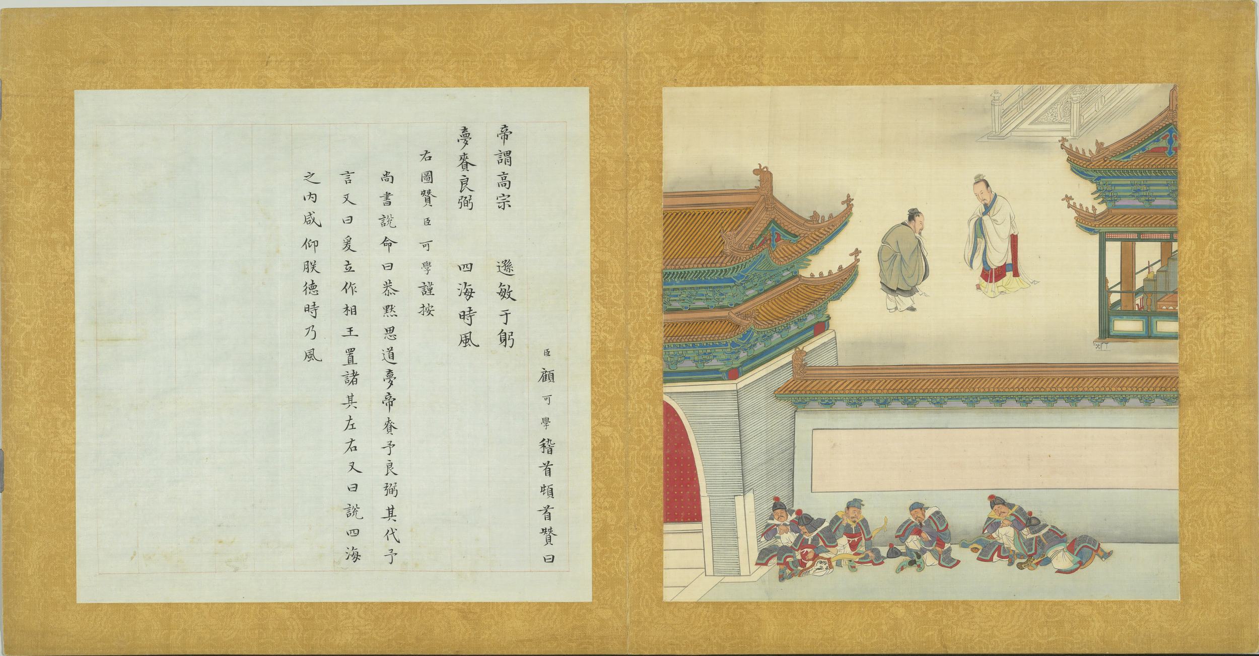 臣顧可學稽首頓首贊曰。帝謂高宗。遜敏于躬。夢賚良弼。四海時風。右圖贊臣可學謹按。尚書說命曰。恭默思道。夢帝賚予良弼。其代予言。又曰。爰立作相。王置諸其左右。又曰。說四海之內。咸仰朕德。時乃風。