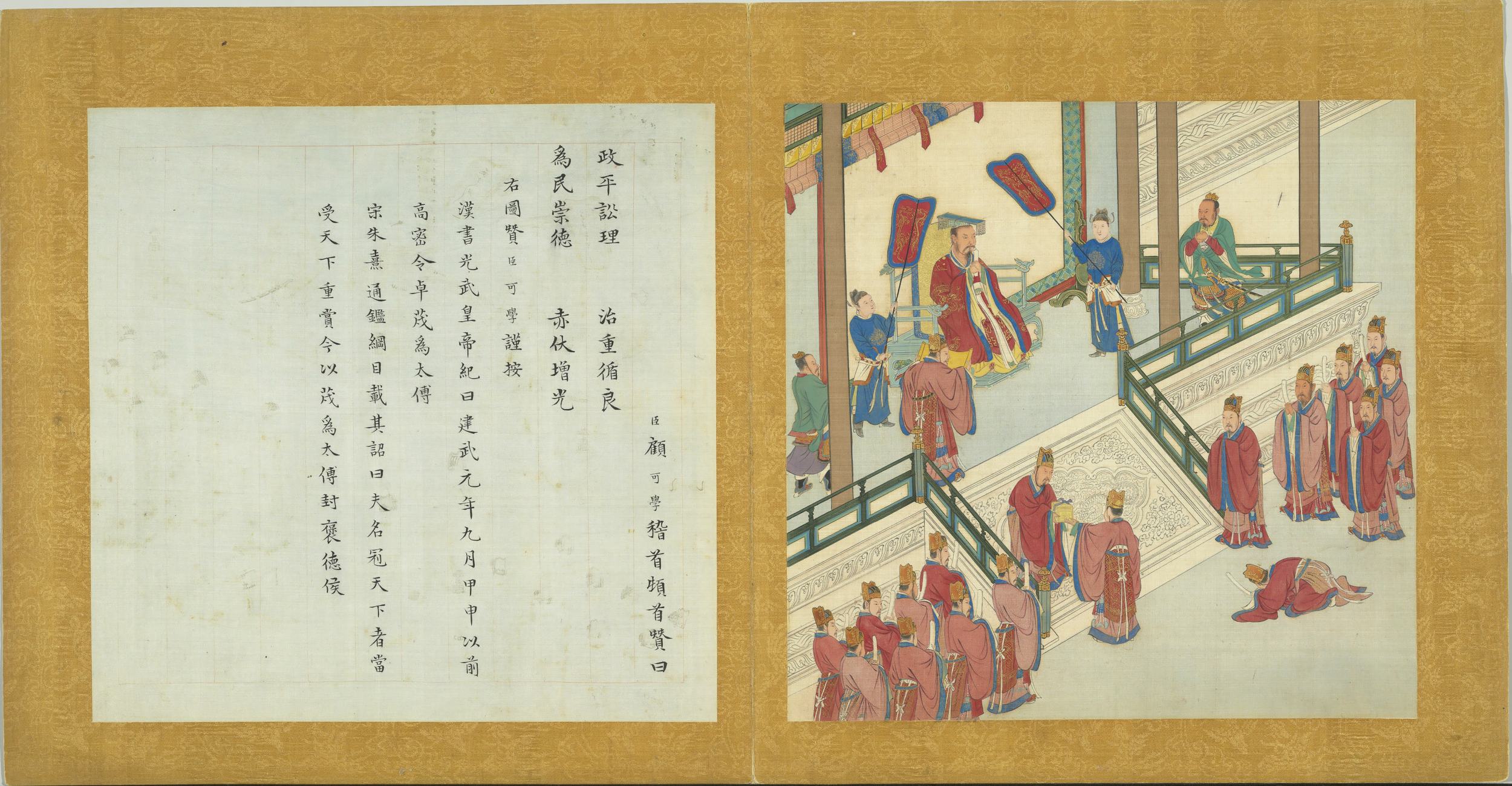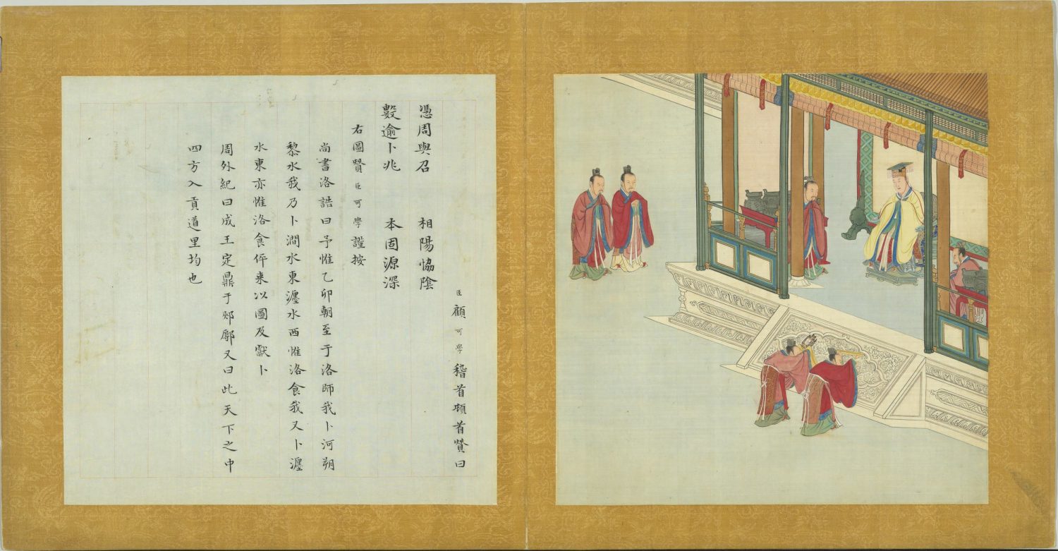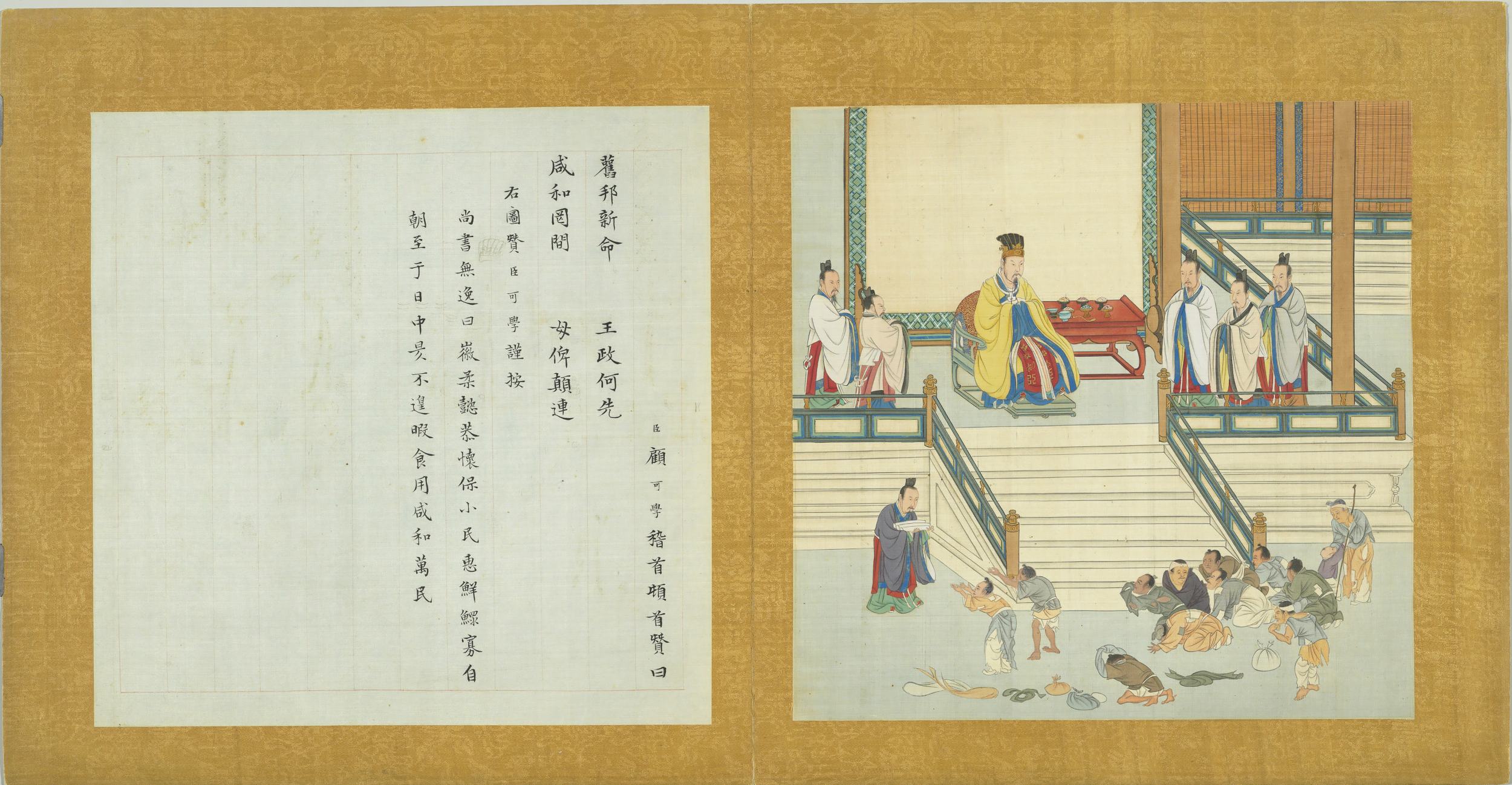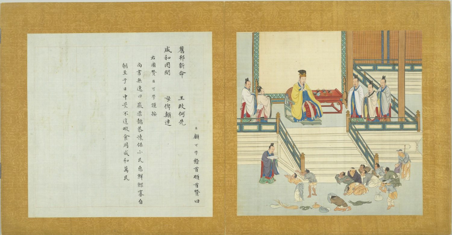 臣顧可學稽首頓首贊曰。舊邦新命。王政何先。咸和罔間。母俾顛連。右圖贊臣可學謹按。尚書無逸曰。徽柔懿恭。懷保小民。惠鮮鰥寡。自朝至于日中昃。不遑暇食。用咸和萬民。