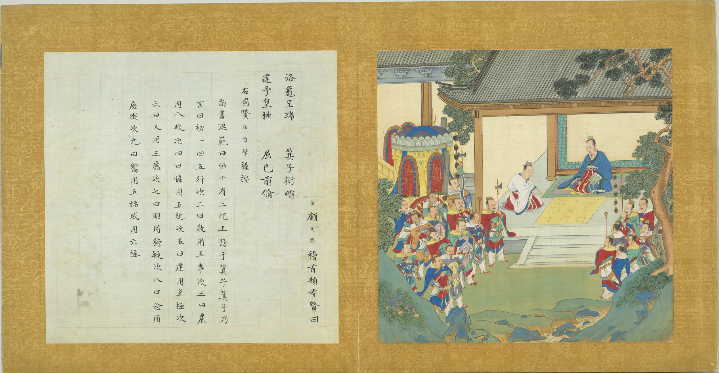 臣顧可學稽首頓首贊曰。洛龜呈瑞。箕子衍疇。建予皇極。屈己前脩。右圖贊臣可學謹按。尚書洪範曰。惟十有三祀。王訪于箕子。箕子乃言曰。初一日五行。次二日敬用五事。次三日農用八政。次四日協用五紀。次五日建用皇極。次六日又用三德。次七日明用稽疑。次八日念用庶徵。次九日嚮用五福。威用六極。