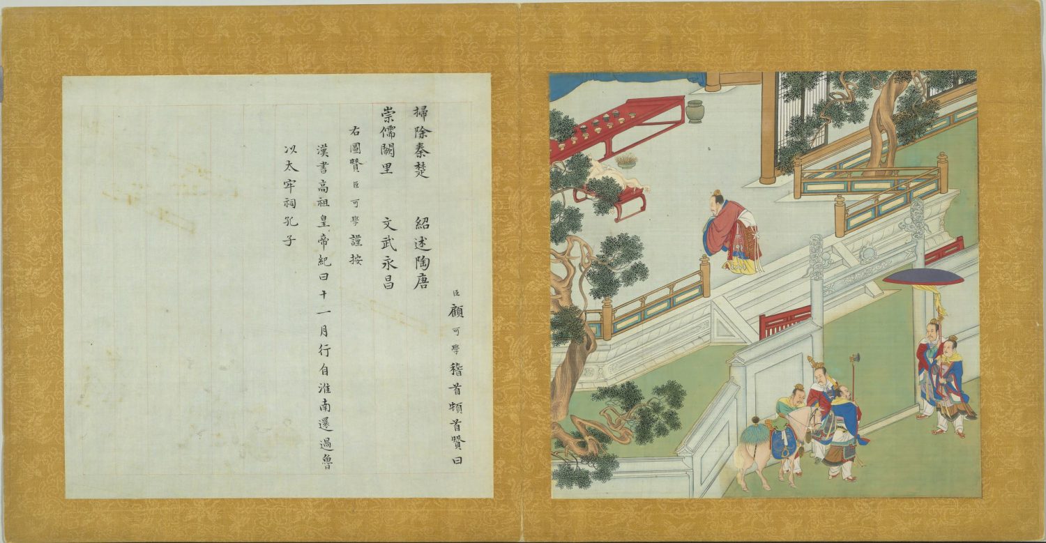 臣顧可學稽首頓首贊曰。掃除秦楚。紹述陶唐。崇儒闕里。文武永昌。右圖贊臣可學謹按。漢書高祖皇帝紀曰。十一月行自淮南還過魯。以太牢祠孔子。