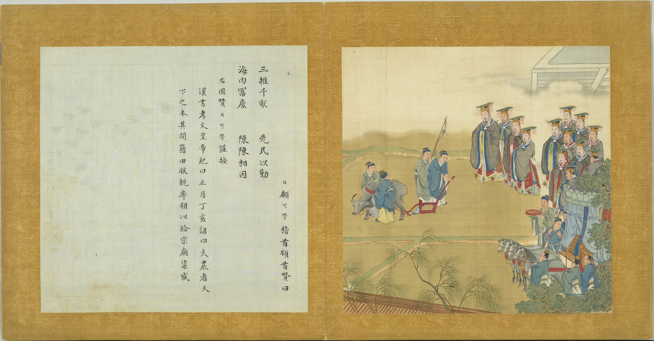 臣顧可學稽首頓首贊曰。三推千畝。先民以勤。海內富庶。陳陳相因。右圖贊臣可學謹按。漢書孝文皇帝紀曰。正月丁亥詔曰。夫農者天下之本。其開籍田。朕親率耕。以給宗廟粢盛。