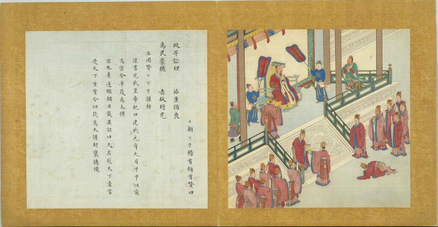 臣顧可學稽首頓首贊曰。政平訟理。治重循良。為民崇德。赤伏增光。右圖贊臣可學謹按。漢書光武皇帝紀曰。建武元年九月甲申。以前高密令卓茂為太傅。宋朱熹通鑑綱目載其詔曰。夫名冠天下者。當受天下重賞。今以茂為太傅。封褒德侯。