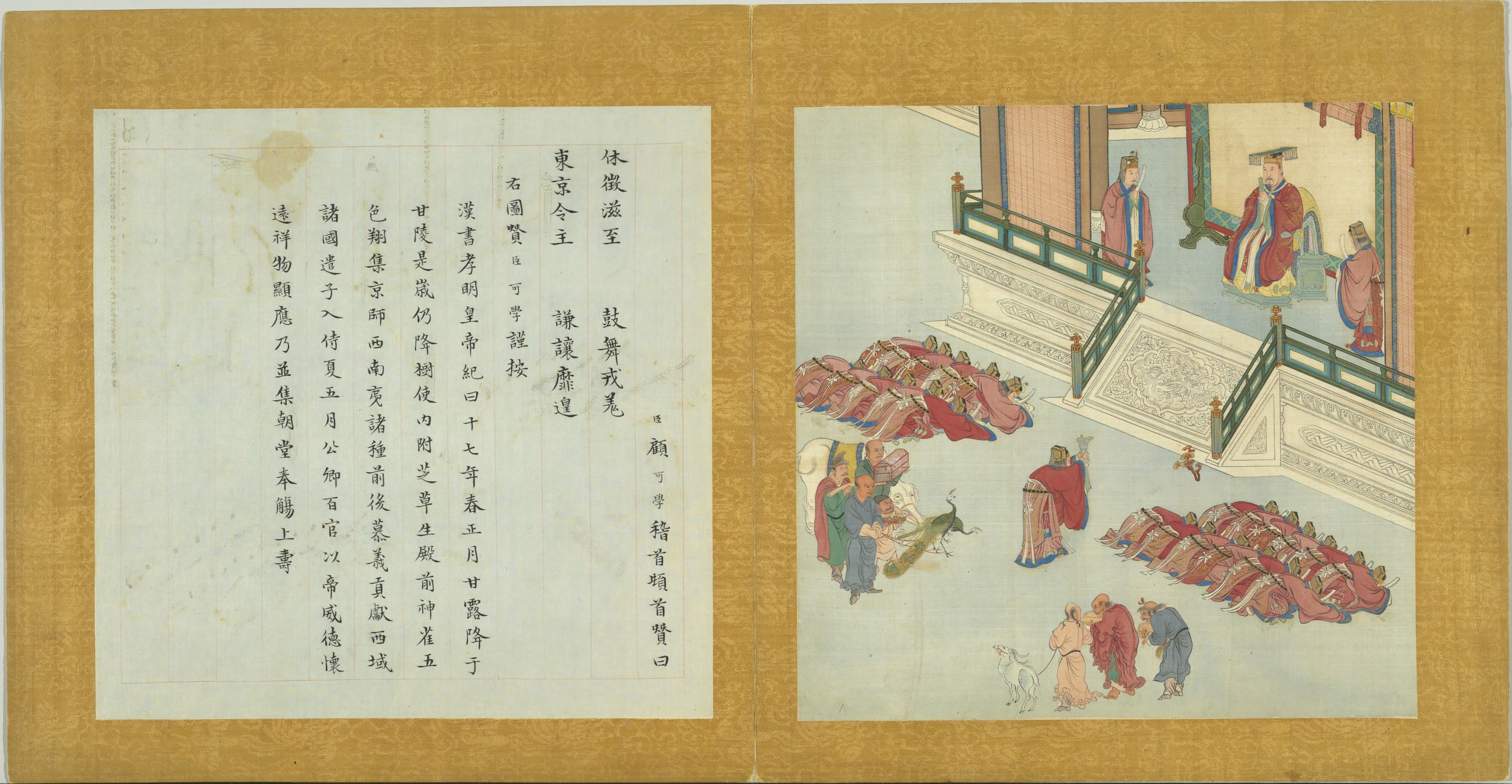 臣顧可學稽首頓首贊曰。休徵滋至。鼓舞戎羌。東京令主。謙讓靡遑。右圖贊臣可學謹按。漢書孝明皇帝紀曰。十七年春正月。甘露降于甘陵。是歲仍降。樹使內附。芝草生殿前。神雀五色翔集京師。西南夷諸種前後慕義貢獻。西域諸國遣子入侍。夏五月公卿百官以帝威德懷遠。祥物顯應。乃並集朝堂。奉觴上壽。