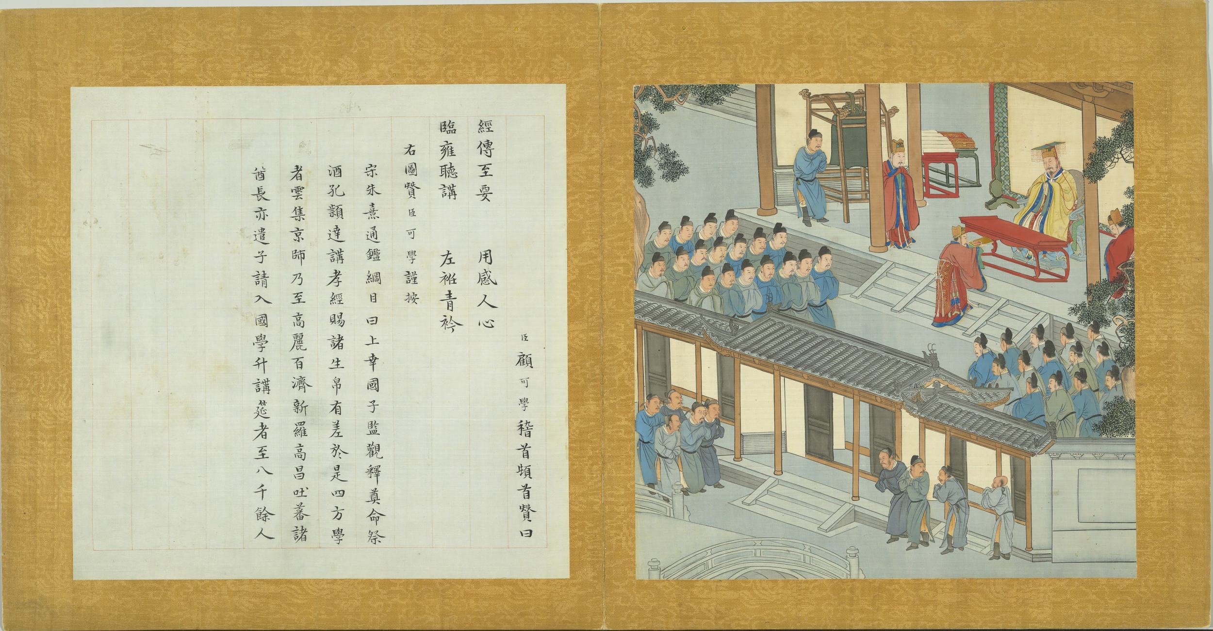 臣顧可學稽首頓首贊曰。經傳至要。用感人心。臨雍聽講。左袵青衿。右圖贊臣可學謹按。宋朱熹通鑑綱目曰。上幸國子監。觀釋奠。命祭酒。孔穎達講孝經。賜諸生帛有差。於是四方學者雲集京師。乃至高麗。百濟。新羅。高昌。吐蕃諸首長亦遣子請入國學。升講筵者至八千餘人。