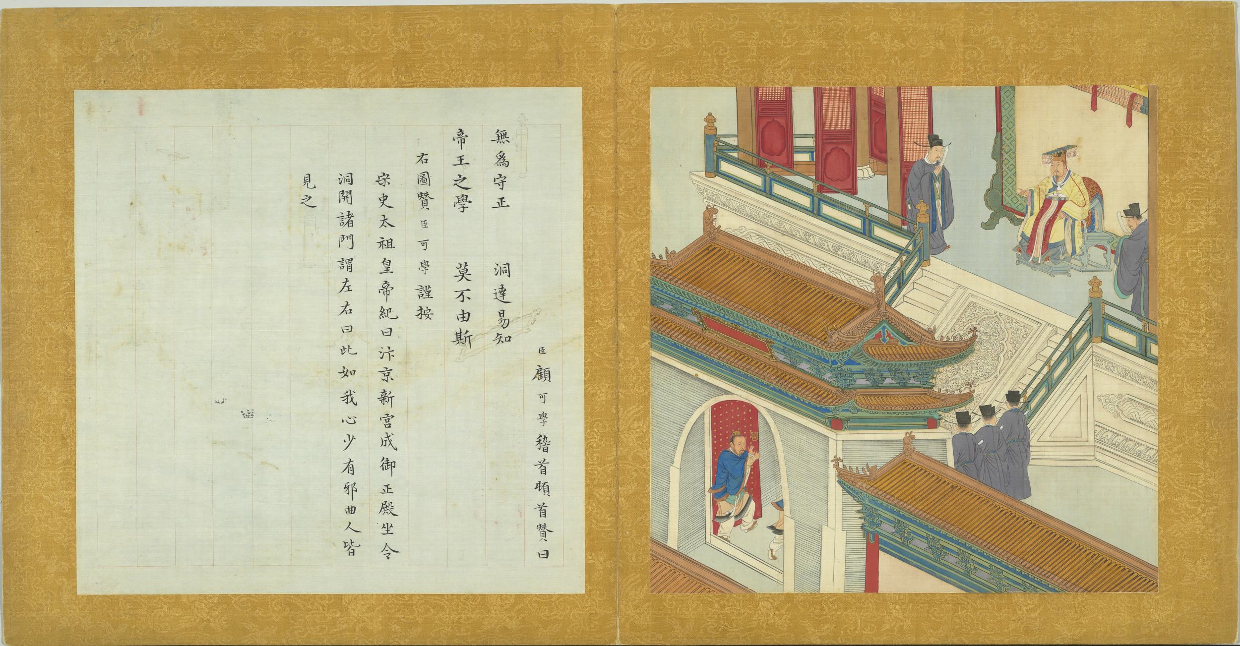 臣顧可學稽首頓首贊曰。無為守正。洞達易知。帝王之學。莫不由斯。右圖贊臣可學謹按。宋史太祖皇帝紀曰。汴京新宮成。御正殿坐。令洞開諸門。謂左右曰。此如我心。少有邪曲。人皆見之。