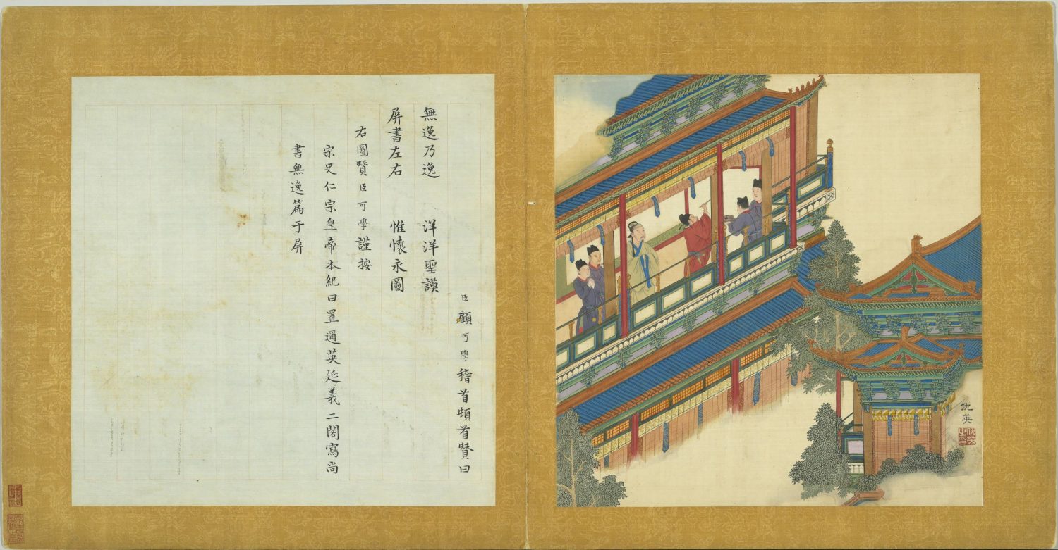 此《帝王道统万年图》册由明代仇英绘制。本册共二十幅,分别描绘伏羲至宋仁宗等名贤、帝王的事迹,对幅并有顾可学题记。应是仇英应顾氏请托而绘,用以进献朝廷,求得仕进。全册均落笔纯熟流利,色调以青绿重彩为主,间或掺用泥金钩边。此册现藏于台北故宫博物院。