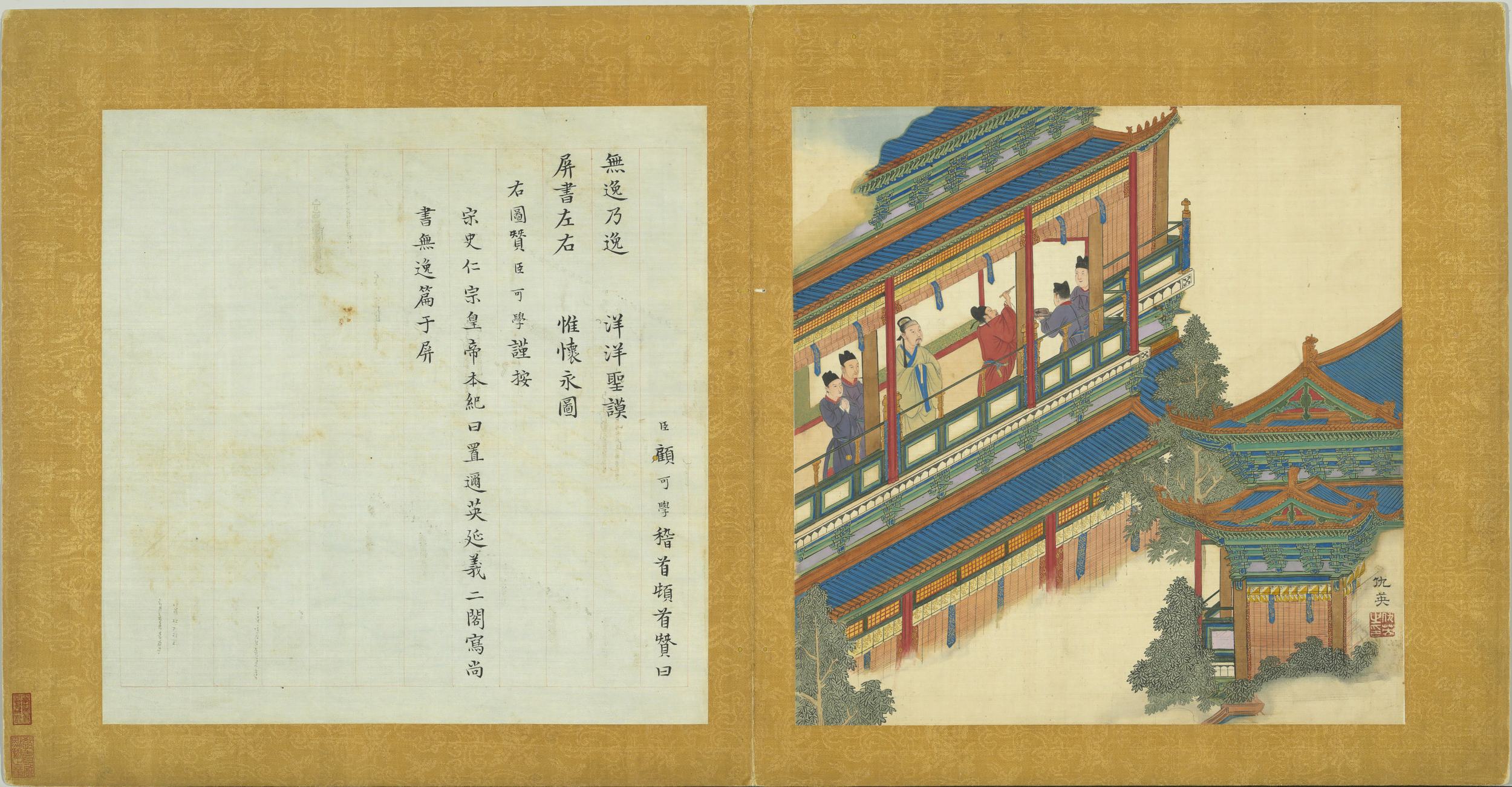 臣顧可學稽首頓首贊曰。無逸乃逸。洋洋聖謨。屏書左右。惟懷永圖。右圖贊臣可學謹按。宋史仁宗皇帝本紀曰。置邇英延義二閣。寫尚書無逸篇于屏。