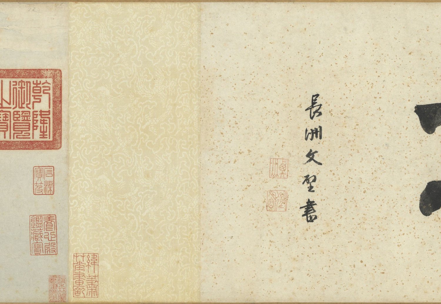 此卷是诗、书、画合璧的明代佳作。引首有文徵明隶书「釣月亭」三大字;拖尾有祝允明、都穆题跋;还有沈周、祝允明、文壁、陈璚、徐祯卿、黄云等吴中风流人物题诗句。