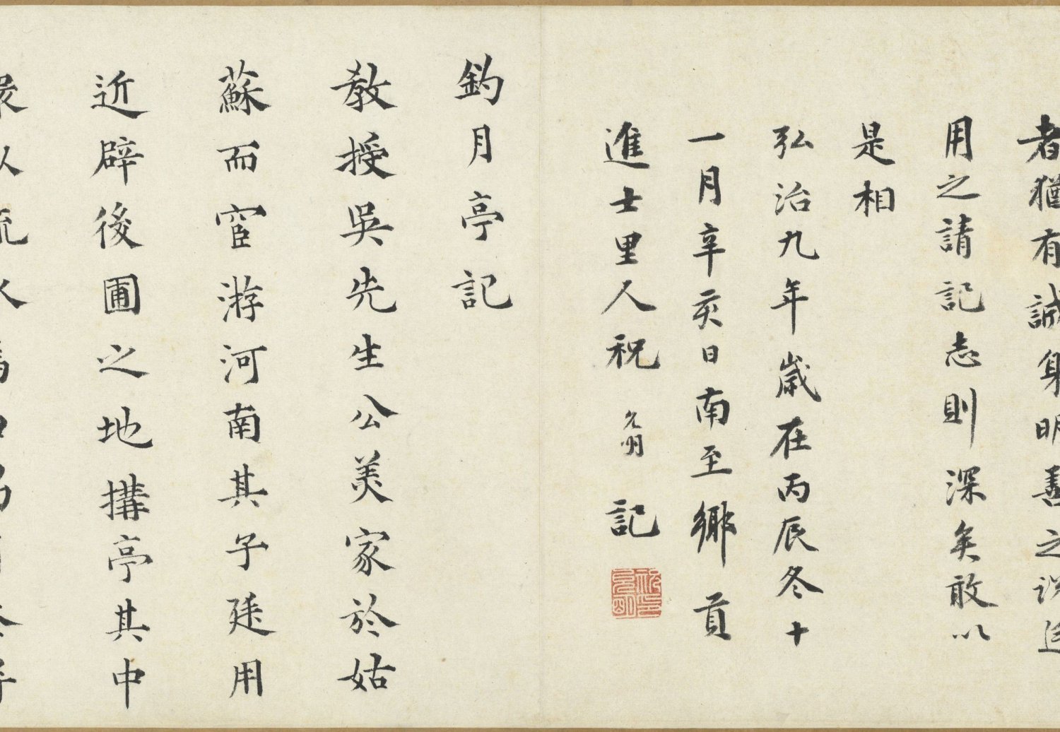 吳氏釣月亭記。人之情愈求而愈勝。天下之理愈究而愈精。蓋言之。有稽矣。始吳君廷用治一圃於舍後。種木鑿池。盡涉覽之趣。既而作一亭主之。益靚朗適人意。亭成。廷用加有喜。余問之。廷用曰。吾之為是也。將以奉吾親。吾初不言。今幸其成也。故喜。玆不謂情之愈求而勝者邪。亭之名曰釣月。亦廷用自取而邀余為記。又問之。廷用曰。夫釣隱者事也。吾家君今仕于王朝。非隱也。非若欲得龍伯大人之鰲。詹何之魚。李長庚之無氣丈夫者類也。吾為是獨以伺它日投老而設也。夫何有於竿緡而魴鯉。特以奉其觴吟之餘。弄清波蕩瑤魄。姑以寓稱於是云耳。子幸從是發撝焉。噫又非所謂理究而精者邪。余觀玆亭之勝已備。涉者旦莫輒樂而忘歸。況久處者乎。異時尊君之樂而壽也必矣。或曰子所謂涉者。我輩廷用友也。廷用之親猶未識茲亭。又烏知其樂與壽。曰記有之。不悅乎親。不信乎朋友矣。余以是推而識之。雖然進之者猶有誠身明善之說。廷用之請記志則深矣。敢以是相。弘治九年歲在丙辰冬十一月辛亥日南至鄉貢進士里人。祝允明記