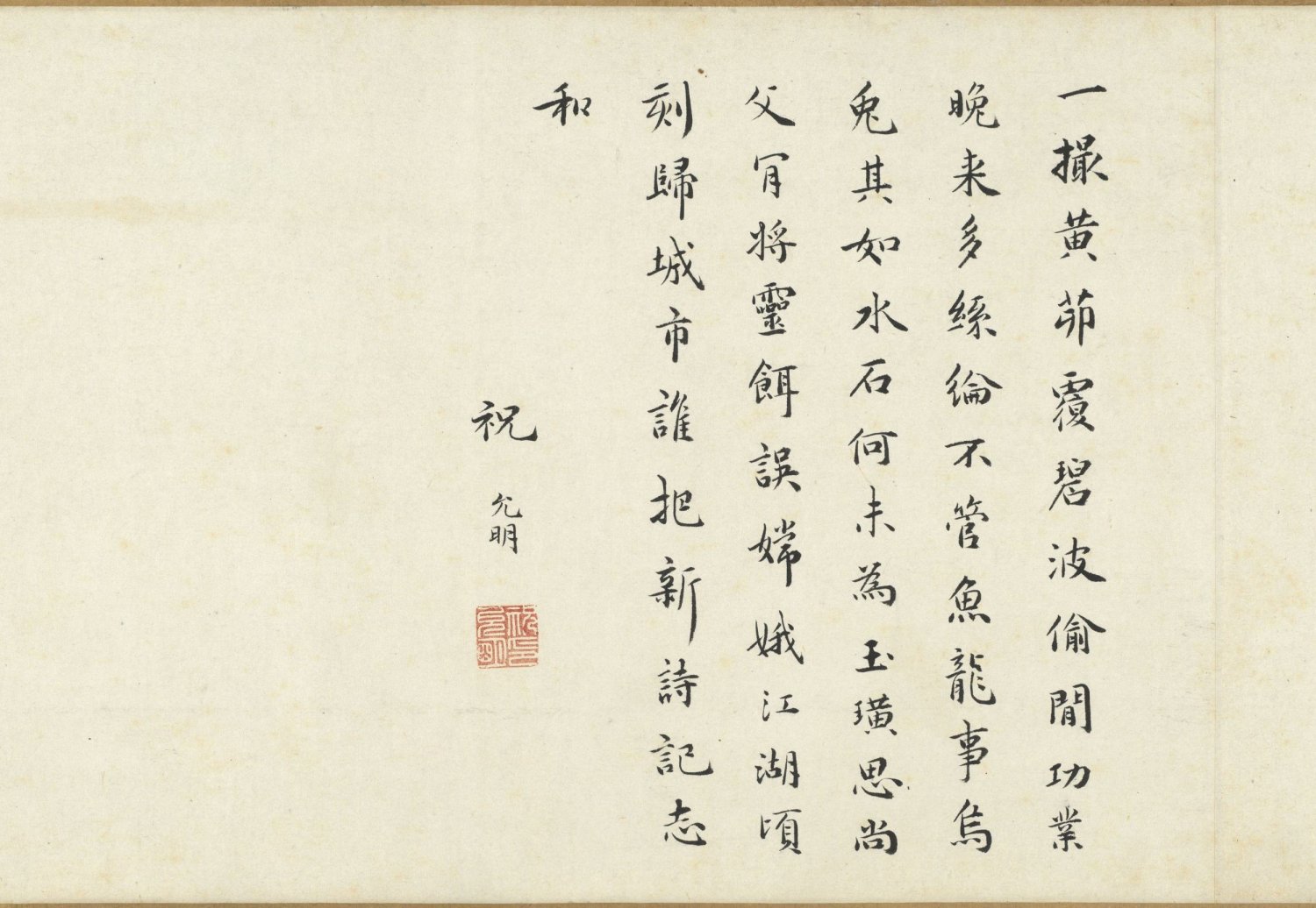 水心亭上咏滄浪。閒拂珊瑚夜氣涼。碧海欲將吾手摸。青天堪倚釣(點去)此竿長。要知水月原同相。亦把人魚付兩忘。曲曲闌干獨憑處。鬢絲零亂怯秋光。沈周