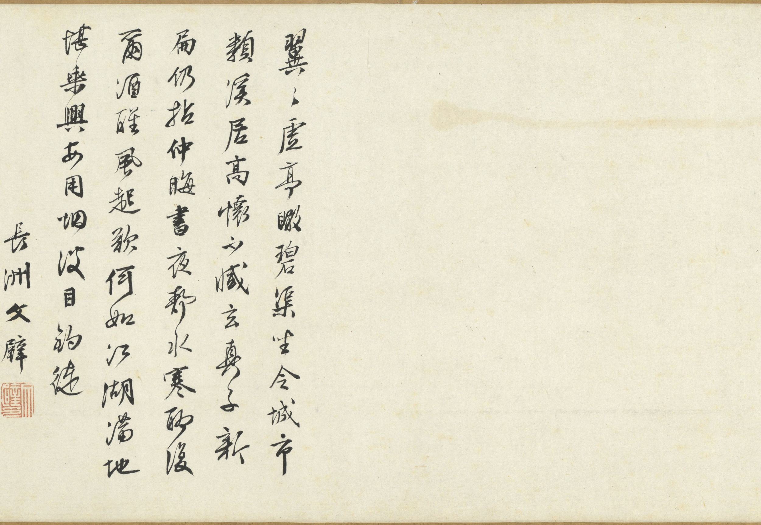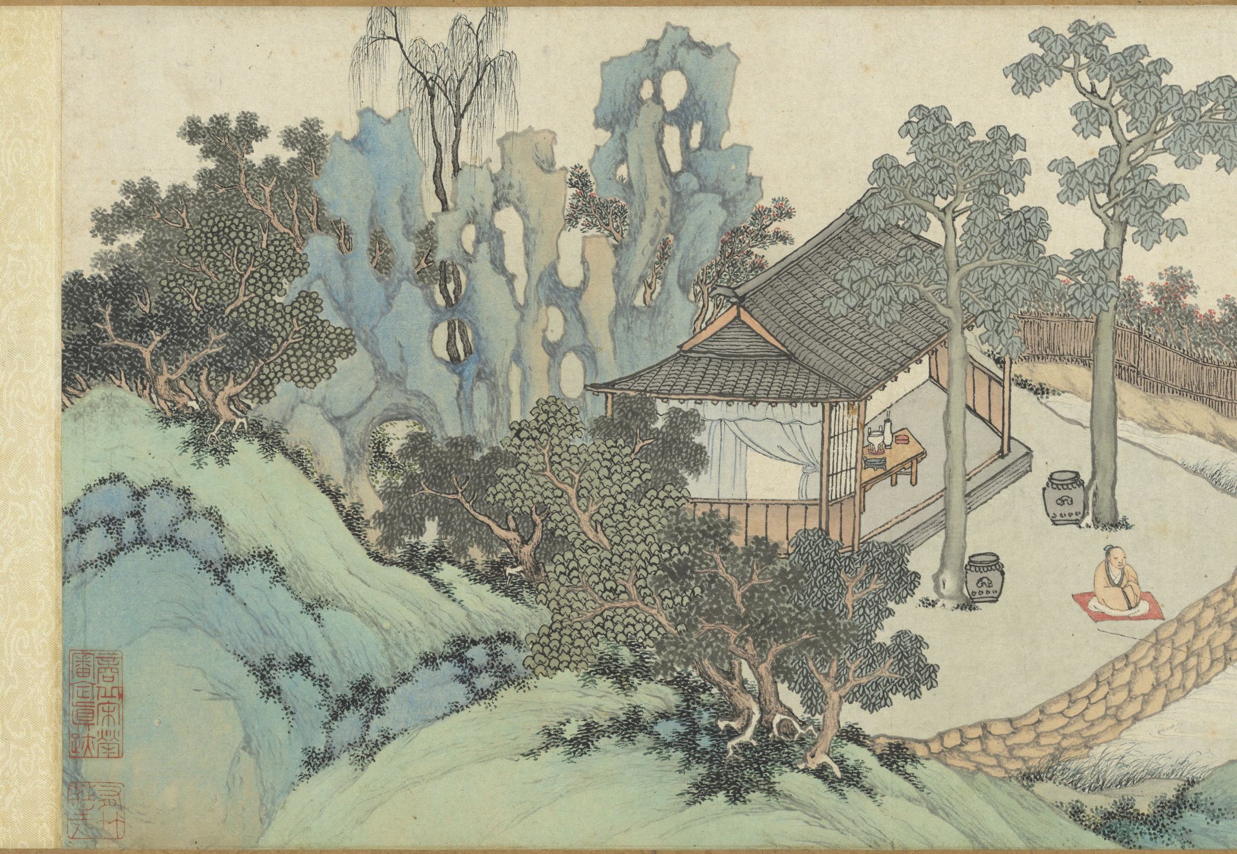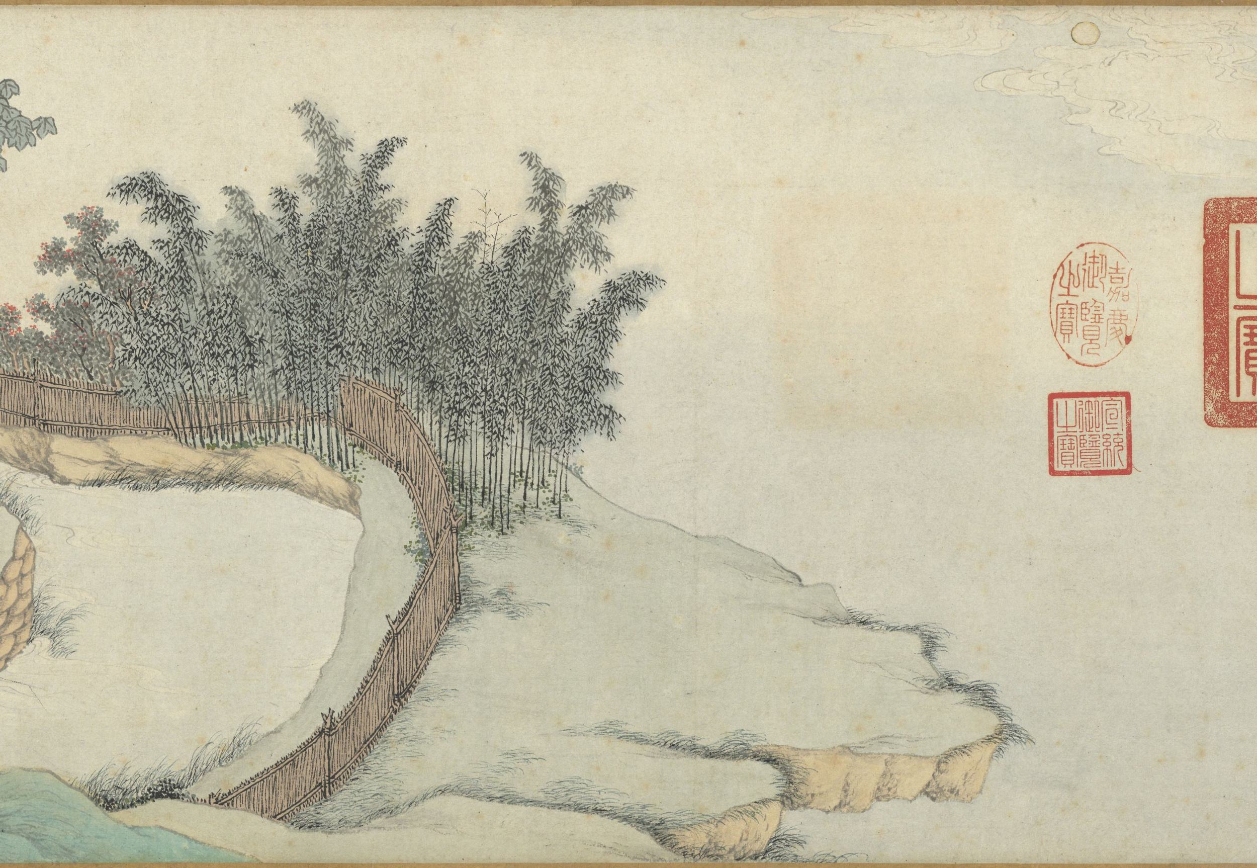 此卷画上无款,卷末钤「有竹莊主人」一印。因沈周有别业有竹居,故传为沈周所画。《石渠宝笈》著录为 “明人” 之作。