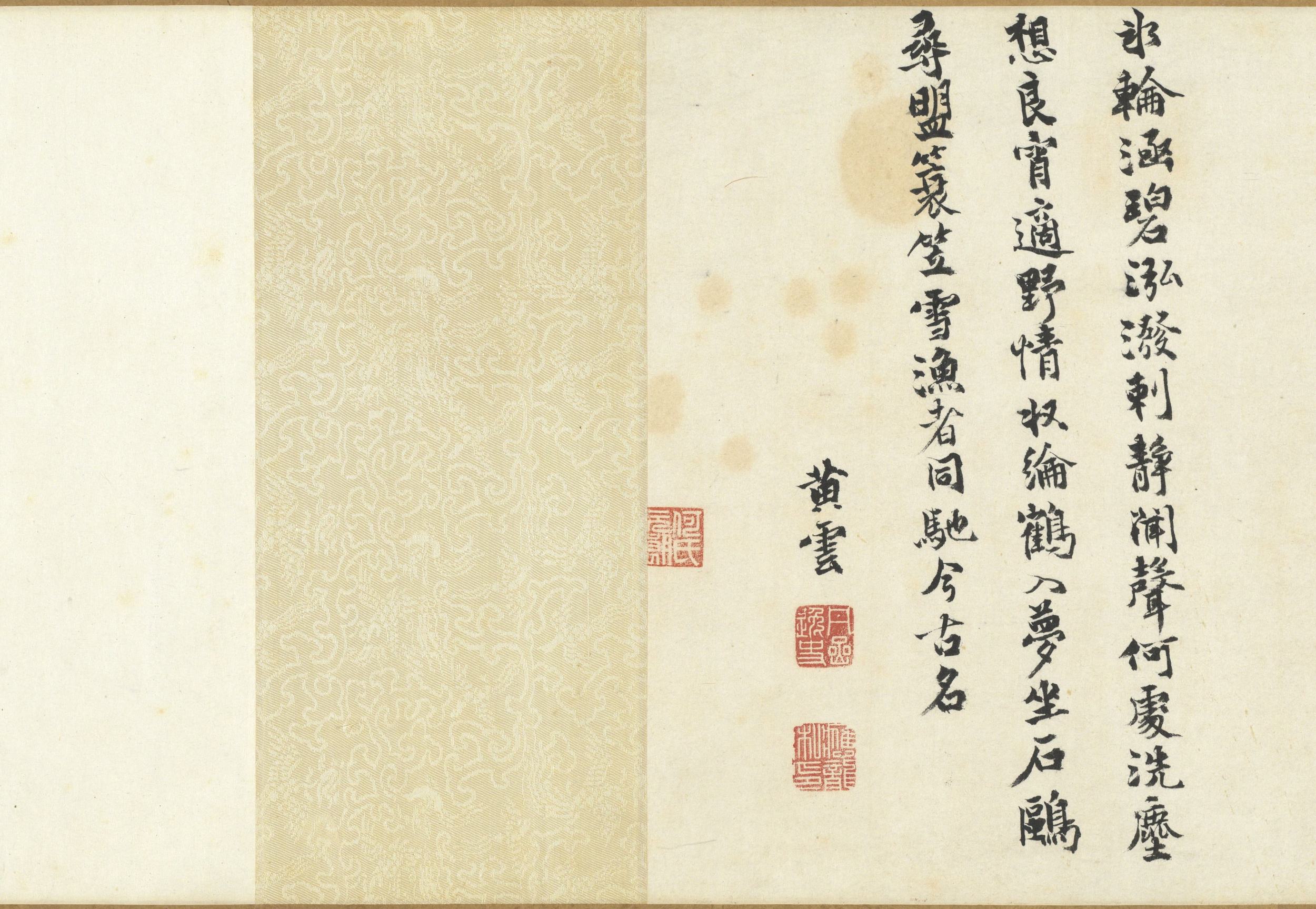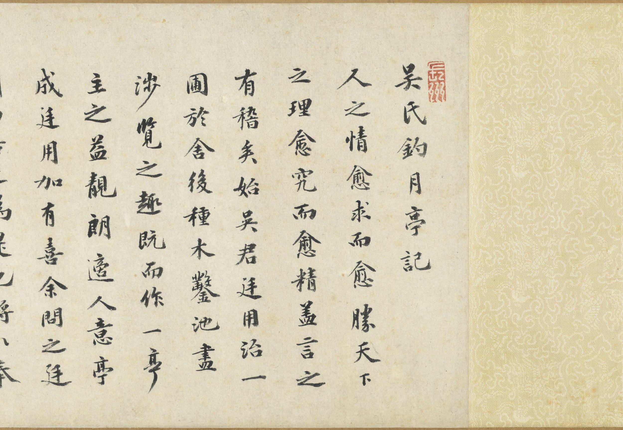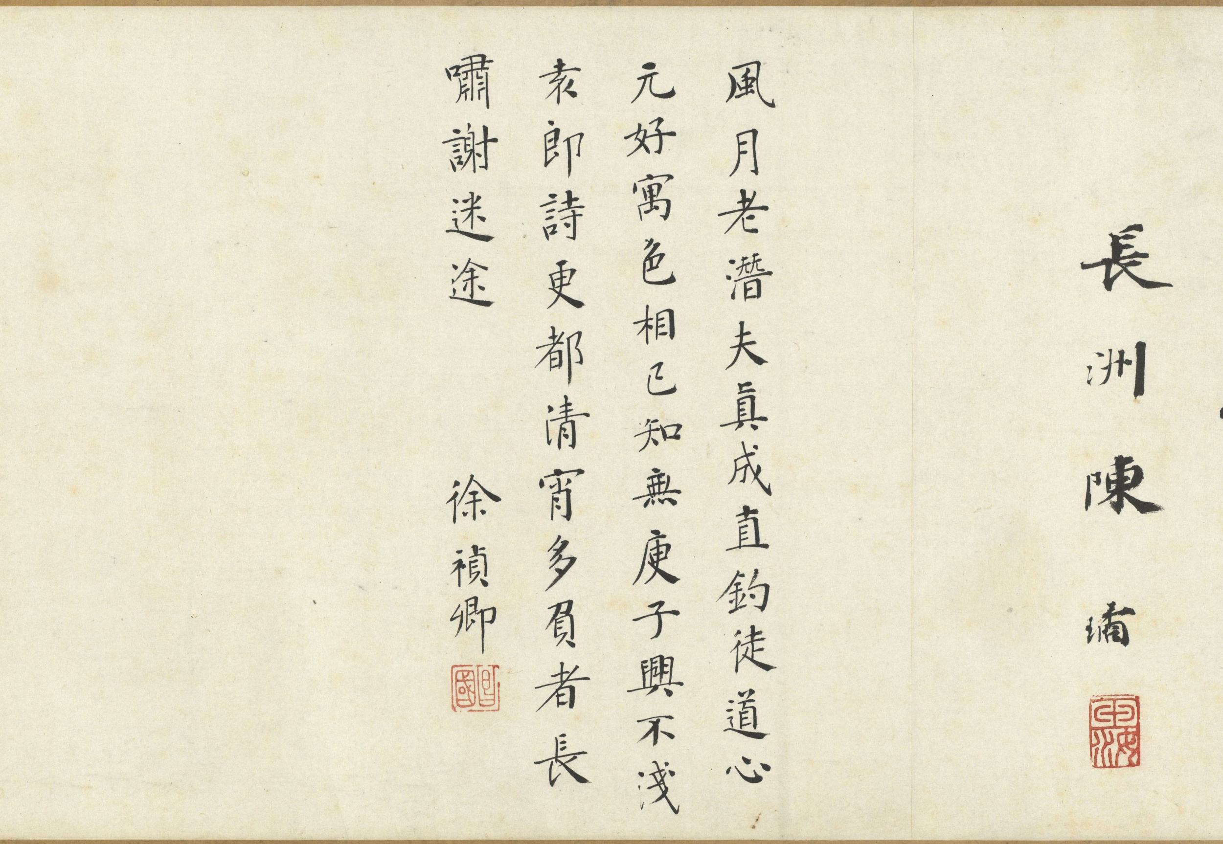 此卷是诗、书、画合璧的明代佳作。引首有文徵明隶书「釣月亭」三大字;拖尾有祝允明、都穆题跋;还有沈周、祝允明、文壁、陈璚、徐祯卿、黄云等吴中风流人物题诗句。