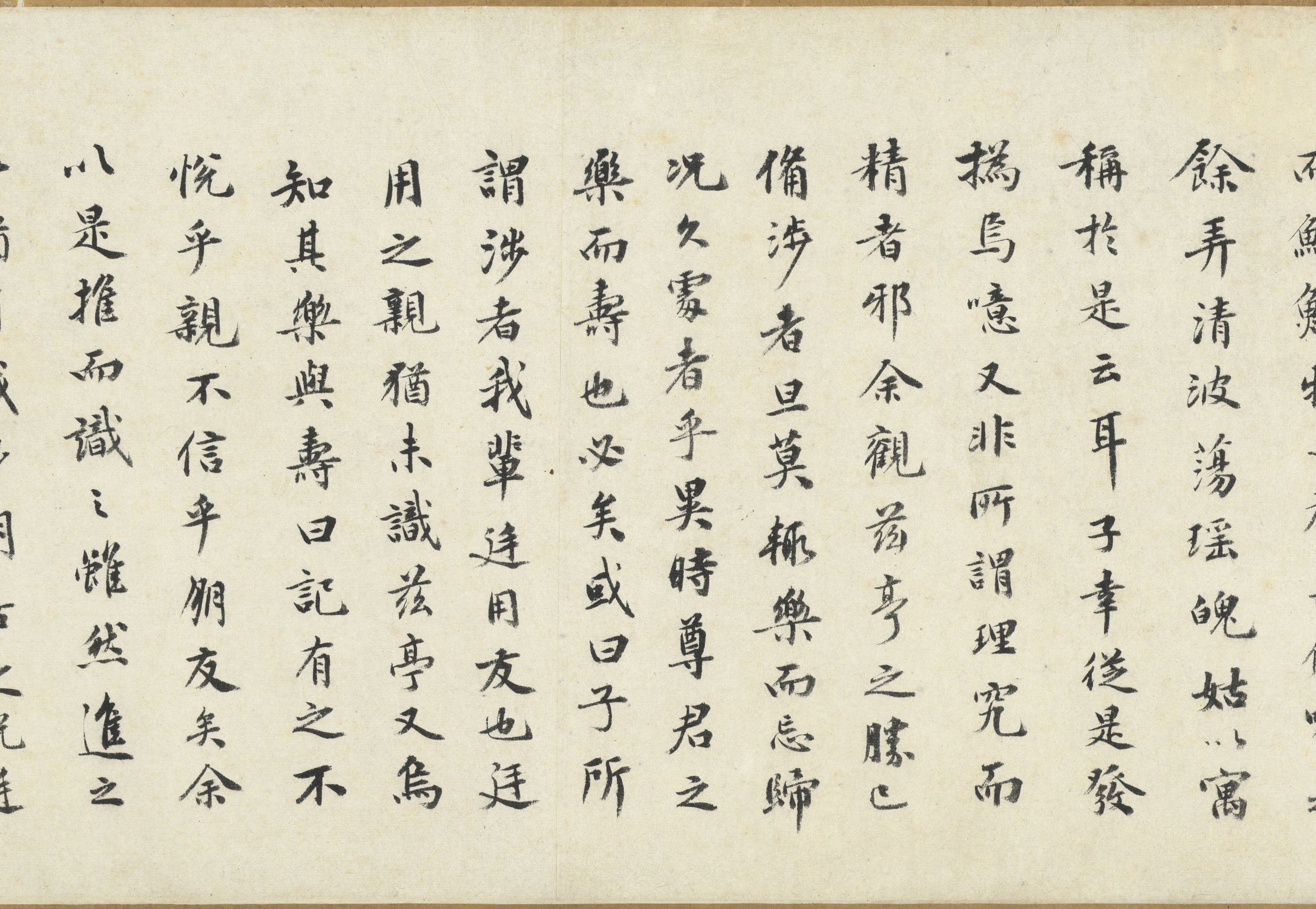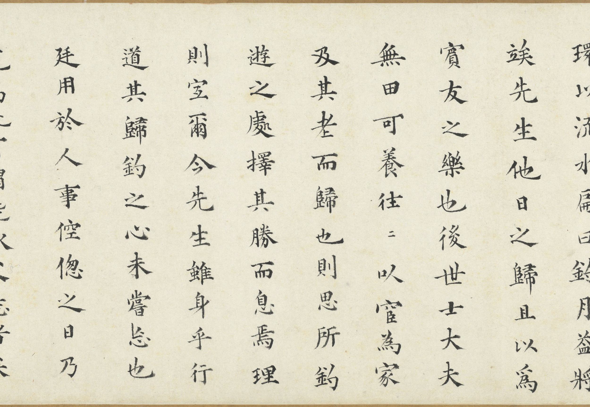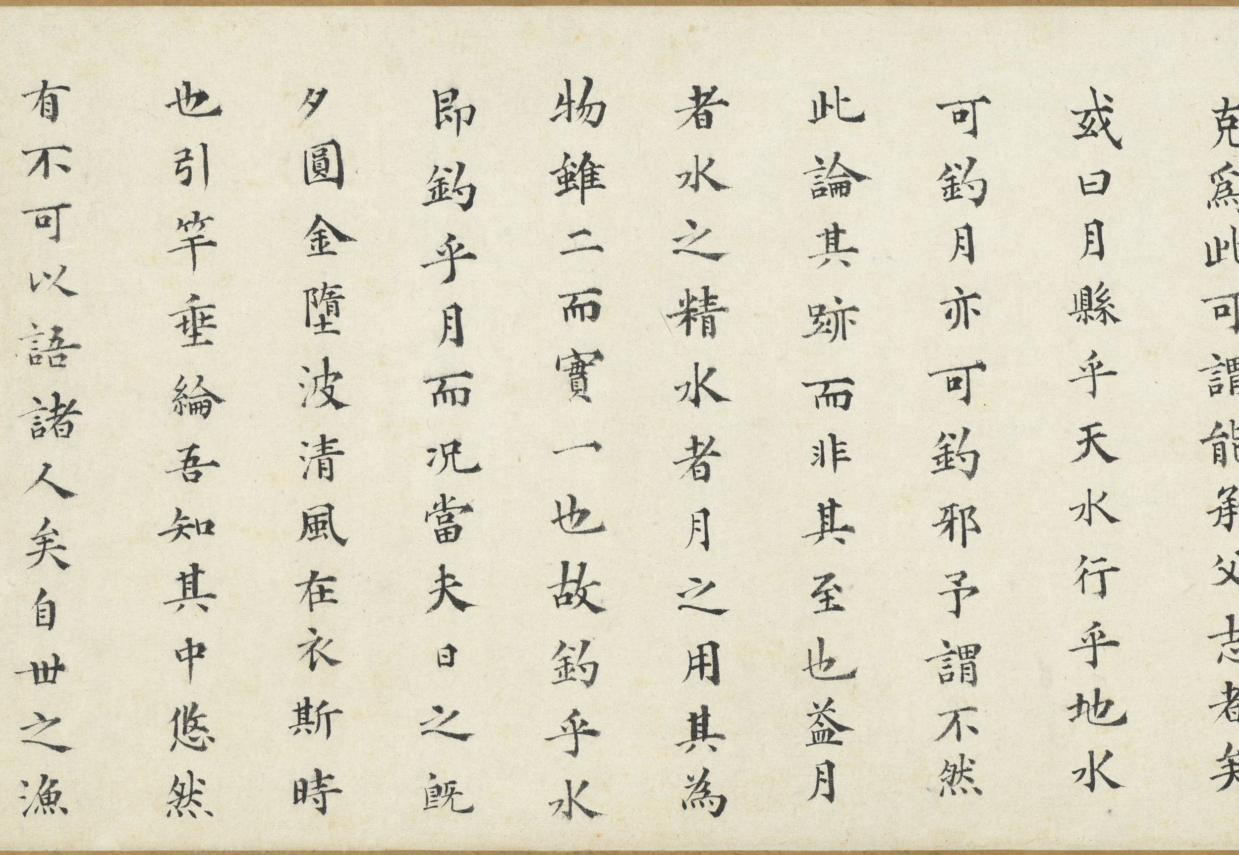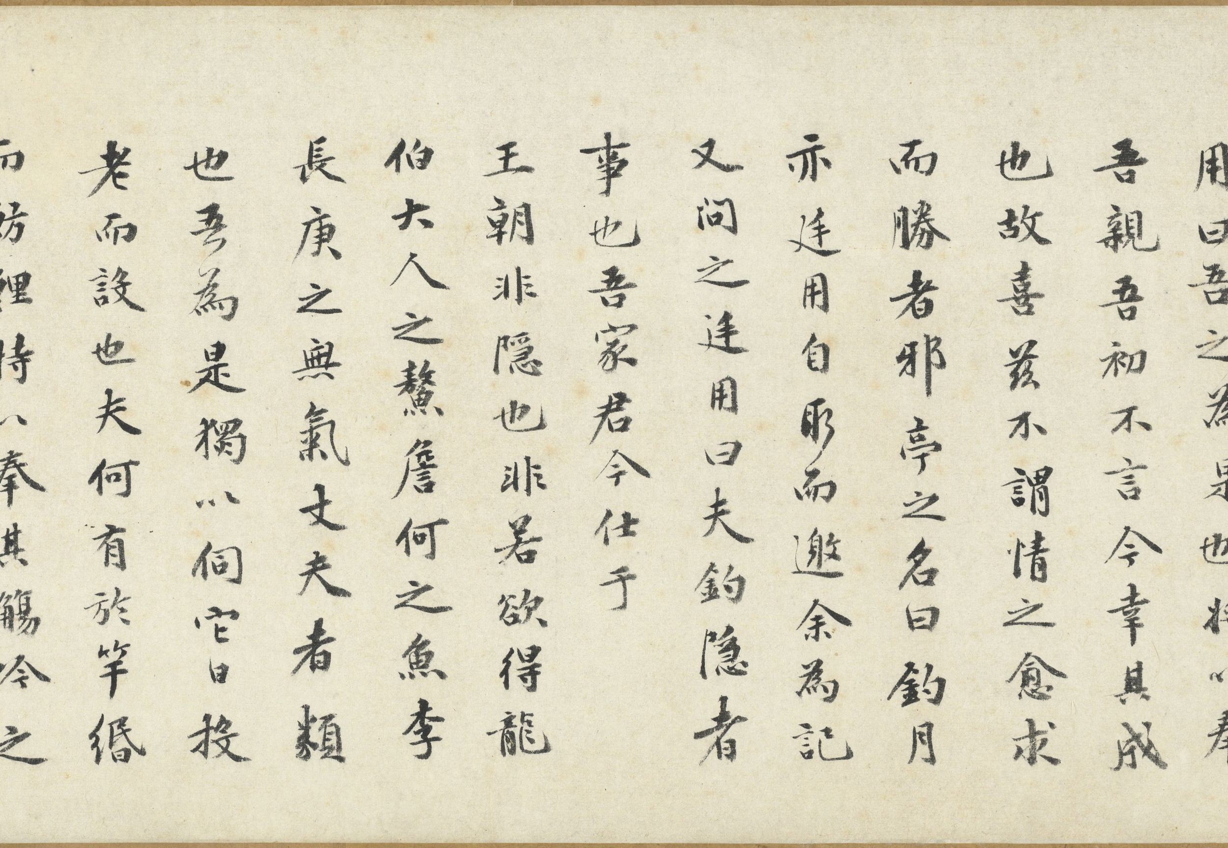 吳氏釣月亭記。人之情愈求而愈勝。天下之理愈究而愈精。蓋言之。有稽矣。始吳君廷用治一圃於舍後。種木鑿池。盡涉覽之趣。既而作一亭主之。益靚朗適人意。亭成。廷用加有喜。余問之。廷用曰。吾之為是也。將以奉吾親。吾初不言。今幸其成也。故喜。玆不謂情之愈求而勝者邪。亭之名曰釣月。亦廷用自取而邀余為記。又問之。廷用曰。夫釣隱者事也。吾家君今仕于王朝。非隱也。非若欲得龍伯大人之鰲。詹何之魚。李長庚之無氣丈夫者類也。吾為是獨以伺它日投老而設也。夫何有於竿緡而魴鯉。特以奉其觴吟之餘。弄清波蕩瑤魄。姑以寓稱於是云耳。子幸從是發撝焉。噫又非所謂理究而精者邪。余觀玆亭之勝已備。涉者旦莫輒樂而忘歸。況久處者乎。異時尊君之樂而壽也必矣。或曰子所謂涉者。我輩廷用友也。廷用之親猶未識茲亭。又烏知其樂與壽。曰記有之。不悅乎親。不信乎朋友矣。余以是推而識之。雖然進之者猶有誠身明善之說。廷用之請記志則深矣。敢以是相。弘治九年歲在丙辰冬十一月辛亥日南至鄉貢進士里人。祝允明記