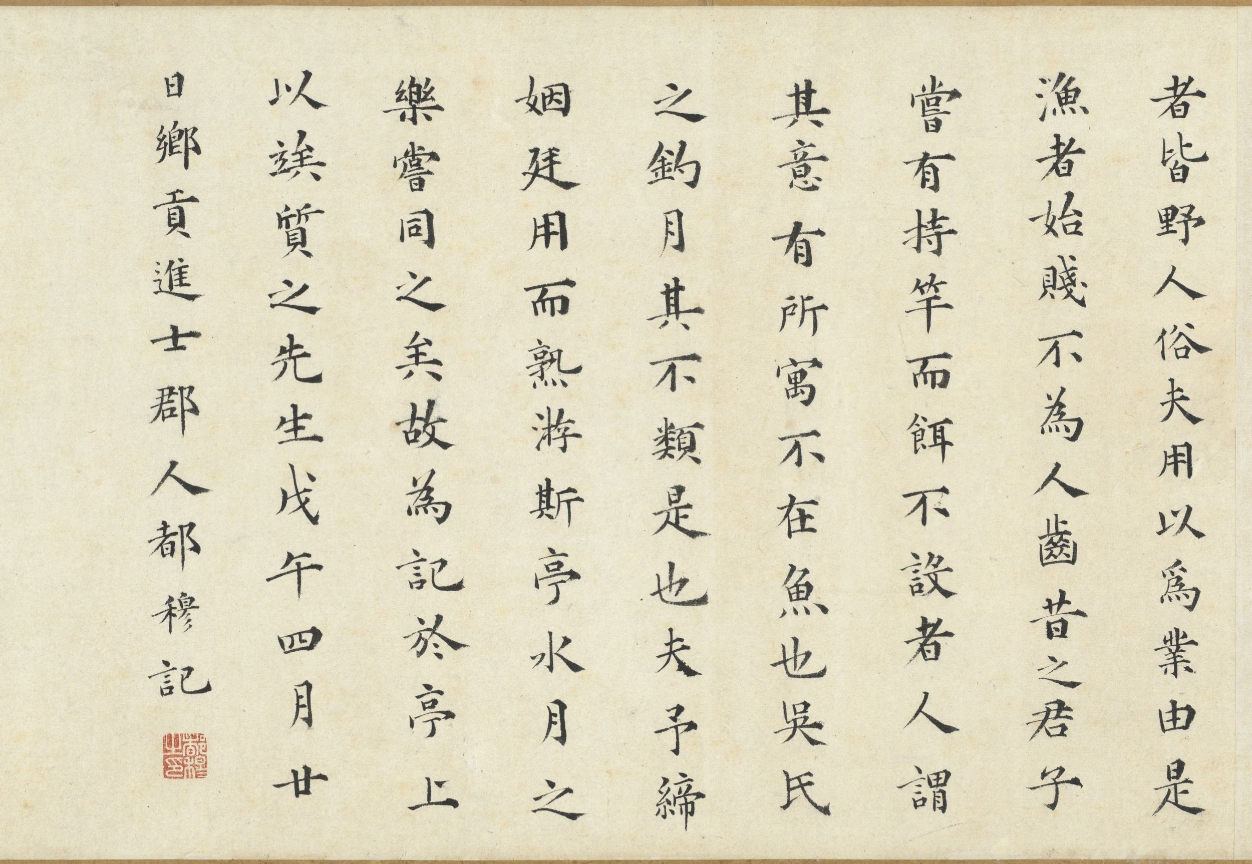 釣月亭記。教授吳先生公美。家於姑蘇而宦游河南。其子廷用。近辟後圃之地。搆亭其中。環以流水。扁曰釣月。蓋將竢先生他日之歸。且以為賓友之樂也。後世士大夫無田可養。往往以宦為家。及其老而歸也。則思所釣遊之處。擇其勝而息焉。理則宜爾。今先生雖身乎行道。其歸釣之心。未嘗忘也。廷用於人事倥傯之日。乃克為此。可謂能承父志者矣。或曰月縣乎天。水行乎地。水可釣。月亦可釣邪。予謂不然。此論其跡。而非其至也。蓋月者水之精。水者月之用。其為物雖二。而實一也。故釣乎水即釣乎月。而況當夫日之既夕。圓金墮波。清風在衣。斯時也。引竿垂綸。吾知其中悠然。有不可以語諸人矣。自世之漁者。皆野人俗夫用以為業。由是漁者始賤。不為人齒。昔之君子。嘗有持竿而餌不設者。人謂其意有所寓。不在魚也。吳氏之釣月其不類是也。夫予締姻廷用。而熟游斯亭。水月之樂。嘗同之矣。故為記於亭上。以竢質之先生。戊午四月廿日鄉貢進士郡人都穆記