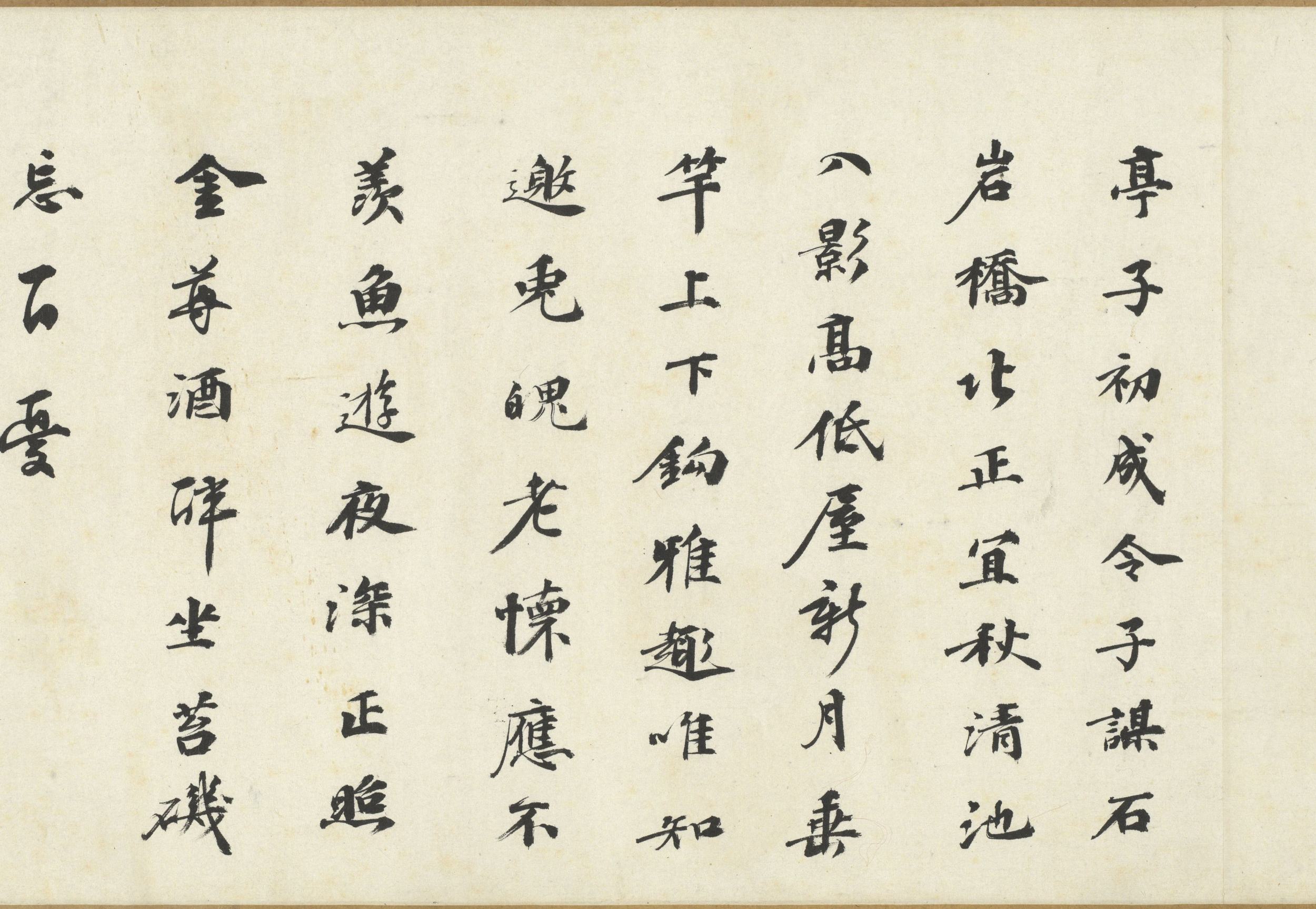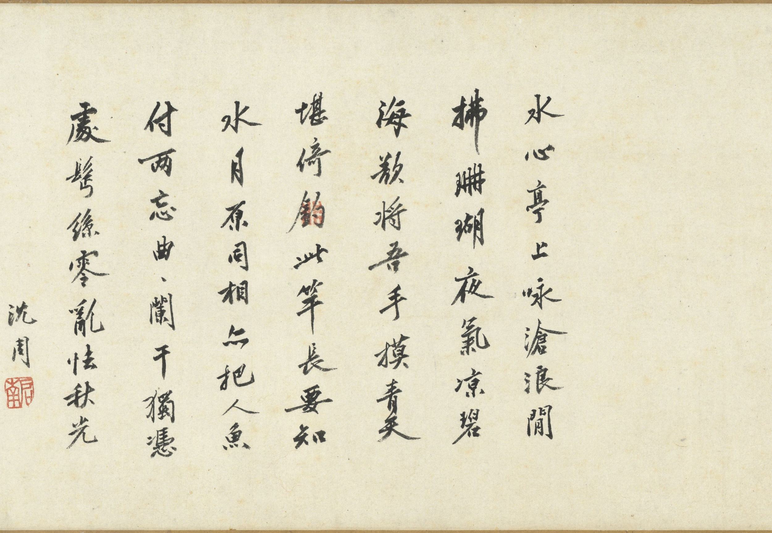 水心亭上咏滄浪。閒拂珊瑚夜氣涼。碧海欲將吾手摸。青天堪倚釣(點去)此竿長。要知水月原同相。亦把人魚付兩忘。曲曲闌干獨憑處。鬢絲零亂怯秋光。沈周