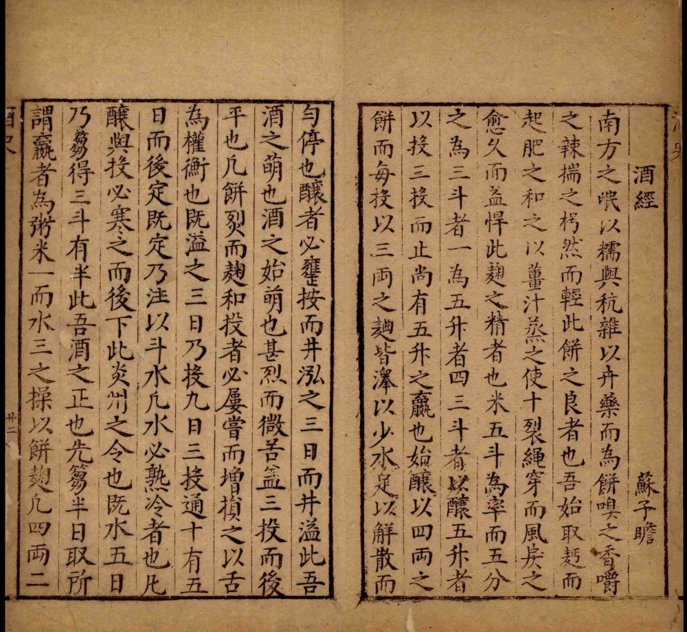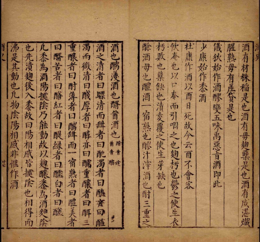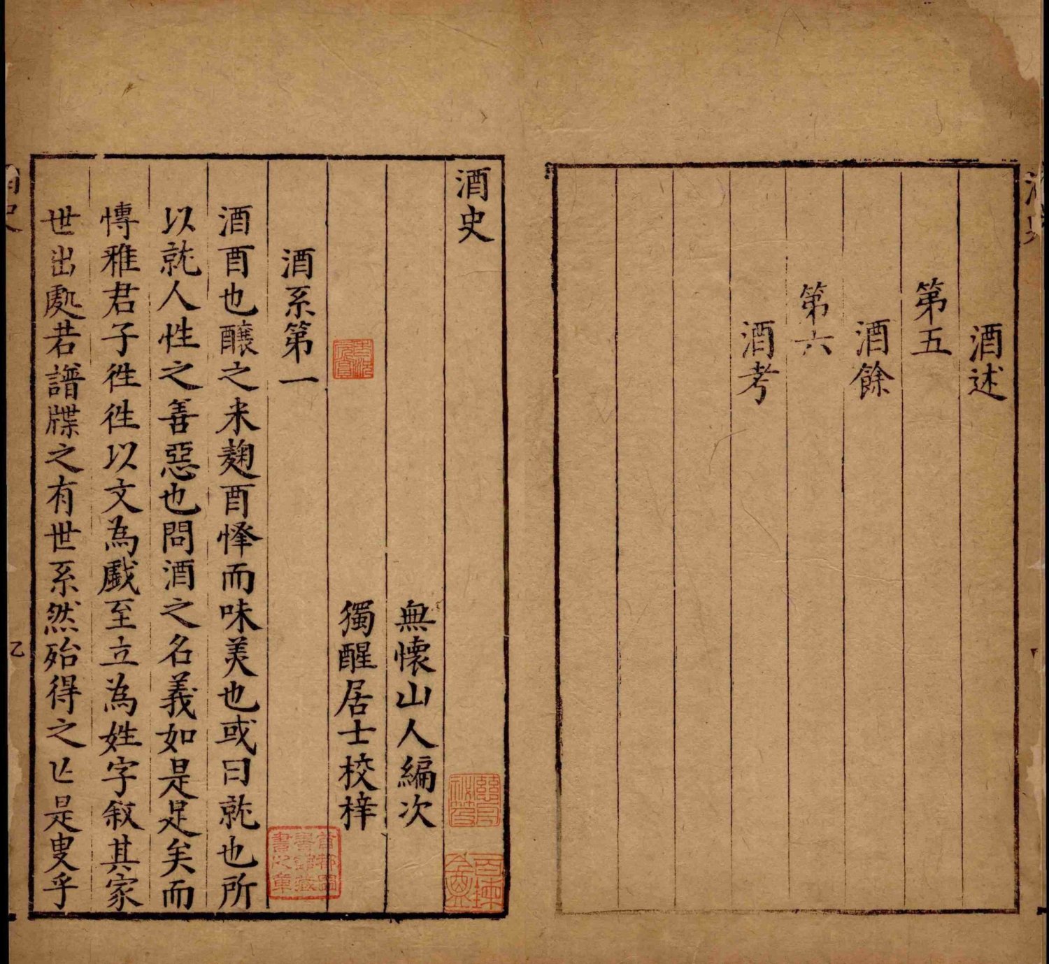 此《酒史》由明代冯时化编撰。全书分上下两卷,内容包含:酒系、酒品、酒献、酒述、酒馀和酒考共六部分,记述了酒的起源沿革、酒名产地、酒德酒趣、酒令酒器以及名人评酒的诗词、歌赋和掌故等内容。这是一部比较完整的酒文化专著。此为明隆庆四年独醒居士刊本。