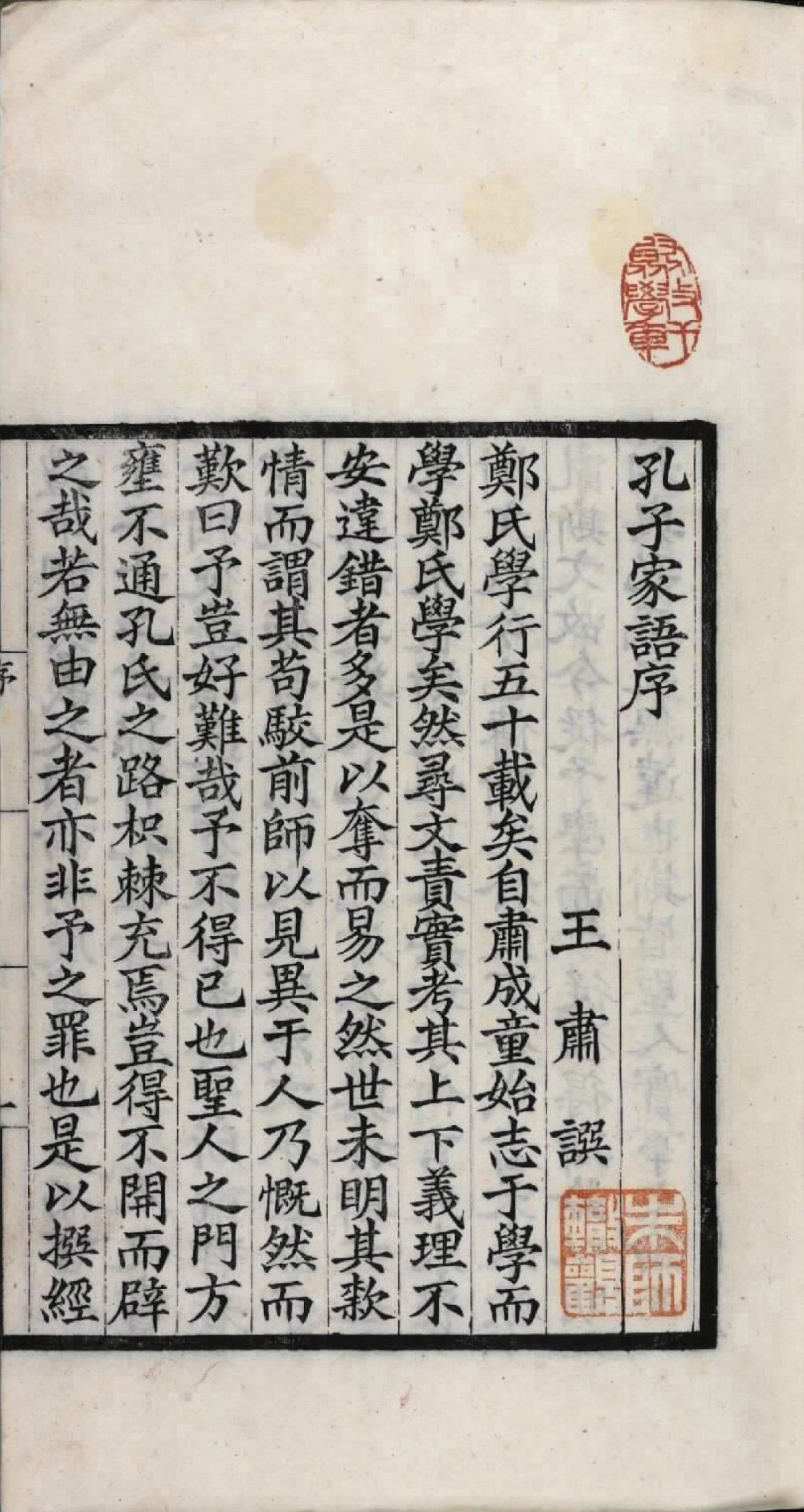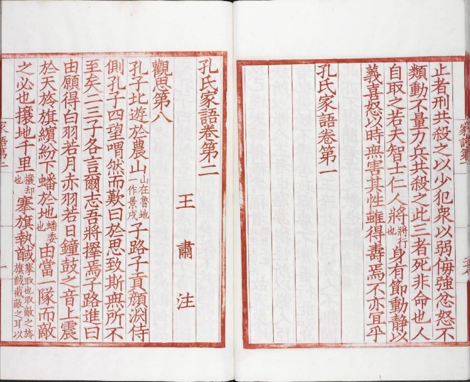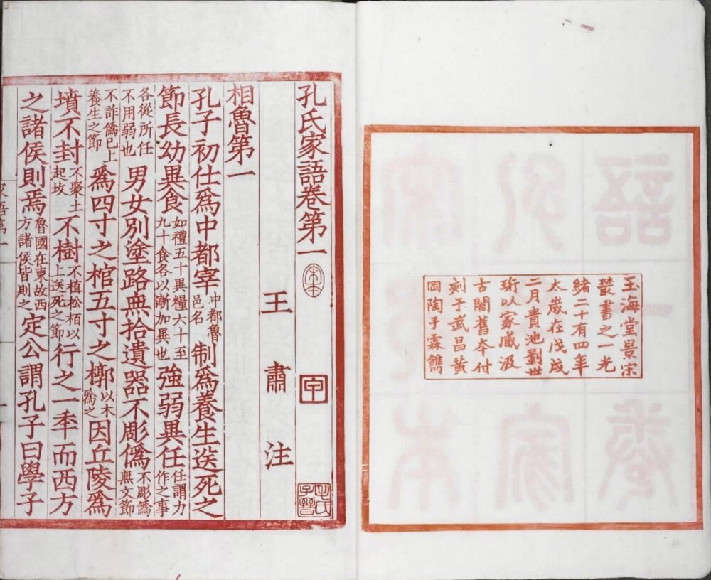 《孔子家语》是一部记录孔子及孔门弟子思想言行的著作。其内容或是自汉朝以前到汉朝早期不断编纂而成,后来王肃注对其整理注解。今传本共十卷(原二十七卷),四十四篇。此内含明隆庆六年徐祚锡长洲刊本,清光绪二十四年贵池刘氏玉海堂景宋蜀刊朱印及墨印本。