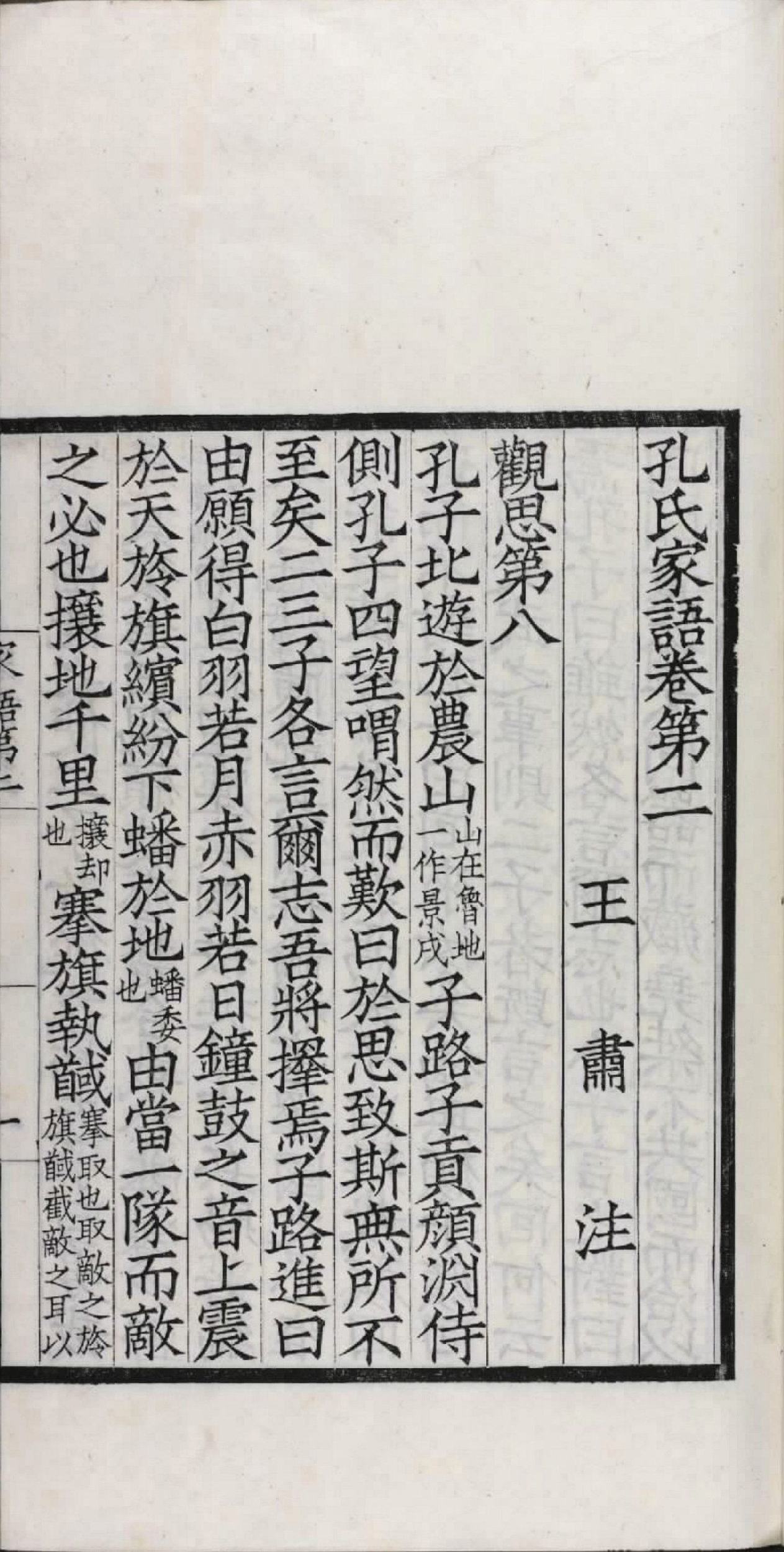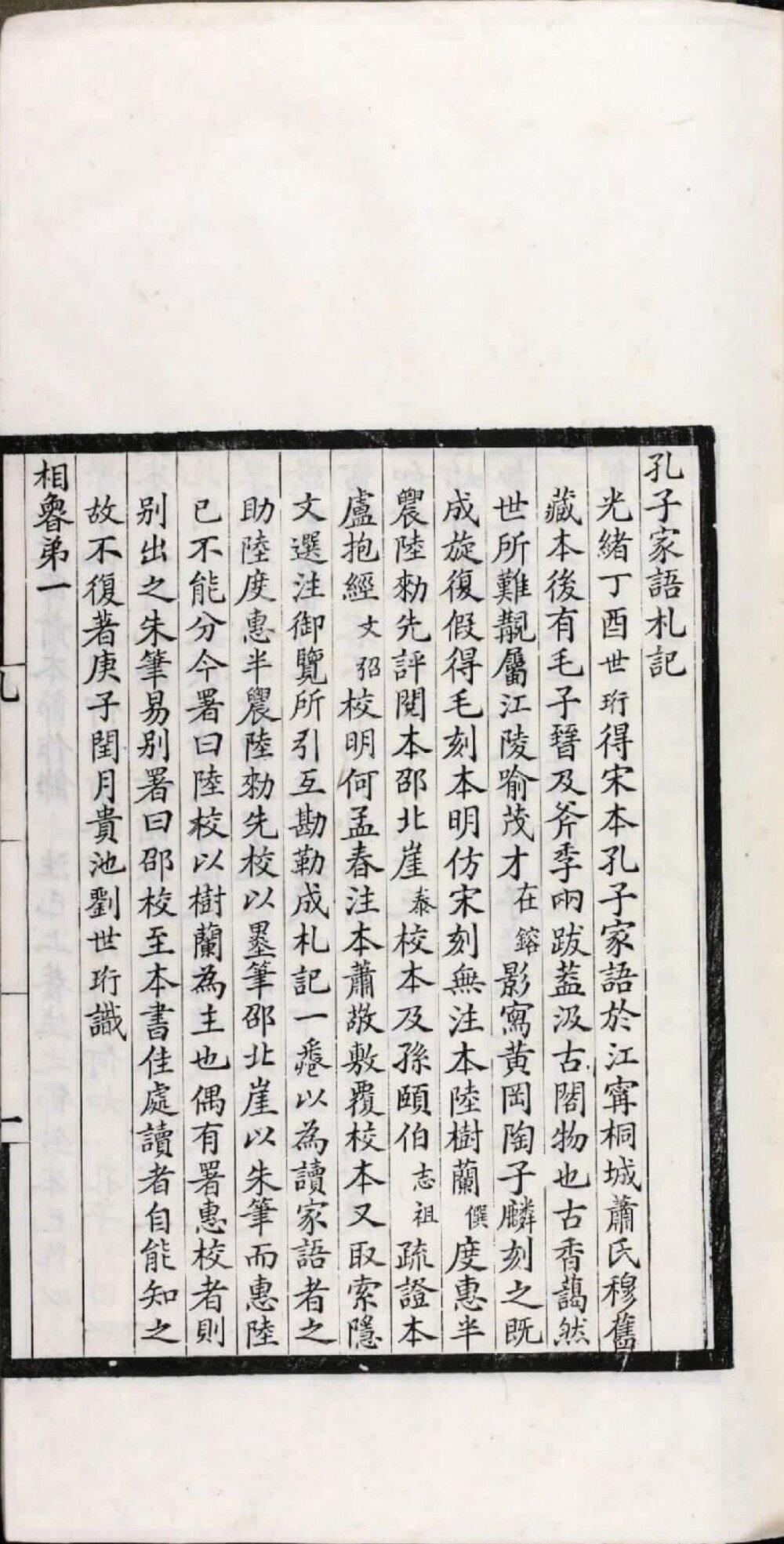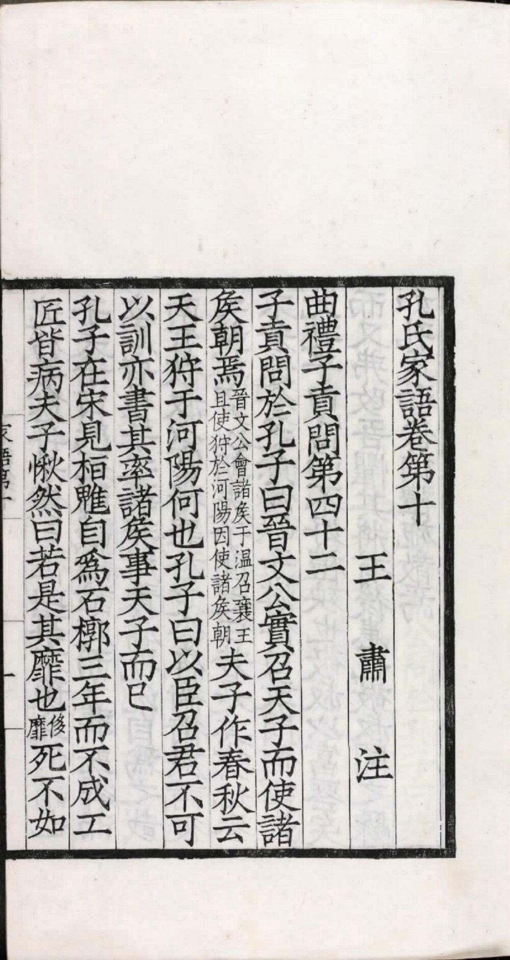 此明隆庆六年徐祚锡长洲刊本 [1] 或即明嘉靖陆治补注本 《孔子家语》共十卷,四十四篇,始于:相鲁第一。终于:七十二弟子解第四十四。后附孔安国传略。此套每册首、末半叶均系钞配。