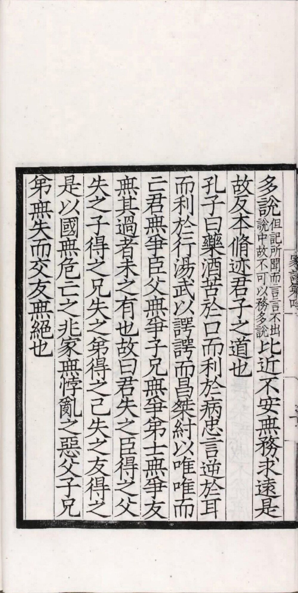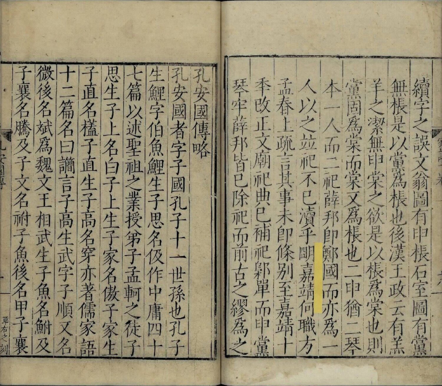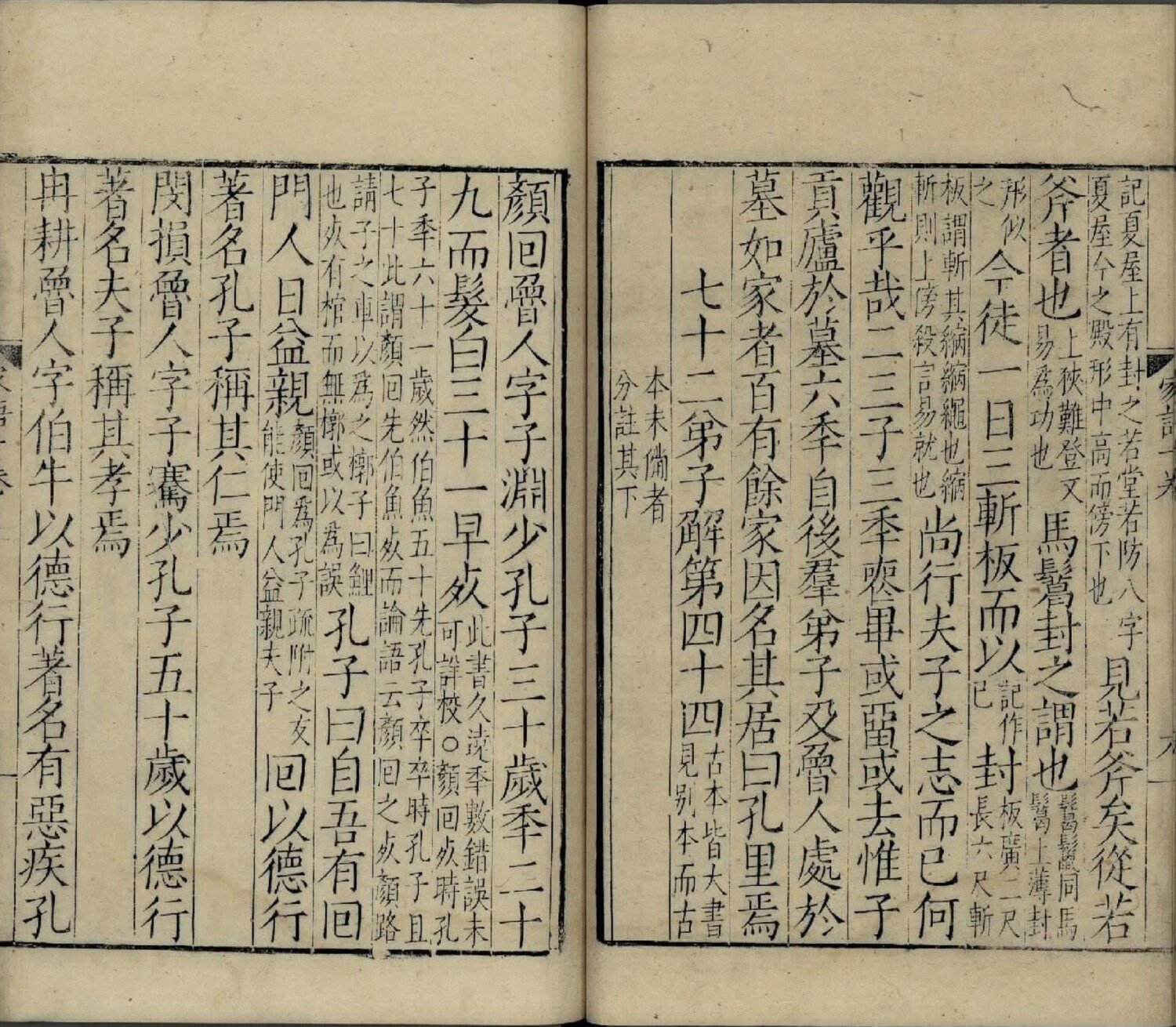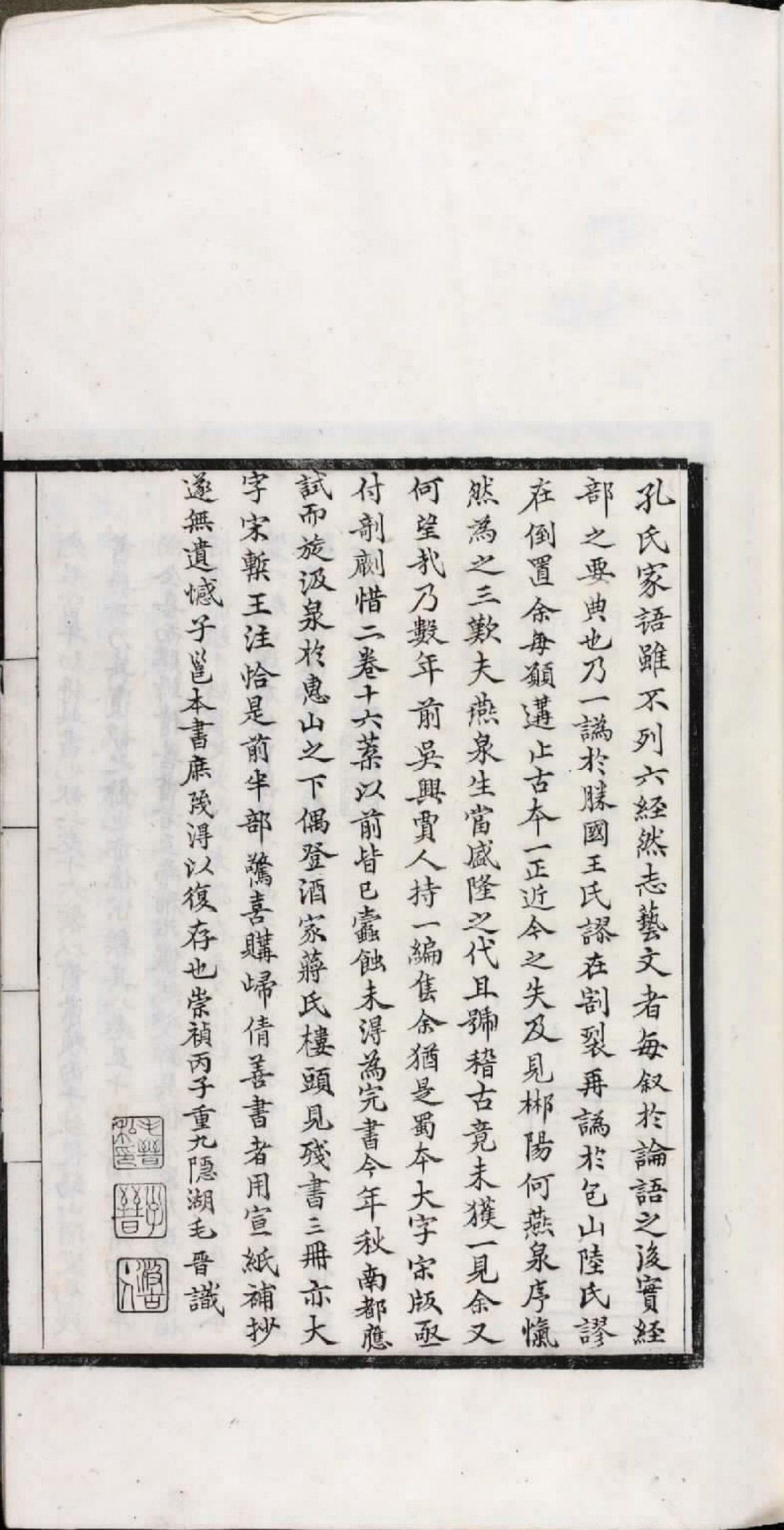 此明隆庆六年徐祚锡长洲刊本 [1] 或即明嘉靖陆治补注本 《孔子家语》共十卷,四十四篇,始于:相鲁第一。终于:七十二弟子解第四十四。后附孔安国传略。此套每册首、末半叶均系钞配。