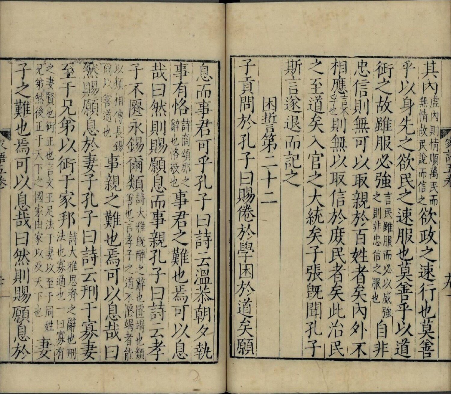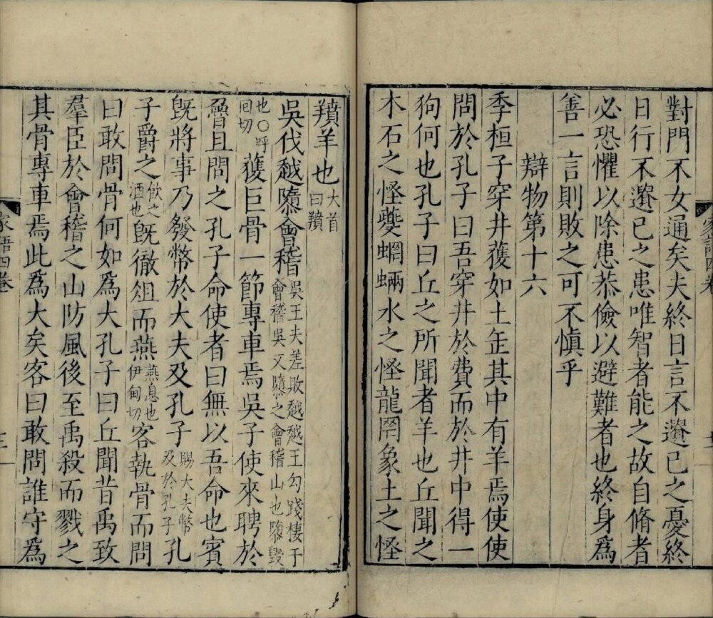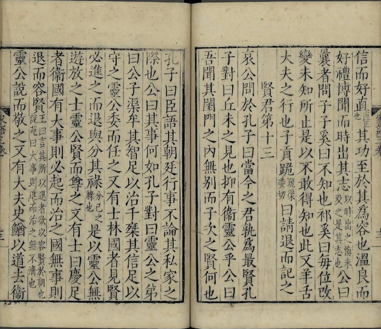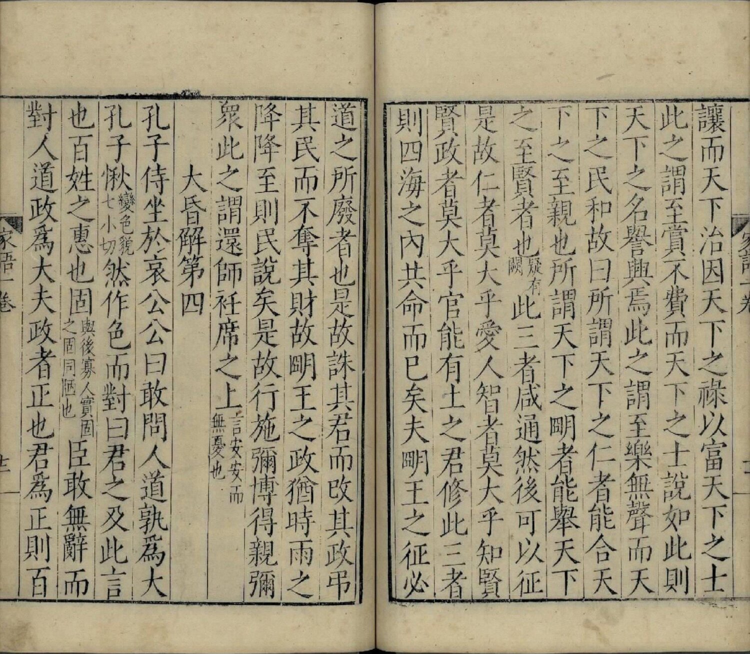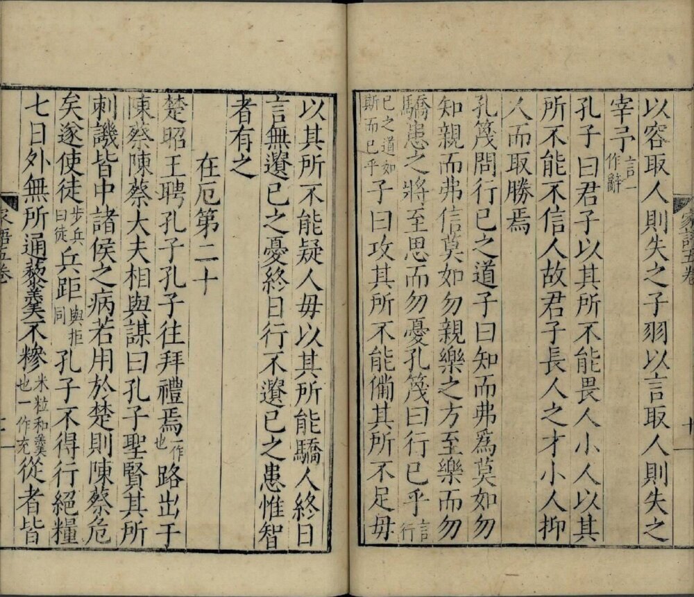 四册,框 22.8x17.8 厘米,九行行十七字,左右双栏,版心黑口,中缝中记家语第几及叶次