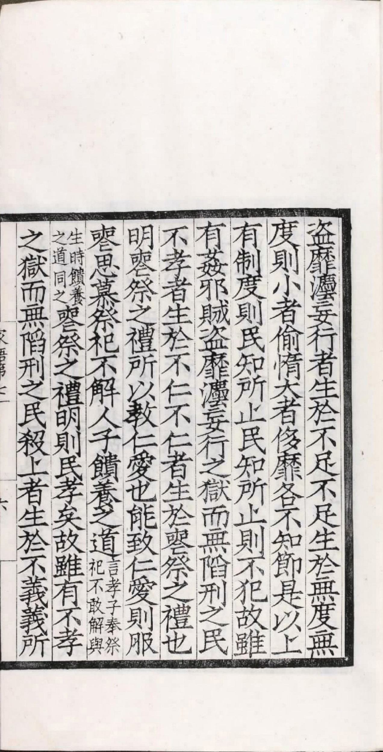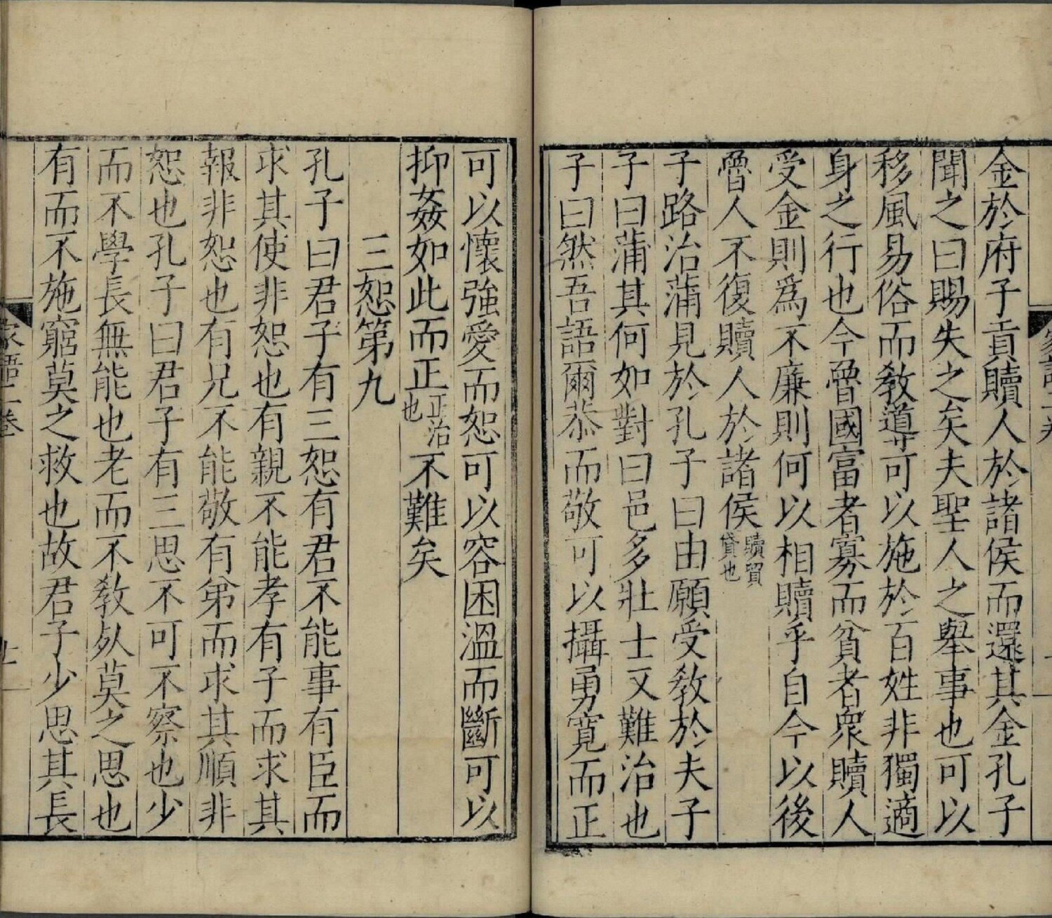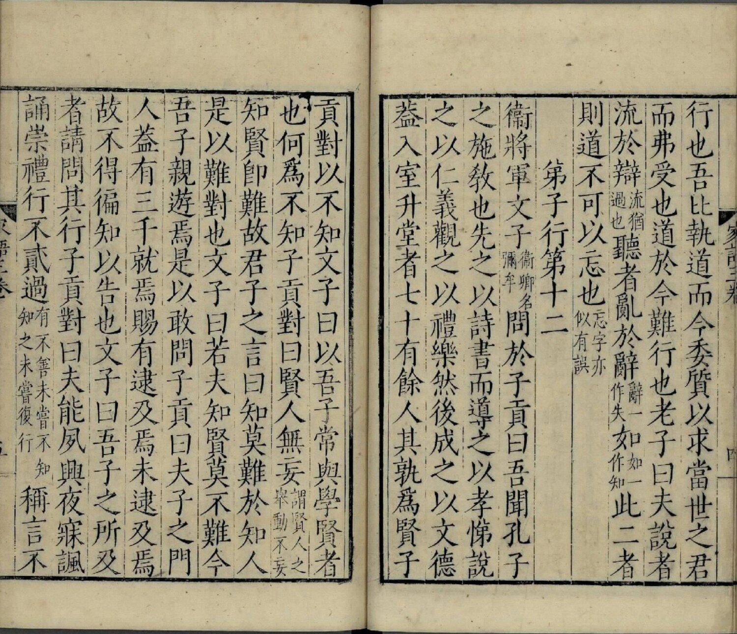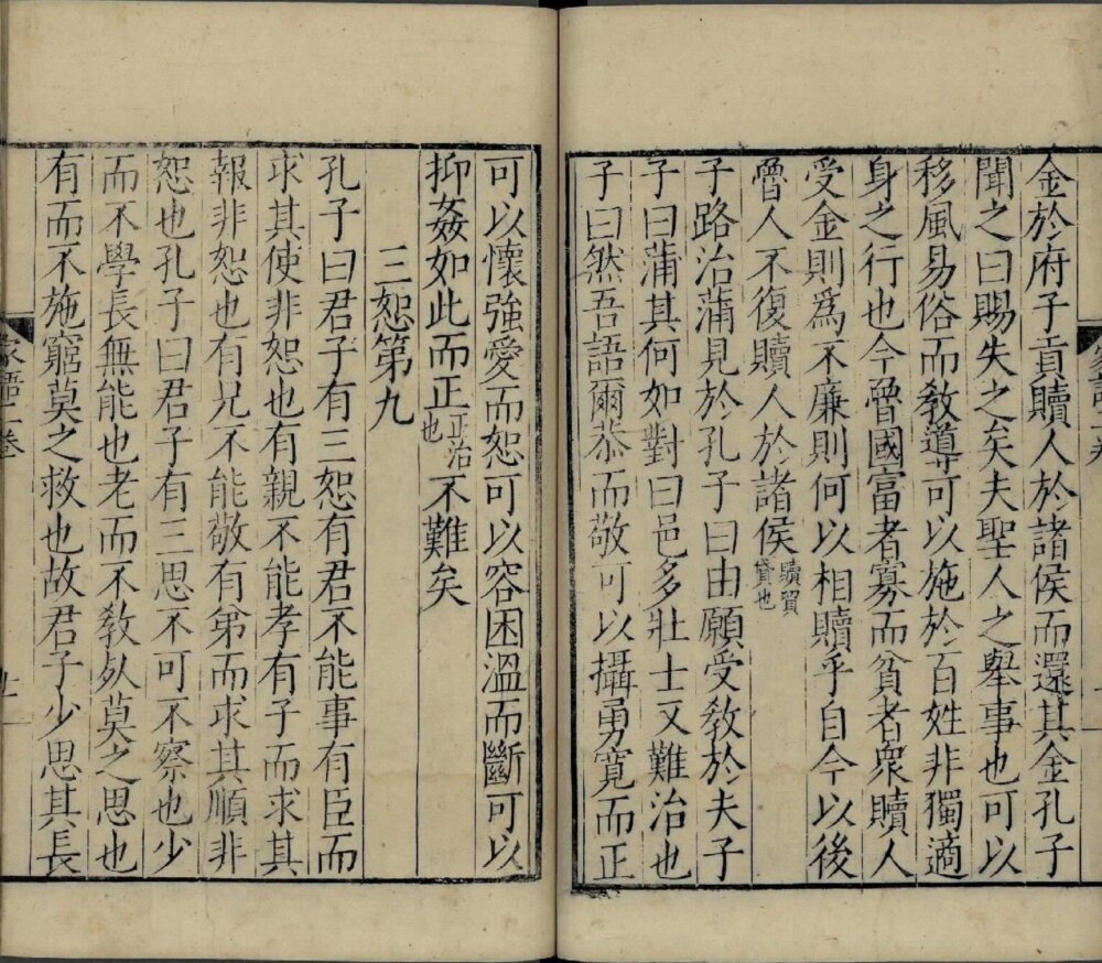 四册,框 22.8x17.8 厘米,九行行十七字,左右双栏,版心黑口,中缝中记家语第几及叶次