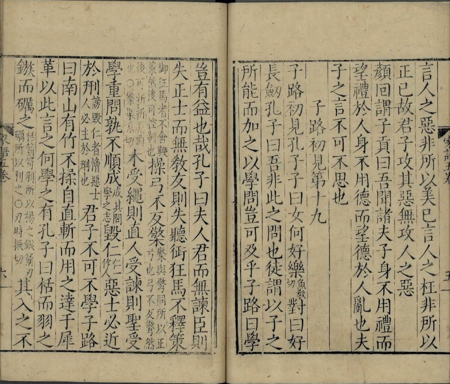 框 18.8x12.6 厘米,九行行十六字,小字双行,行二十一字。左右双栏,版心白口,单鱼尾,中缝中记家语几卷及叶次,下记刻工名 [2] 刻工名:章掖、章右之(右之)、方瑞先(方、瑞先)