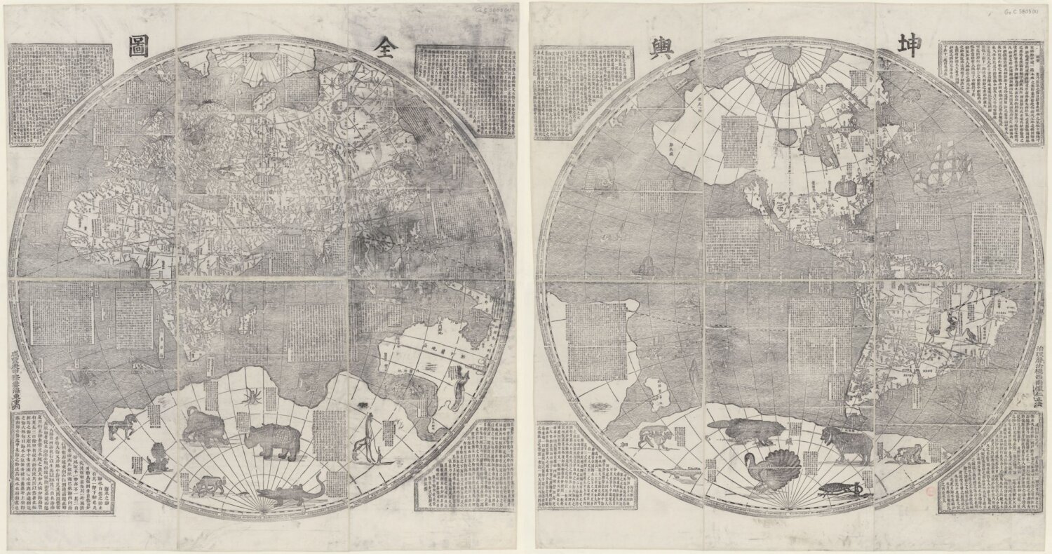 由于地理大发现之故,明末清初耶稣会传教士陆陆续续地来到中国。透过多次的地图绘制,他们带来了当时(十七世纪初)最新的世界地理观念。《坤舆全图》完成于康熙十三年(1674),正是比利时耶稣会教士南怀仁向康熙皇帝解说当时西方世界地理知识的工具。