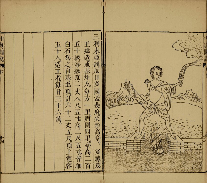 下卷载国外诸国城池山川风土物产,分亚细亚、欧罗巴、利未亚(即非洲)、南北阿墨利加(美洲)五大洲,附珍禽异兽图说 25 幅,而终之以西洋七奇图说,及其与人文地理之关系,颇可增广当年国人之 “异闻” 。