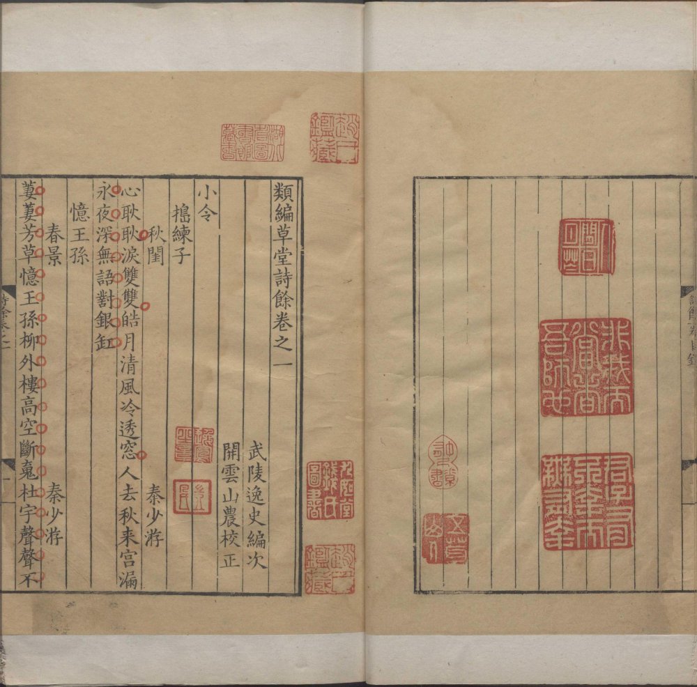 关于《草堂诗余》的著录,最早见于南宋藏书家陈振孙《直斋书录解题》:“《草堂诗余》二卷。” 又小字注:“书坊编辑者。” 南宋书坊编辑的《草堂诗余》二卷虽然早佚,但是后来版本林立,经过多家续补增修,形成以事物分类编的 “分类本” 和以词调为序编的 “分调本” 两大源流。在众多版本的《草堂诗馀》中,明嘉靖间顾从敬大胆改编增补出来的分调本《类编草堂诗馀》,适应了词已变成 “律诗之一种” 这个现实,受到文人欢迎,大行于世。在 “分调本” 系统中有着开创之功,有着重要的学术价值。其后有万历昆石山人本,万历李廷机刊本,沈际飞本,金溪胡桂芳本,汲古阁《词苑英华》本,乌程闵氏朱墨本……(介绍参考)