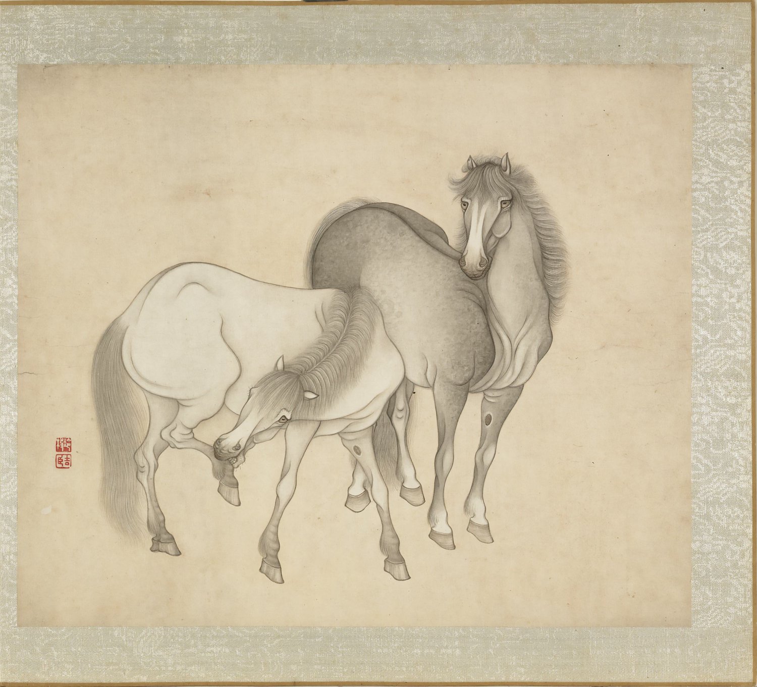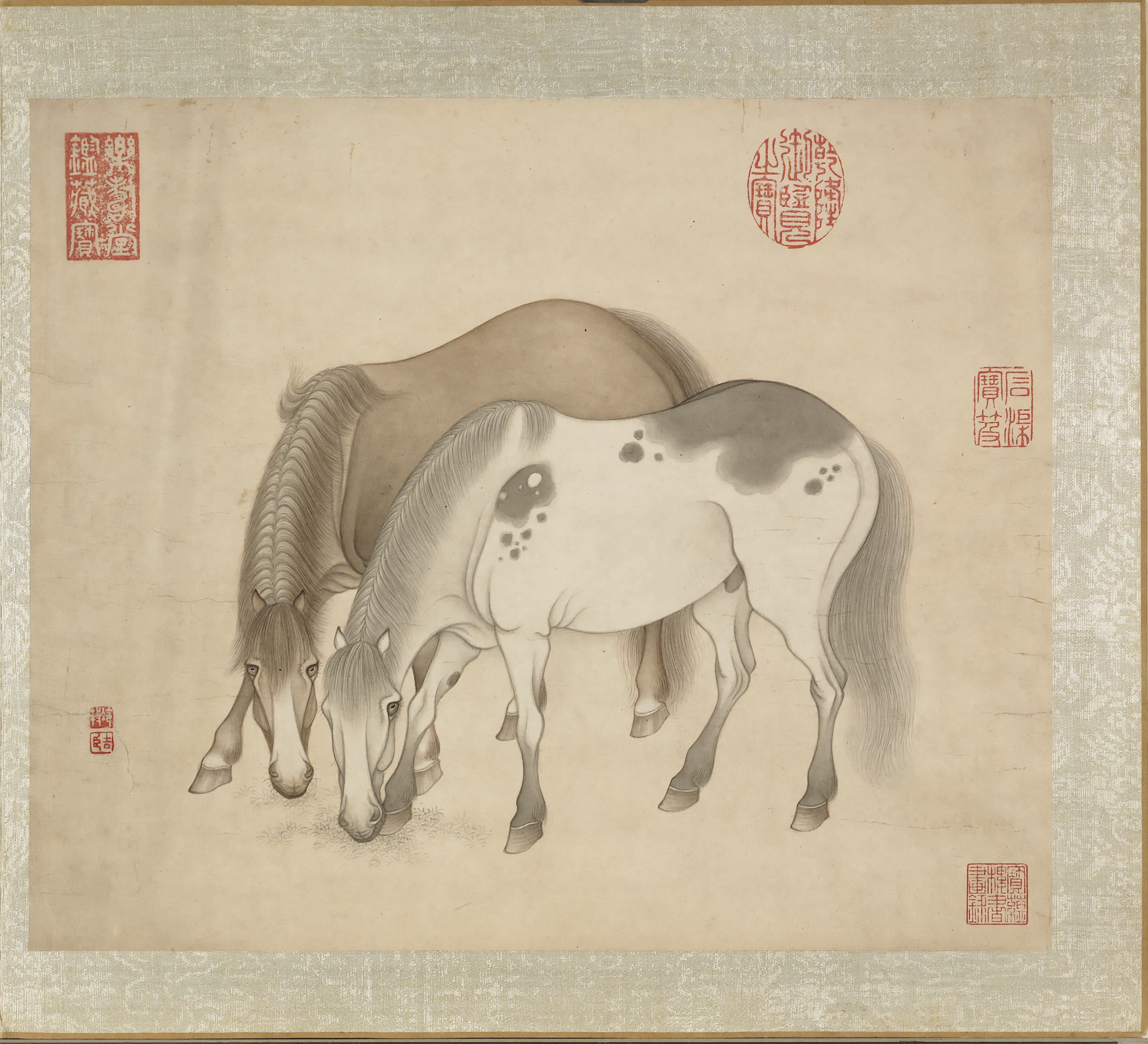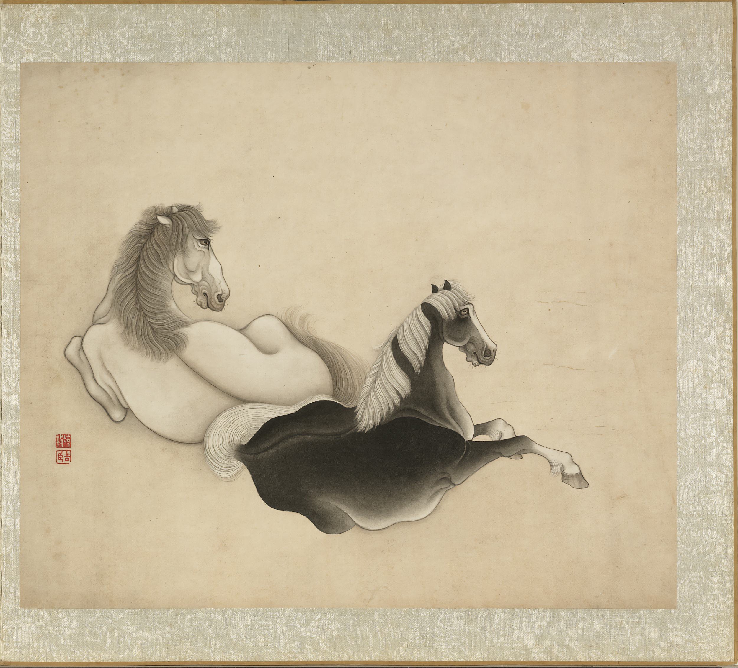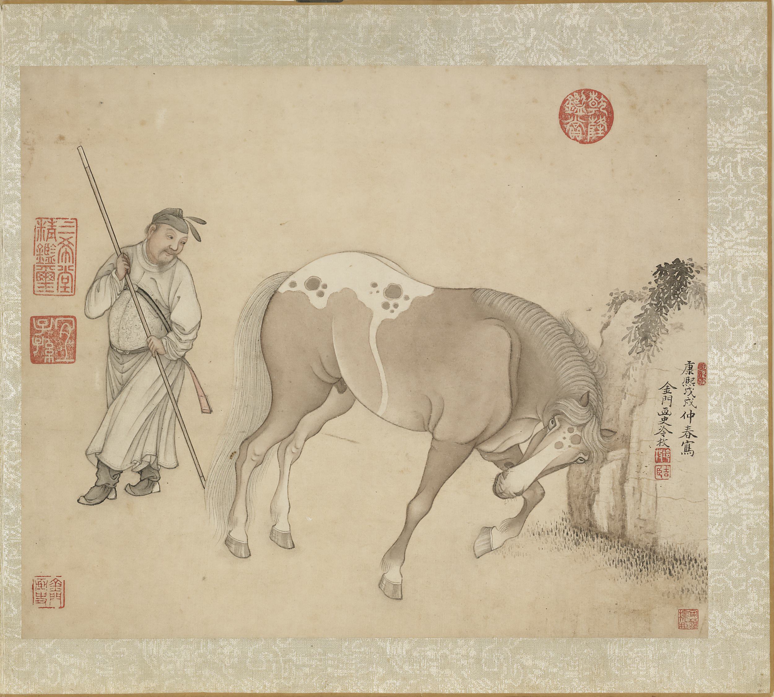 此《冷枚画马》册为清代冷枚所作,共八开,汇集传统马画的多种姿态:翻滚、啮草、理毛、休憩、奔驰、擦痒等,力求呈现马匹动与静的丰富情态。画家以劲细墨线勾勒形体,再施层次分明的墨色晕染,笔致工稳,墨法清雅。此册绘制于清康熙五十七年,现藏台北故宫博物院。