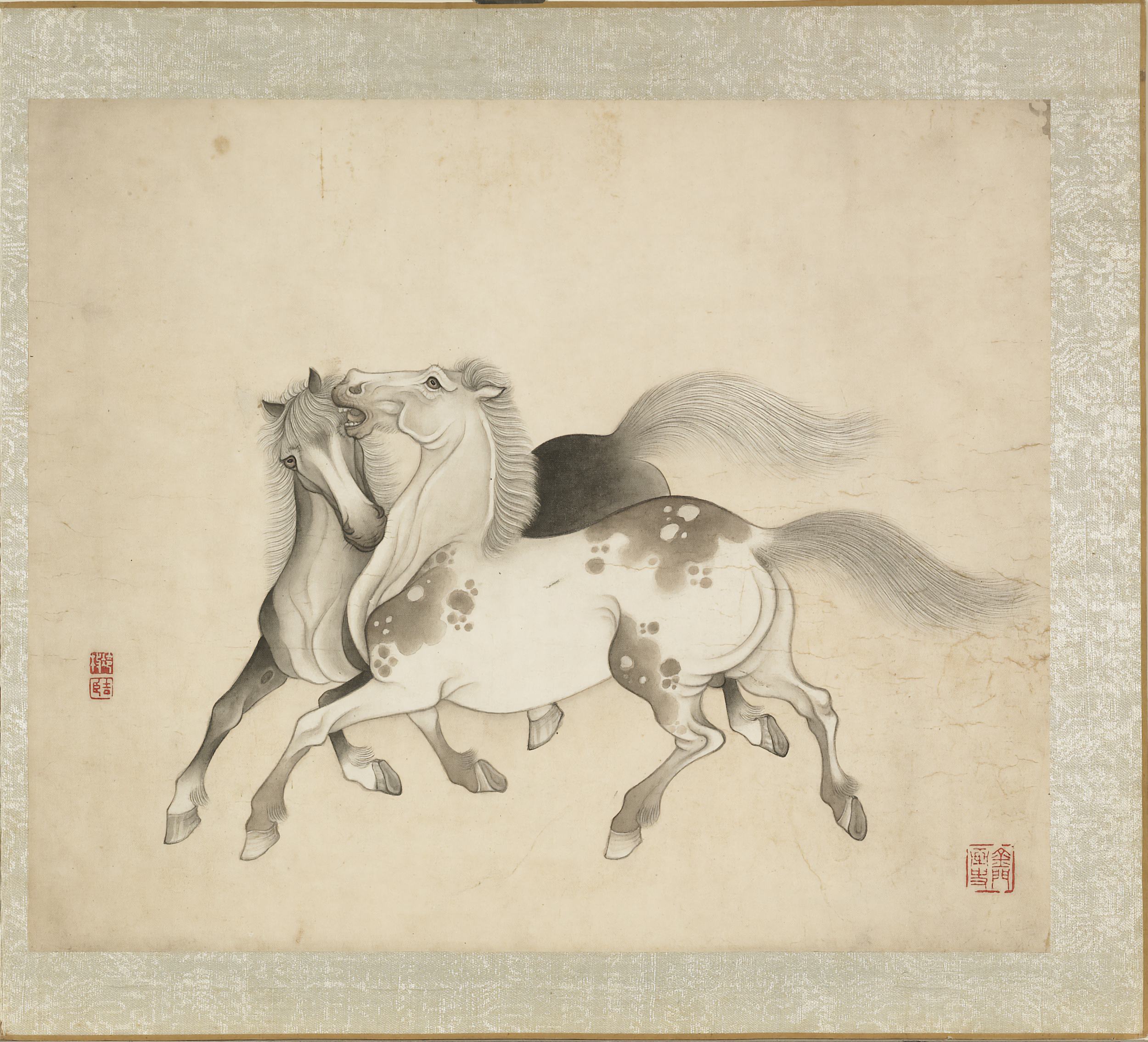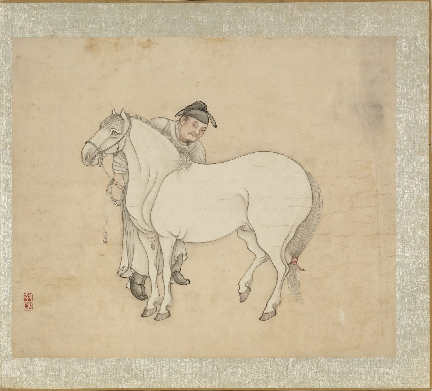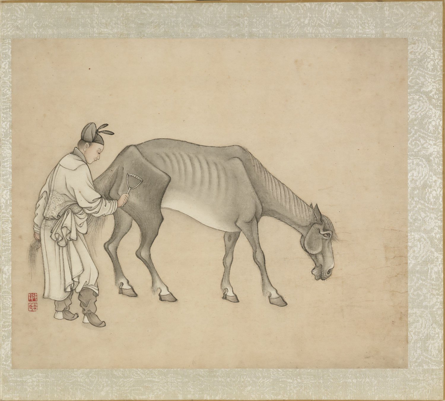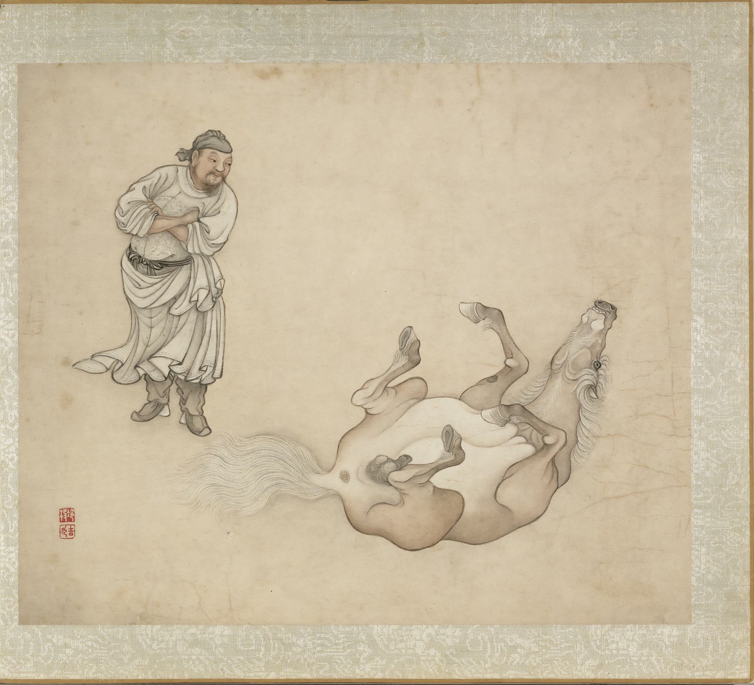 此《冷枚画马》册为清代冷枚所作,共八开,汇集传统马画的多种姿态:翻滚、啮草、理毛、休憩、奔驰、擦痒等,力求呈现马匹动与静的丰富情态。画家以劲细墨线勾勒形体,再施层次分明的墨色晕染,笔致工稳,墨法清雅。此册绘制于清康熙五十七年,现藏台北故宫博物院。