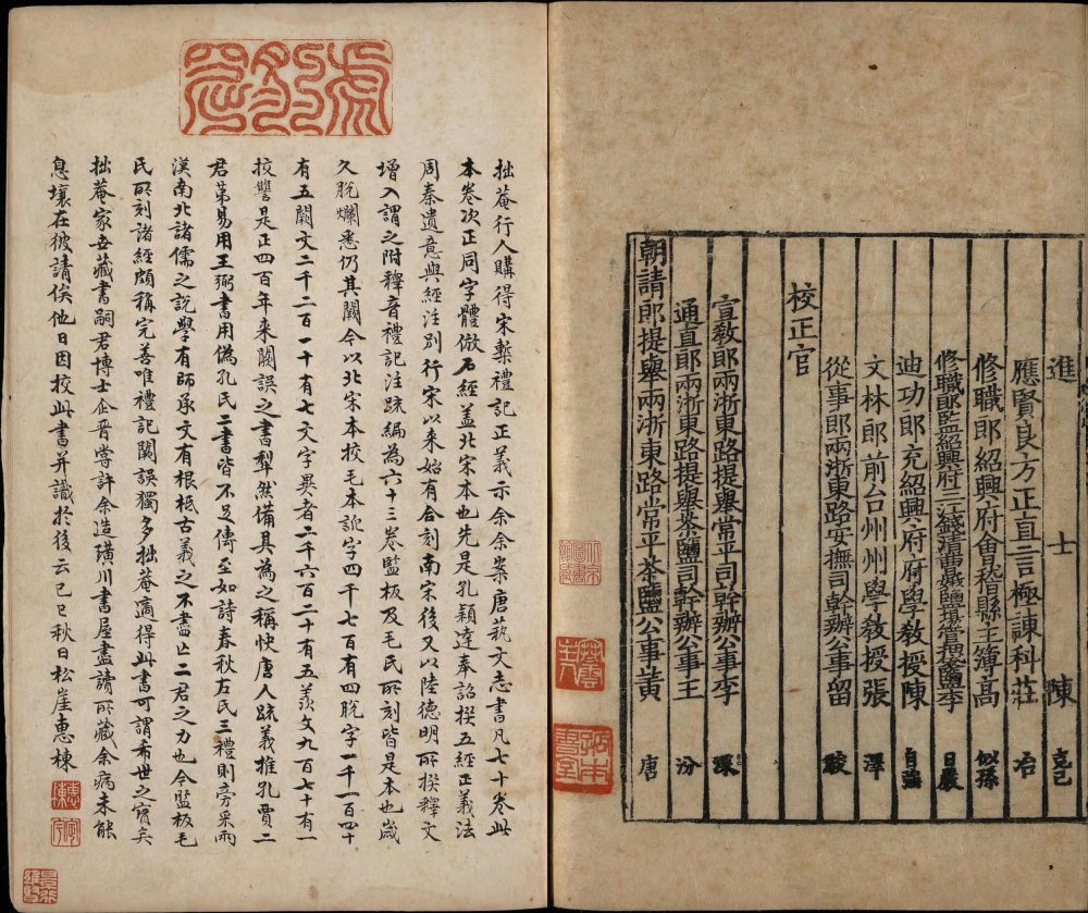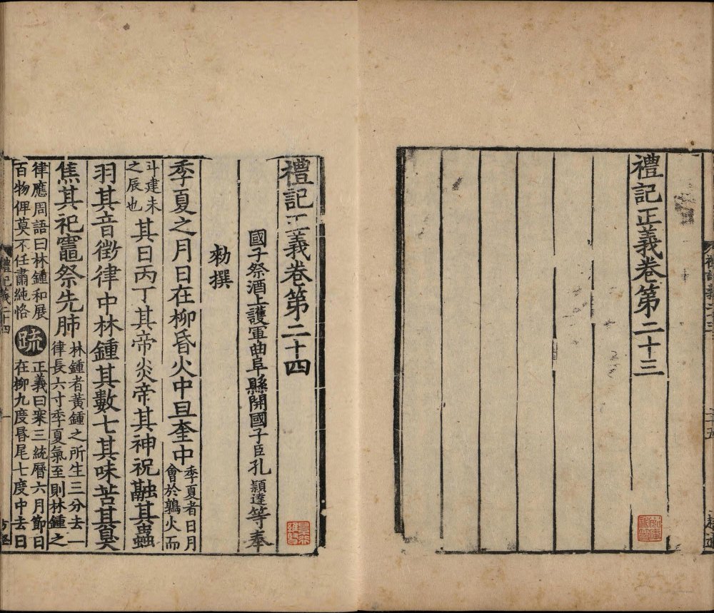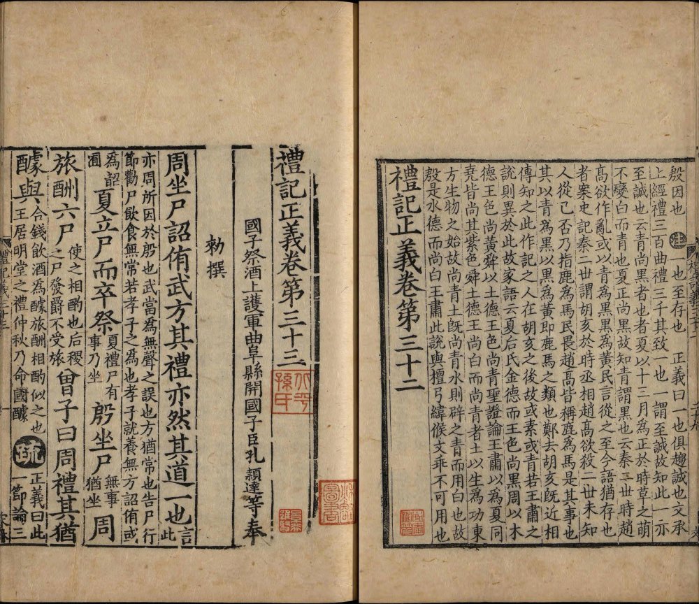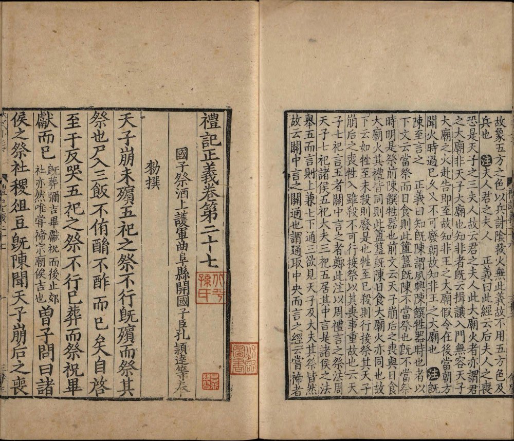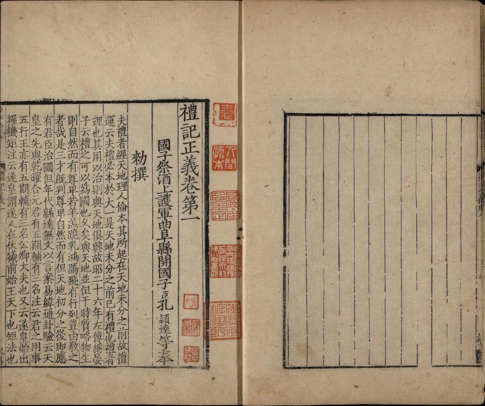 此书是孔颖达等人受唐太宗之命编撰的《五经正义》中的一部。其整合了东汉郑玄注及南朝皇侃、北朝熊安生旧疏,是唐初《礼记》阐释集大成的著作,也是唐代《礼记》解释的官方标准,在成书后即成为科举考试的依据。存世最早的经疏合刻本便是此南宋绍熙三年两浙东路茶盐司黄唐刊本(此书半页八行,被称作 “八行本”;因刻于绍兴,世称越州本或称越州八行本)。