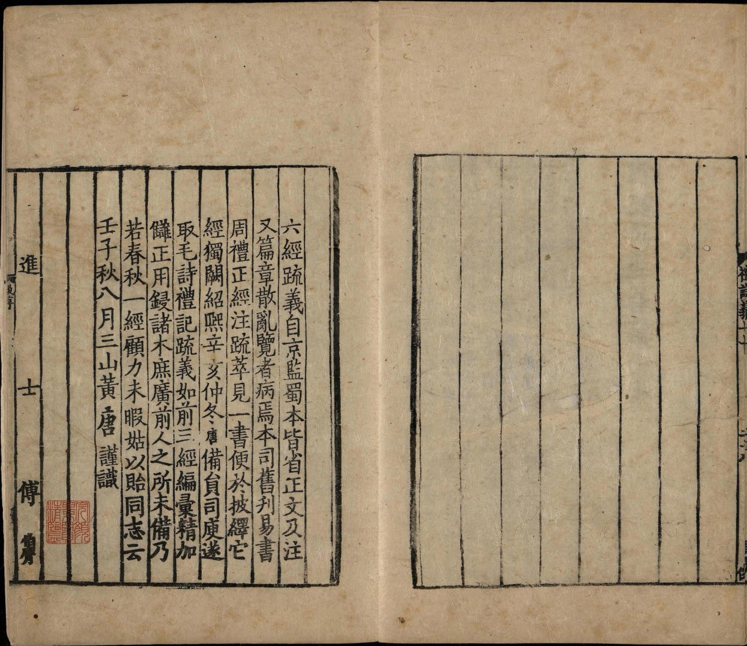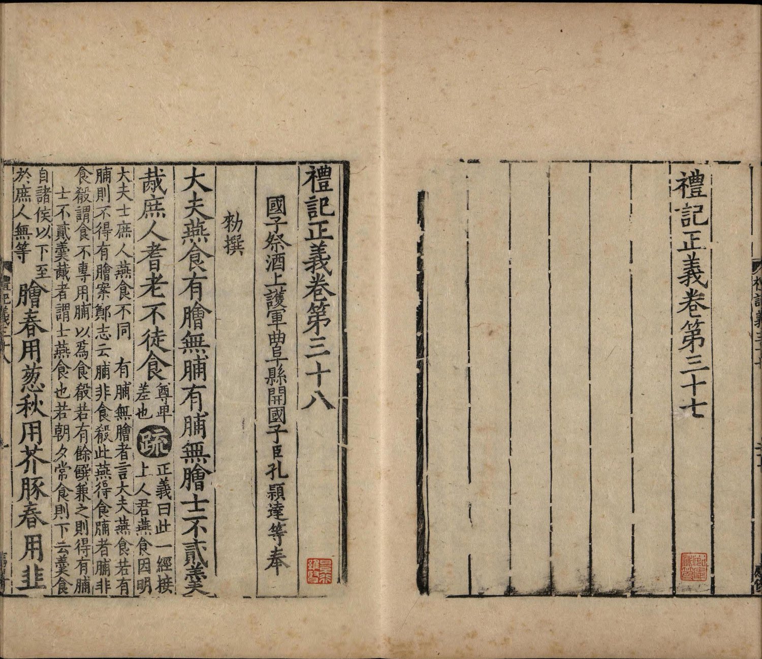 此书是孔颖达等人受唐太宗之命编撰的《五经正义》中的一部。其整合了东汉郑玄注及南朝皇侃、北朝熊安生旧疏,是唐初《礼记》阐释集大成的著作,也是唐代《礼记》解释的官方标准,在成书后即成为科举考试的依据。存世最早的经疏合刻本便是此南宋绍熙三年两浙东路茶盐司黄唐刊本(此书半页八行,被称作 “八行本”;因刻于绍兴,世称越州本或称越州八行本)。