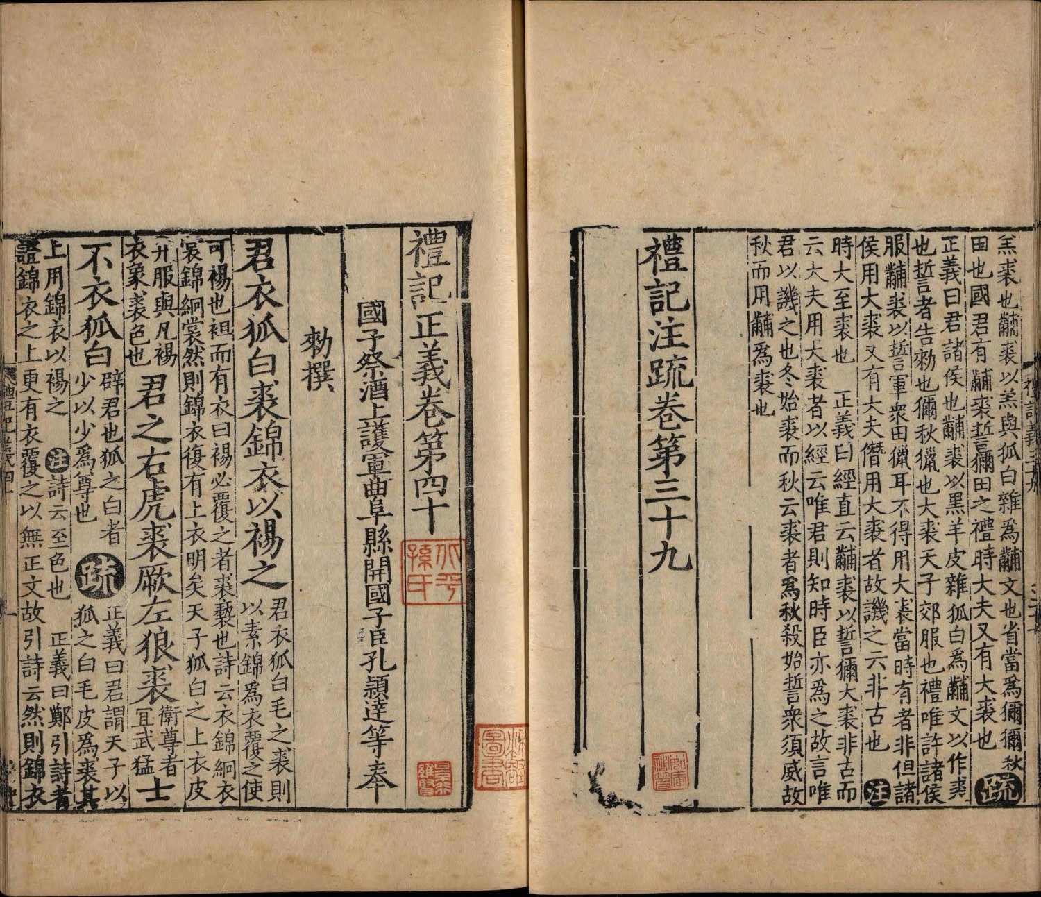 越刻八行本《礼记正义》有数部存世,多残缺严重,比较完整者有两部:一部 (此本)今藏中国国家图书馆,即上述潘宗周旧藏本,有元时刻工修补 [1] 原刊字体方严端重,刻工有马祖、马松、马春、毛端、方伯、王恭、李宪等多人,补版刻工有茅文龙、蒋佛老、何、俞声、何庆、陈等,皆元代杭州地区刻工,可知补版到元代 叶 (据李致忠考证),卷末有惠栋、李盛铎、袁克文等跋;另一部今藏日本足利学校,缺卷三十三至卷四十,此本刷印时间早于国图藏本,修补叶皆在宋代 (阿部隆一)。