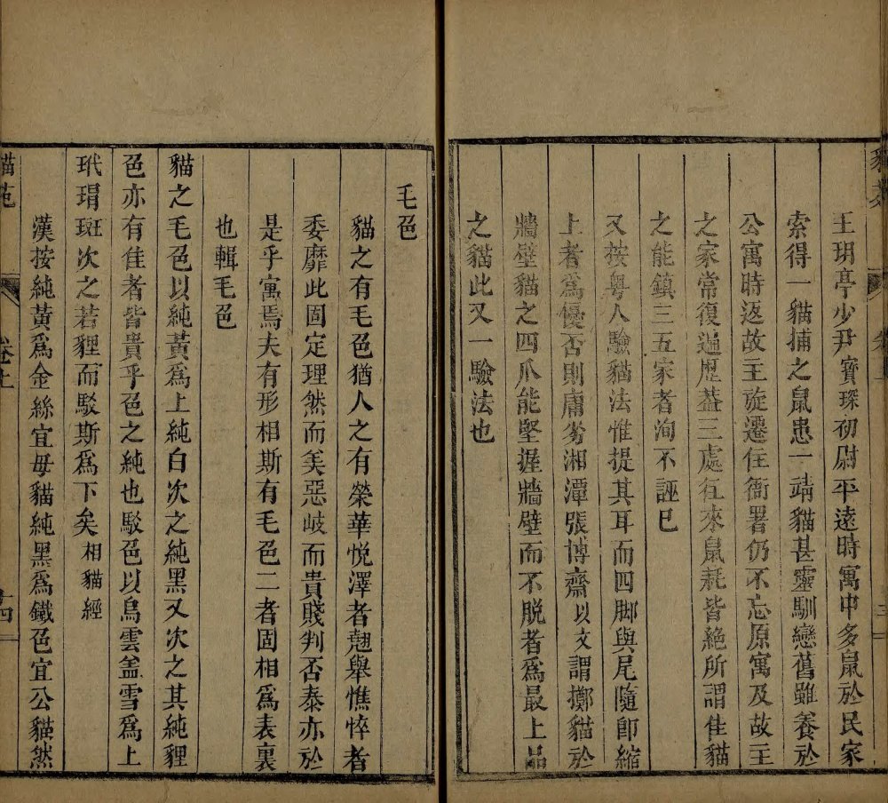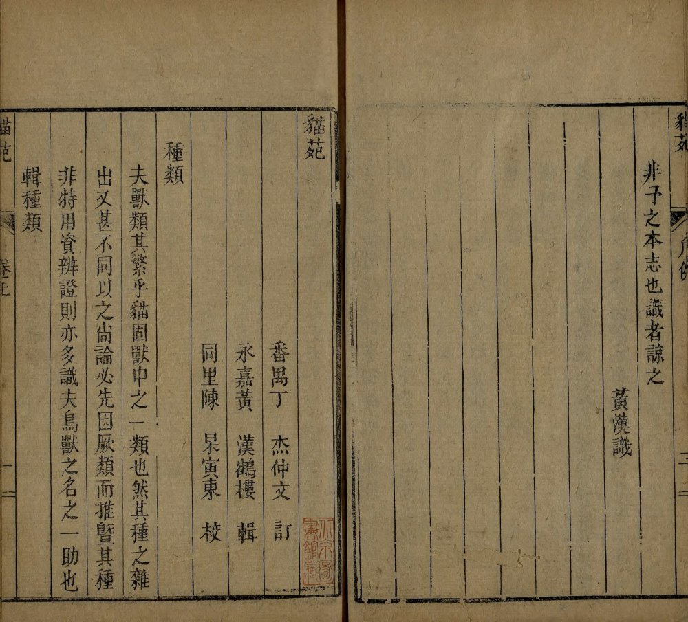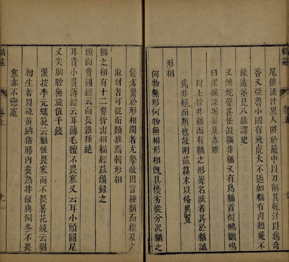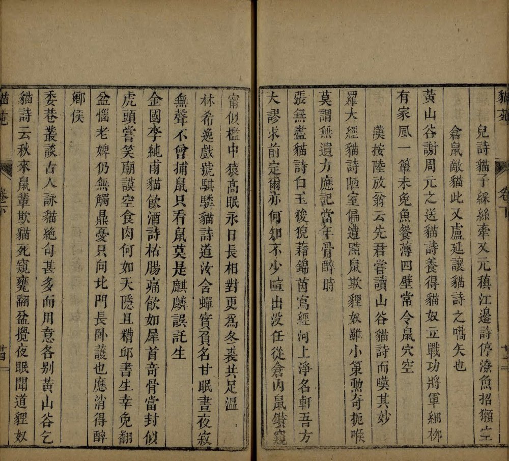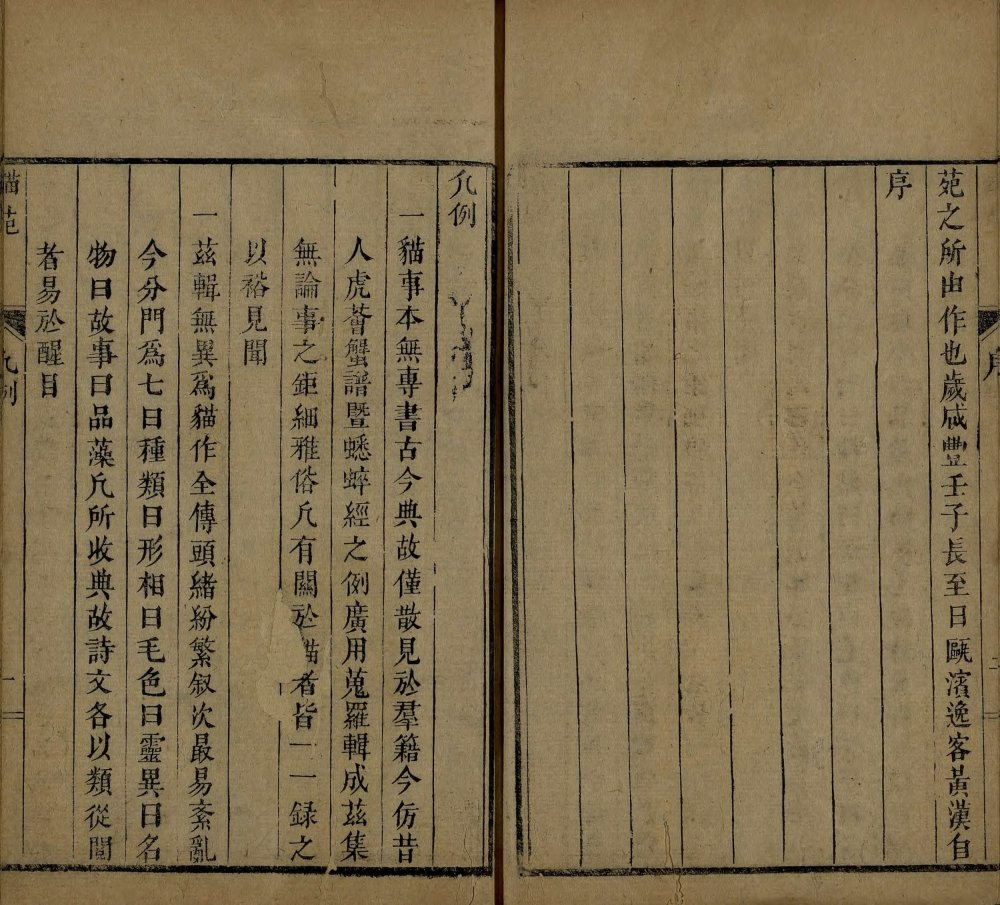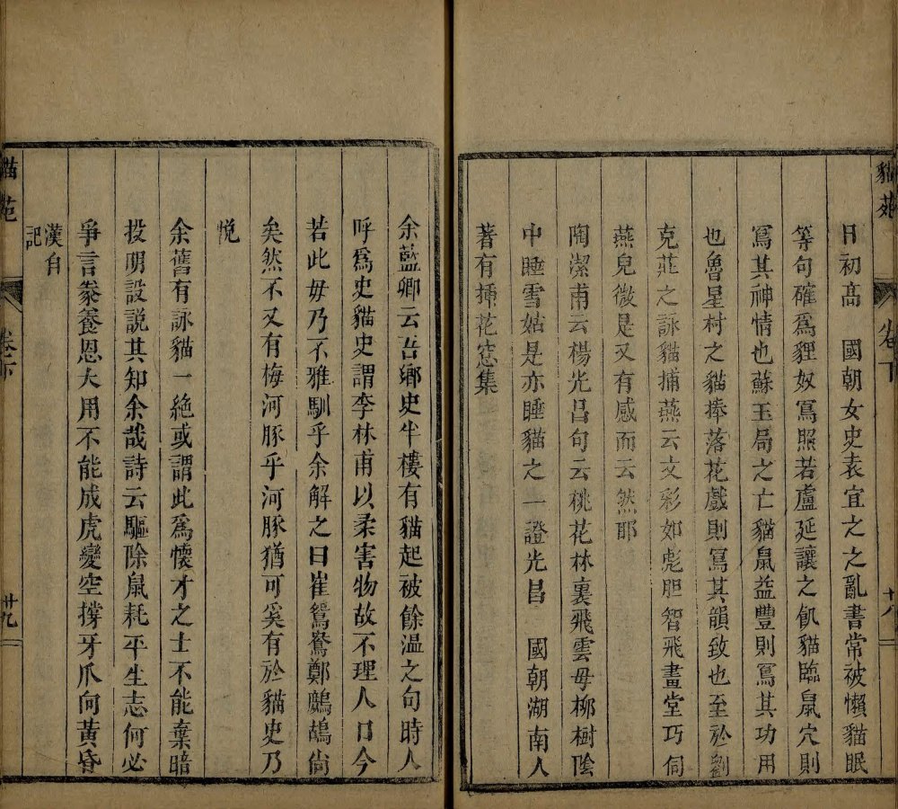 此《猫苑》为清代黄汉撰著。全书上下两卷,内容分为种类、形象、毛色、灵异、名物、故事、品藻七门,并附有补遗。作者广为搜求史籍与见闻,汇集历代关于猫的典故、饲养习俗与诗词逸事,书中多附其按语。此为清咸丰时期(瓮雪草堂藏板)刊本。