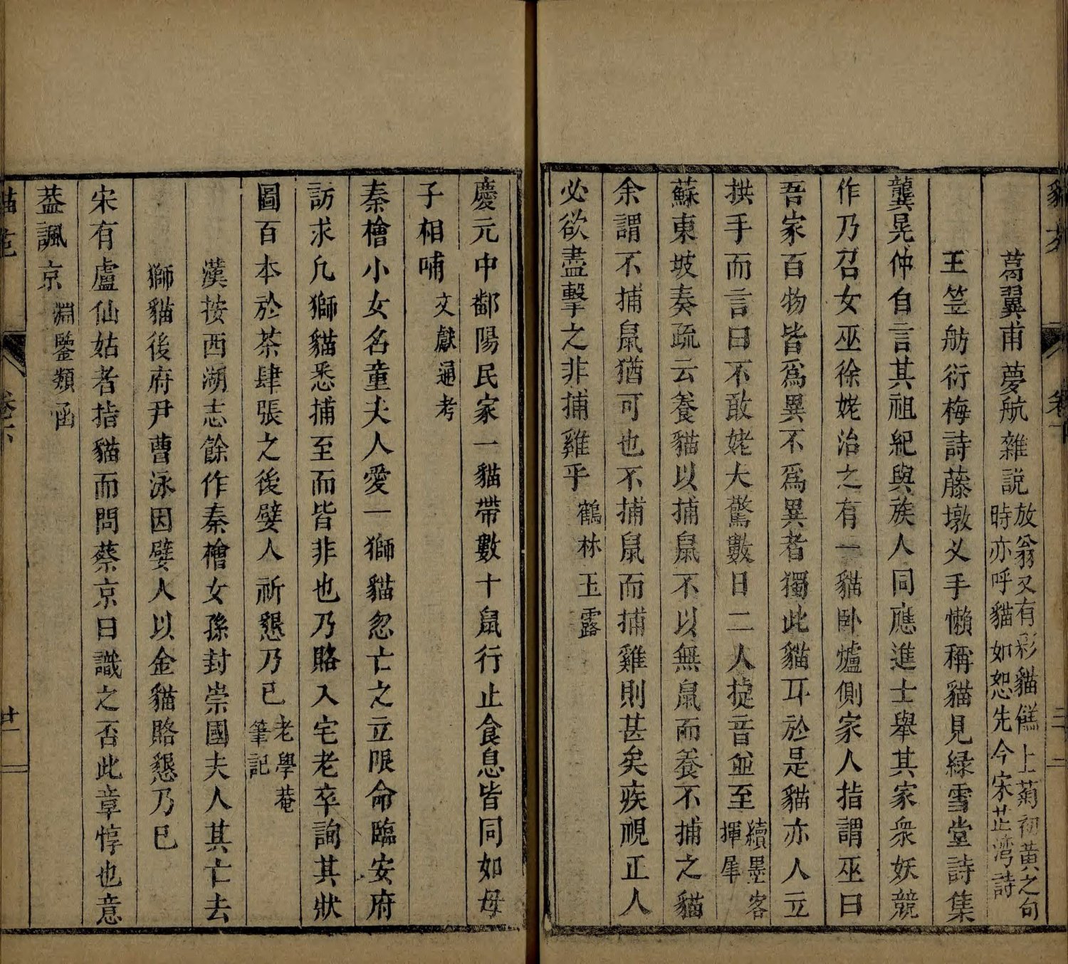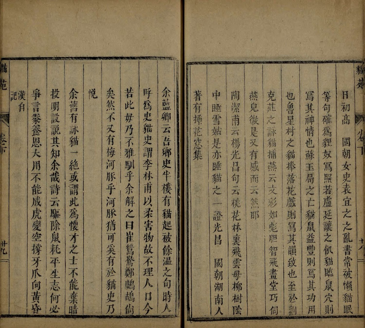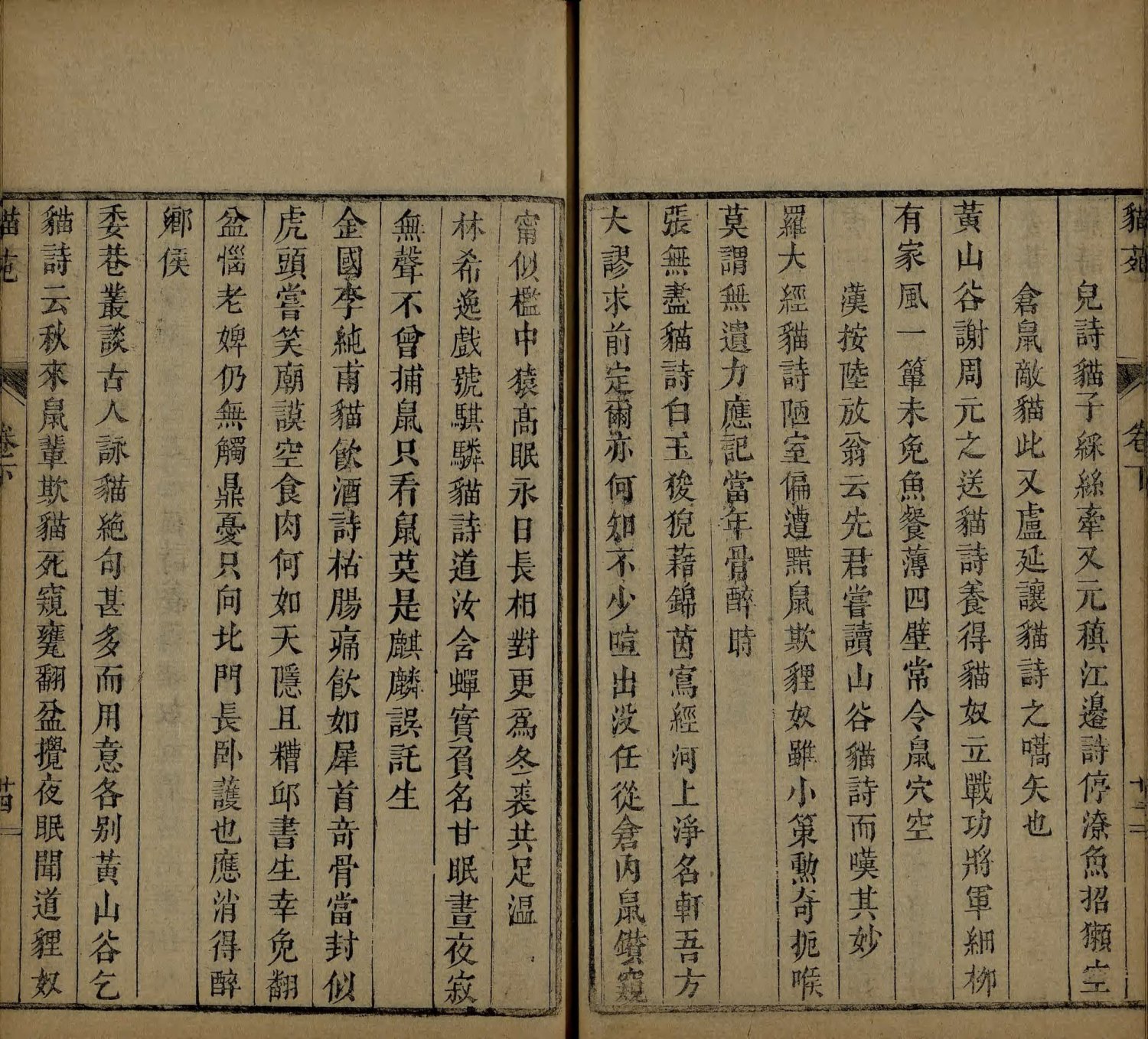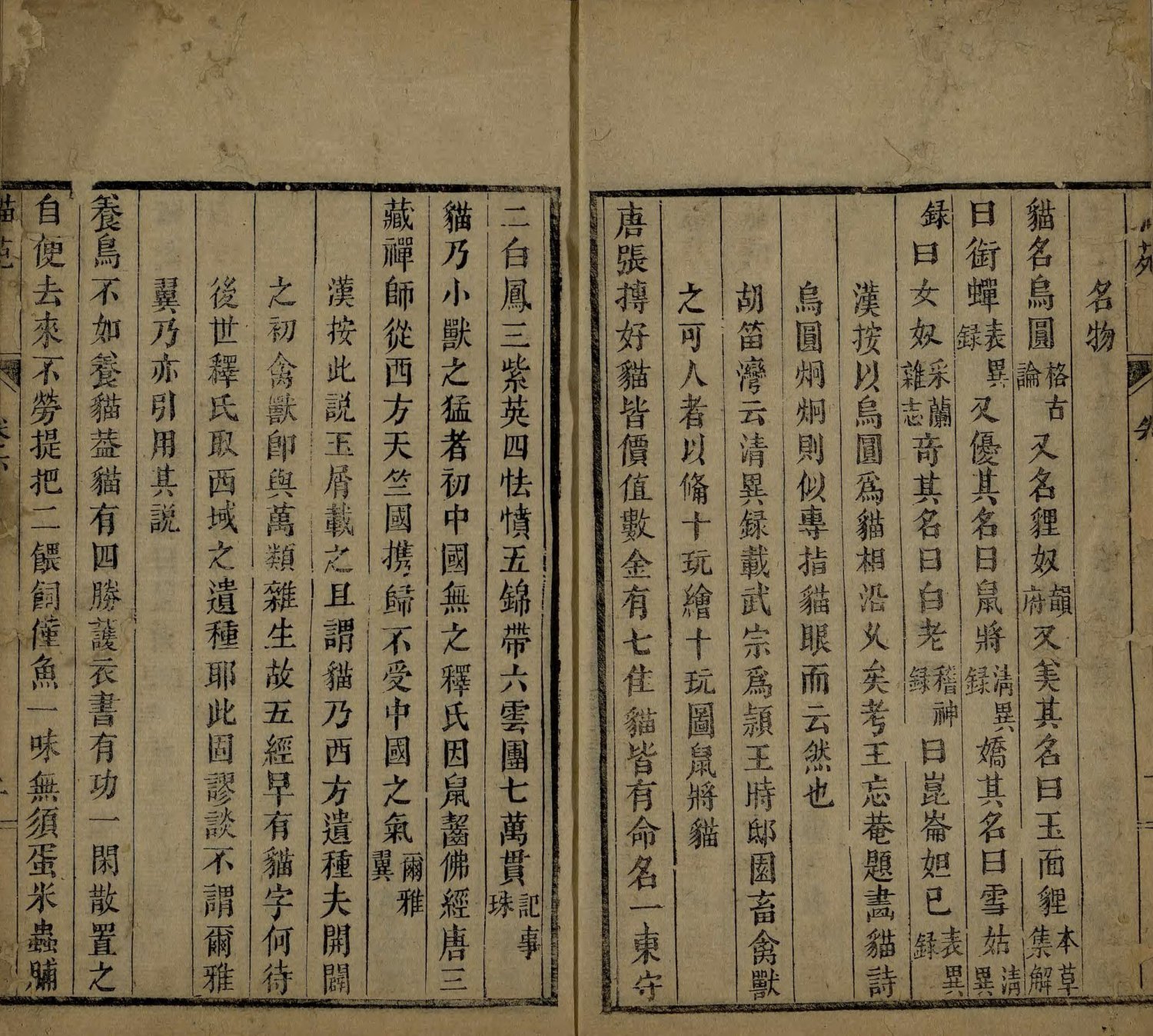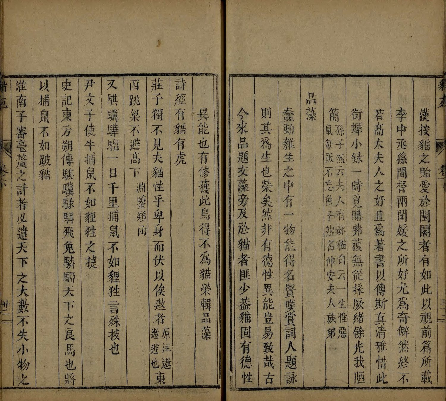 此《猫苑》为清代黄汉撰著。全书上下两卷,内容分为种类、形象、毛色、灵异、名物、故事、品藻七门,并附有补遗。作者广为搜求史籍与见闻,汇集历代关于猫的典故、饲养习俗与诗词逸事,书中多附其按语。此为清咸丰时期(瓮雪草堂藏板)刊本。